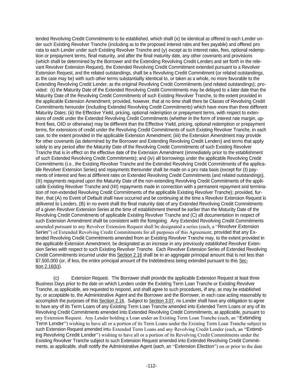 -112- tended Revolving Credit Commitments to be established, which shall (x) be identical as offered to each Lender un- der such Existing Revolver Tranche (including as to the proposed interest rates and fees payable) and offered pro rata to each Lender under such Existing Revolver Tranche and (y) except as to interest rates, fees, optional redemp- tion or prepayment terms, final maturity, and after the final maturity date, any other covenants and provisions (which shall be determined by the Borrower and the Extending Revolving Credit Lenders and set forth in the rele- vant Revolver Extension Request), the Extended Revolving Credit Commitment extended pursuant to a Revolver Extension Request, and the related outstandings, shall be a Revolving Credit Commitment (or related outstandings, as the case may be) with such other terms substantially identical to, or taken as a whole, no more favorable to the Extending Revolving Credit Lender, as the original Revolving Credit Commitments (and related outstandings); pro- vided: (i) the Maturity Date of the Extended Revolving Credit Commitments may be delayed to a later date than the Maturity Date of the Revolving Credit Commitments of such Existing Revolver Tranche, to the extent provided in the applicable Extension Amendment; provided, however, that at no time shall there be Classes of Revolving Credit Commitments hereunder (including Extended Revolving Credit Commitments) which have more than three different Maturity Dates; (ii) the Effective Yield, pricing, optional redemption or prepayment terms, with respect to exten- sions of credit under the Extended Revolving Credit Commitments (whether in the form of interest rate margin, up- front fees, OID or otherwise) may be different than the Effective Yield, pricing, optional redemption or prepayment terms, for extensions of credit under the Revolving Credit Commitments of such Existing Revolver Tranche, in each case, to the extent provided in the applicable Extension Amendment; (iii) the Extension Amendment may provide for other covenants (as determined by the Borrower and Extending Revolving Credit Lenders) and terms that apply solely to any period after the Maturity Date of the Revolving Credit Commitments of such Existing Revolver Tranche that is in effect on the effective date of the Extension Amendment (immediately prior to the establishment of such Extended Revolving Credit Commitments); and (iv) all borrowings under the applicable Revolving Credit Commitments (i.e., the Existing Revolver Tranche and the Extended Revolving Credit Commitments of the applica- ble Revolver Extension Series) and repayments thereunder shall be made on a pro rata basis (except for (I) pay- ments of interest and fees at different rates on Extended Revolving Credit Commitments (and related outstandings), (II) repayments required upon the Maturity Date of the non-extending Revolving Credit Commitments of the appli- cable Existing Revolver Tranche and (III) repayments made in connection with a permanent repayment and termina- tion of non-extended Revolving Credit Commitments of the applicable Existing Revolver Tranche); provided, fur- ther, that (A) no Event of Default shall have occurred and be continuing at the time a Revolver Extension Request is delivered to Lenders, (B) in no event shall the final maturity date of any Extended Revolving Credit Commitments of a given Revolver Extension Series at the time of establishment thereof be earlier than the Maturity Date of the Revolving Credit Commitments of applicable Existing Revolver Tranche and (C) all documentation in respect of such Extension Amendment shall be consistent with the foregoing. Any Extended Revolving Credit Commitments amended pursuant to any Revolver Extension Request shall be designated a series (each, a “Revolver Extension Series”) of Extended Revolving Credit Commitments for all purposes of this Agreement; provided that any Ex- tended Revolving Credit Commitments amended from an Existing Revolver Tranche may, to the extent provided in the applicable Extension Amendment, be designated as an increase in any previously established Revolver Exten- sion Series with respect to such Existing Revolver Tranche. Each Revolver Extension Series of Extended Revolving Credit Commitments incurred under this Section 2.16 shall be in an aggregate principal amount that is not less than $7,500,000 (or, if less, the entire principal amount of the Indebtedness being extended pursuant to this Sec- tion 2.16(b)). (c) Extension Request. The Borrower shall provide the applicable Extension Request at least three Business Days prior to the date on which Lenders under the Existing Term Loan Tranche or Existing Revolver Tranche, as applicable, are requested to respond, and shall agree to such procedures, if any, as may be established by, or acceptable to, the Administrative Agent and the Borrower and the Borrower, in each case acting reasonably to accomplish the purposes of this Section 2.16. Subject to Section 3.07, no Lender shall have any obligation to agree to have any of its Term Loans of any Existing Term Loan Tranche amended into Extended Term Loans or any of its Revolving Credit Commitments amended into Extended Revolving Credit Commitments, as applicable, pursuant to any Extension Request. Any Lender holding a Loan under an Existing Term Loan Tranche (each, an “Extending Term Lender”) wishing to have all or a portion of its Term Loans under the Existing Term Loan Tranche subject to such Extension Request amended into Extended Term Loans and any Revolving Credit Lender (each, an “Extend- ing Revolving Credit Lender”) wishing to have all or a portion of its Revolving Credit Commitments under the Existing Revolver Tranche subject to such Extension Request amended into Extended Revolving Credit Commit- ments, as applicable, shall notify the Administrative Agent (each, an “Extension Election”) on or prior to the date