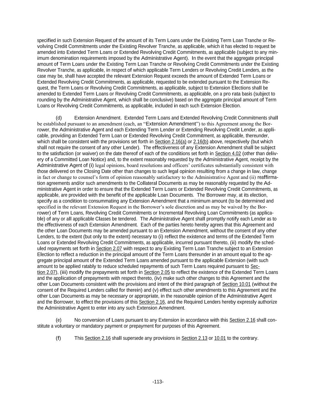 -113- specified in such Extension Request of the amount of its Term Loans under the Existing Term Loan Tranche or Re- volving Credit Commitments under the Existing Revolver Tranche, as applicable, which it has elected to request be amended into Extended Term Loans or Extended Revolving Credit Commitments, as applicable (subject to any min- imum denomination requirements imposed by the Administrative Agent). In the event that the aggregate principal amount of Term Loans under the Existing Term Loan Tranche or Revolving Credit Commitments under the Existing Revolver Tranche, as applicable, in respect of which applicable Term Lenders or Revolving Credit Lenders, as the case may be, shall have accepted the relevant Extension Request exceeds the amount of Extended Term Loans or Extended Revolving Credit Commitments, as applicable, requested to be extended pursuant to the Extension Re- quest, the Term Loans or Revolving Credit Commitments, as applicable, subject to Extension Elections shall be amended to Extended Term Loans or Revolving Credit Commitments, as applicable, on a pro rata basis (subject to rounding by the Administrative Agent, which shall be conclusive) based on the aggregate principal amount of Term Loans or Revolving Credit Commitments, as applicable, included in each such Extension Election. (d) Extension Amendment. Extended Term Loans and Extended Revolving Credit Commitments shall be established pursuant to an amendment (each, an “Extension Amendment”) to this Agreement among the Bor- rower, the Administrative Agent and each Extending Term Lender or Extending Revolving Credit Lender, as appli- cable, providing an Extended Term Loan or Extended Revolving Credit Commitment, as applicable, thereunder, which shall be consistent with the provisions set forth in Section 2.16(a) or 2.16(b) above, respectively (but which shall not require the consent of any other Lender). The effectiveness of any Extension Amendment shall be subject to the satisfaction (or waiver) on the date thereof of each of the conditions set forth in Section 4.02 (other than deliv- ery of a Committed Loan Notice) and, to the extent reasonably requested by the Administrative Agent, receipt by the Administrative Agent of (i) legal opinions, board resolutions and officers’ certificates substantially consistent with those delivered on the Closing Date other than changes to such legal opinion resulting from a change in law, change in fact or change to counsel’s form of opinion reasonably satisfactory to the Administrative Agent and (ii) reaffirma- tion agreements and/or such amendments to the Collateral Documents as may be reasonably requested by the Ad- ministrative Agent in order to ensure that the Extended Term Loans or Extended Revolving Credit Commitments, as applicable, are provided with the benefit of the applicable Loan Documents. The Borrower may, at its election, specify as a condition to consummating any Extension Amendment that a minimum amount (to be determined and specified in the relevant Extension Request in the Borrower’s sole discretion and as may be waived by the Bor- rower) of Term Loans, Revolving Credit Commitments or Incremental Revolving Loan Commitments (as applica- ble) of any or all applicable Classes be tendered. The Administrative Agent shall promptly notify each Lender as to the effectiveness of each Extension Amendment. Each of the parties hereto hereby agrees that this Agreement and the other Loan Documents may be amended pursuant to an Extension Amendment, without the consent of any other Lenders, to the extent (but only to the extent) necessary to (i) reflect the existence and terms of the Extended Term Loans or Extended Revolving Credit Commitments, as applicable, incurred pursuant thereto, (ii) modify the sched- uled repayments set forth in Section 2.07 with respect to any Existing Term Loan Tranche subject to an Extension Election to reflect a reduction in the principal amount of the Term Loans thereunder in an amount equal to the ag- gregate principal amount of the Extended Term Loans amended pursuant to the applicable Extension (with such amount to be applied ratably to reduce scheduled repayments of such Term Loans required pursuant to Sec- tion 2.07), (iii) modify the prepayments set forth in Section 2.05 to reflect the existence of the Extended Term Loans and the application of prepayments with respect thereto, (iv) make such other changes to this Agreement and the other Loan Documents consistent with the provisions and intent of the third paragraph of Section 10.01 (without the consent of the Required Lenders called for therein) and (v) effect such other amendments to this Agreement and the other Loan Documents as may be necessary or appropriate, in the reasonable opinion of the Administrative Agent and the Borrower, to effect the provisions of this Section 2.16, and the Required Lenders hereby expressly authorize the Administrative Agent to enter into any such Extension Amendment. (e) No conversion of Loans pursuant to any Extension in accordance with this Section 2.16 shall con- stitute a voluntary or mandatory payment or prepayment for purposes of this Agreement. (f) This Section 2.16 shall supersede any provisions in Section 2.13 or 10.01 to the contrary.
