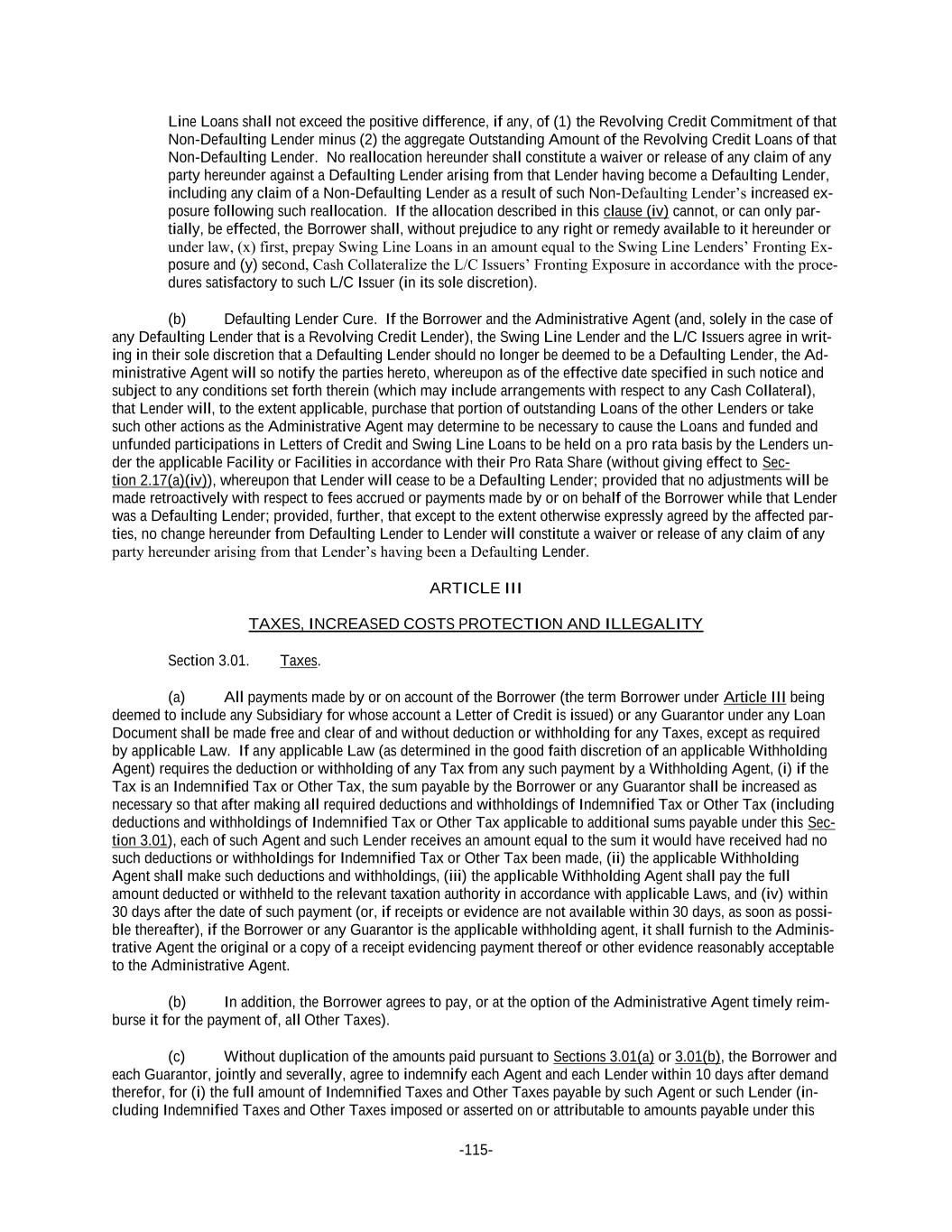 -115- Line Loans shall not exceed the positive difference, if any, of (1) the Revolving Credit Commitment of that Non-Defaulting Lender minus (2) the aggregate Outstanding Amount of the Revolving Credit Loans of that Non-Defaulting Lender. No reallocation hereunder shall constitute a waiver or release of any claim of any party hereunder against a Defaulting Lender arising from that Lender having become a Defaulting Lender, including any claim of a Non-Defaulting Lender as a result of such Non-Defaulting Lender’s increased ex- posure following such reallocation. If the allocation described in this clause (iv) cannot, or can only par- tially, be effected, the Borrower shall, without prejudice to any right or remedy available to it hereunder or under law, (x) first, prepay Swing Line Loans in an amount equal to the Swing Line Lenders’ Fronting Ex- posure and (y) second, Cash Collateralize the L/C Issuers’ Fronting Exposure in accordance with the proce- dures satisfactory to such L/C Issuer (in its sole discretion). (b) Defaulting Lender Cure. If the Borrower and the Administrative Agent (and, solely in the case of any Defaulting Lender that is a Revolving Credit Lender), the Swing Line Lender and the L/C Issuers agree in writ- ing in their sole discretion that a Defaulting Lender should no longer be deemed to be a Defaulting Lender, the Ad- ministrative Agent will so notify the parties hereto, whereupon as of the effective date specified in such notice and subject to any conditions set forth therein (which may include arrangements with respect to any Cash Collateral), that Lender will, to the extent applicable, purchase that portion of outstanding Loans of the other Lenders or take such other actions as the Administrative Agent may determine to be necessary to cause the Loans and funded and unfunded participations in Letters of Credit and Swing Line Loans to be held on a pro rata basis by the Lenders un- der the applicable Facility or Facilities in accordance with their Pro Rata Share (without giving effect to Sec- tion 2.17(a)(iv)), whereupon that Lender will cease to be a Defaulting Lender; provided that no adjustments will be made retroactively with respect to fees accrued or payments made by or on behalf of the Borrower while that Lender was a Defaulting Lender; provided, further, that except to the extent otherwise expressly agreed by the affected par- ties, no change hereunder from Defaulting Lender to Lender will constitute a waiver or release of any claim of any party hereunder arising from that Lender’s having been a Defaulting Lender. ARTICLE III TAXES, INCREASED COSTS PROTECTION AND ILLEGALITY Section 3.01. Taxes. (a) All payments made by or on account of the Borrower (the term Borrower under Article III being deemed to include any Subsidiary for whose account a Letter of Credit is issued) or any Guarantor under any Loan Document shall be made free and clear of and without deduction or withholding for any Taxes, except as required by applicable Law. If any applicable Law (as determined in the good faith discretion of an applicable Withholding Agent) requires the deduction or withholding of any Tax from any such payment by a Withholding Agent, (i) if the Tax is an Indemnified Tax or Other Tax, the sum payable by the Borrower or any Guarantor shall be increased as necessary so that after making all required deductions and withholdings of Indemnified Tax or Other Tax (including deductions and withholdings of Indemnified Tax or Other Tax applicable to additional sums payable under this Sec- tion 3.01), each of such Agent and such Lender receives an amount equal to the sum it would have received had no such deductions or withholdings for Indemnified Tax or Other Tax been made, (ii) the applicable Withholding Agent shall make such deductions and withholdings, (iii) the applicable Withholding Agent shall pay the full amount deducted or withheld to the relevant taxation authority in accordance with applicable Laws, and (iv) within 30 days after the date of such payment (or, if receipts or evidence are not available within 30 days, as soon as possi- ble thereafter), if the Borrower or any Guarantor is the applicable withholding agent, it shall furnish to the Adminis- trative Agent the original or a copy of a receipt evidencing payment thereof or other evidence reasonably acceptable to the Administrative Agent. (b) In addition, the Borrower agrees to pay, or at the option of the Administrative Agent timely reim- burse it for the payment of, all Other Taxes). (c) Without duplication of the amounts paid pursuant to Sections 3.01(a) or 3.01(b), the Borrower and each Guarantor, jointly and severally, agree to indemnify each Agent and each Lender within 10 days after demand therefor, for (i) the full amount of Indemnified Taxes and Other Taxes payable by such Agent or such Lender (in- cluding Indemnified Taxes and Other Taxes imposed or asserted on or attributable to amounts payable under this