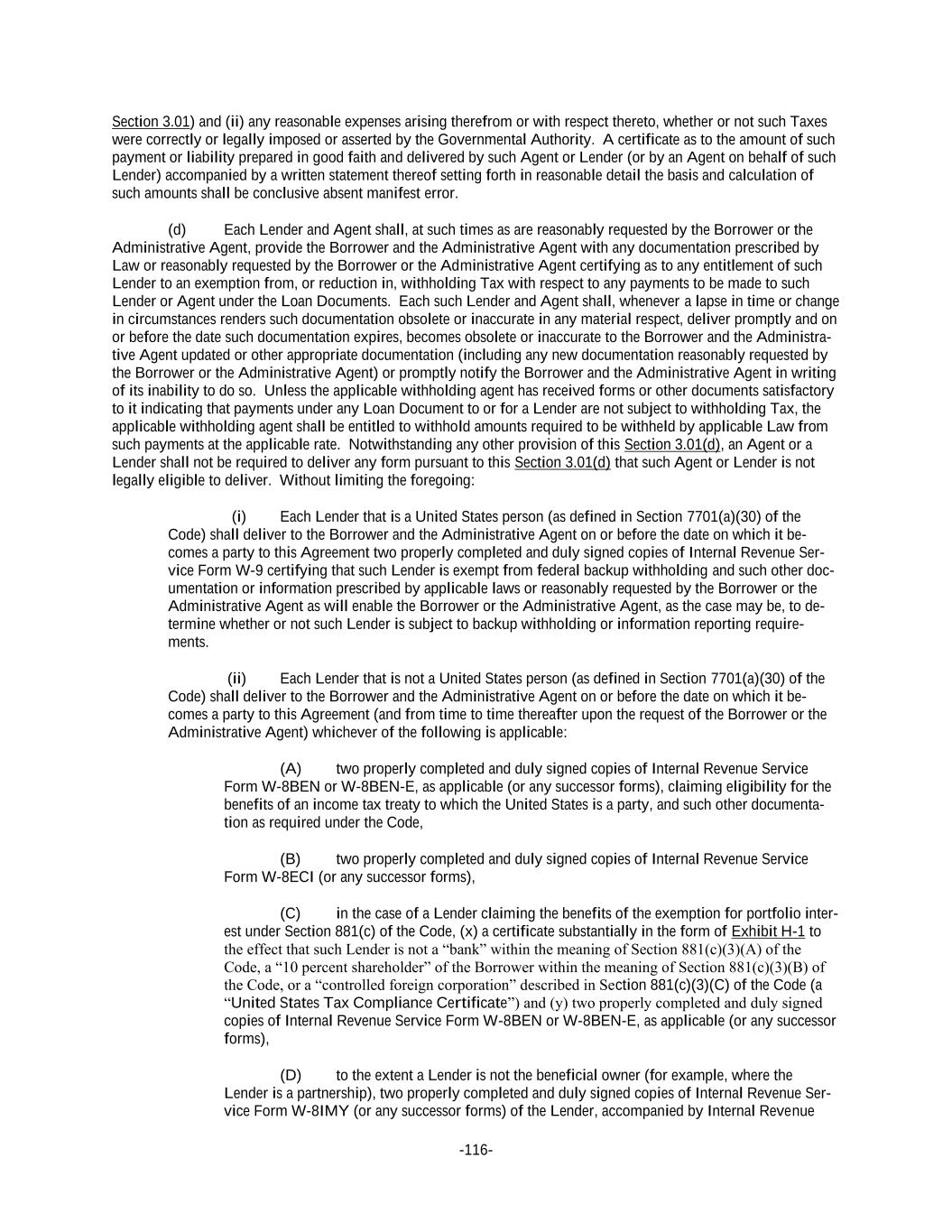 -116- Section 3.01) and (ii) any reasonable expenses arising therefrom or with respect thereto, whether or not such Taxes were correctly or legally imposed or asserted by the Governmental Authority. A certificate as to the amount of such payment or liability prepared in good faith and delivered by such Agent or Lender (or by an Agent on behalf of such Lender) accompanied by a written statement thereof setting forth in reasonable detail the basis and calculation of such amounts shall be conclusive absent manifest error. (d) Each Lender and Agent shall, at such times as are reasonably requested by the Borrower or the Administrative Agent, provide the Borrower and the Administrative Agent with any documentation prescribed by Law or reasonably requested by the Borrower or the Administrative Agent certifying as to any entitlement of such Lender to an exemption from, or reduction in, withholding Tax with respect to any payments to be made to such Lender or Agent under the Loan Documents. Each such Lender and Agent shall, whenever a lapse in time or change in circumstances renders such documentation obsolete or inaccurate in any material respect, deliver promptly and on or before the date such documentation expires, becomes obsolete or inaccurate to the Borrower and the Administra- tive Agent updated or other appropriate documentation (including any new documentation reasonably requested by the Borrower or the Administrative Agent) or promptly notify the Borrower and the Administrative Agent in writing of its inability to do so. Unless the applicable withholding agent has received forms or other documents satisfactory to it indicating that payments under any Loan Document to or for a Lender are not subject to withholding Tax, the applicable withholding agent shall be entitled to withhold amounts required to be withheld by applicable Law from such payments at the applicable rate. Notwithstanding any other provision of this Section 3.01(d), an Agent or a Lender shall not be required to deliver any form pursuant to this Section 3.01(d) that such Agent or Lender is not legally eligible to deliver. Without limiting the foregoing: (i) Each Lender that is a United States person (as defined in Section 7701(a)(30) of the Code) shall deliver to the Borrower and the Administrative Agent on or before the date on which it be- comes a party to this Agreement two properly completed and duly signed copies of Internal Revenue Ser- vice Form W-9 certifying that such Lender is exempt from federal backup withholding and such other doc- umentation or information prescribed by applicable laws or reasonably requested by the Borrower or the Administrative Agent as will enable the Borrower or the Administrative Agent, as the case may be, to de- termine whether or not such Lender is subject to backup withholding or information reporting require- ments. (ii) Each Lender that is not a United States person (as defined in Section 7701(a)(30) of the Code) shall deliver to the Borrower and the Administrative Agent on or before the date on which it be- comes a party to this Agreement (and from time to time thereafter upon the request of the Borrower or the Administrative Agent) whichever of the following is applicable: (A) two properly completed and duly signed copies of Internal Revenue Service Form W-8BEN or W-8BEN-E, as applicable (or any successor forms), claiming eligibility for the benefits of an income tax treaty to which the United States is a party, and such other documenta- tion as required under the Code, (B) two properly completed and duly signed copies of Internal Revenue Service Form W-8ECI (or any successor forms), (C) in the case of a Lender claiming the benefits of the exemption for portfolio inter- est under Section 881(c) of the Code, (x) a certificate substantially in the form of Exhibit H-1 to the effect that such Lender is not a “bank” within the meaning of Section 881(c)(3)(A) of the Code, a “10 percent shareholder” of the Borrower within the meaning of Section 881(c)(3)(B) of the Code, or a “controlled foreign corporation” described in Section 881(c)(3)(C) of the Code (a “United States Tax Compliance Certificate”) and (y) two properly completed and duly signed copies of Internal Revenue Service Form W-8BEN or W-8BEN-E, as applicable (or any successor forms), (D) to the extent a Lender is not the beneficial owner (for example, where the Lender is a partnership), two properly completed and duly signed copies of Internal Revenue Ser- vice Form W-8IMY (or any successor forms) of the Lender, accompanied by Internal Revenue