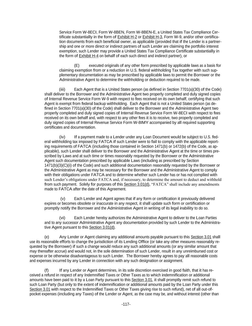 -117- Service Form W-8ECI, Form W-8BEN, Form W-8BEN-E, a United States Tax Compliance Cer- tificate substantially in the form of Exhibit H-2 or Exhibit H-3, Form W-9, and/or other certifica- tion documents from each beneficial owner, as applicable (provided that if the Lender is a partner- ship and one or more direct or indirect partners of such Lender are claiming the portfolio interest exemption, such Lender may provide a United States Tax Compliance Certificate substantially in the form of Exhibit H-4 on behalf of each such direct and indirect partner), or (E) executed originals of any other form prescribed by applicable laws as a basis for claiming exemption from or a reduction in U.S. federal withholding Tax together with such sup- plementary documentation as may be prescribed by applicable laws to permit the Borrower or the Administrative Agent to determine the withholding or deduction required to be made. (iii) Each Agent that is a United States person (as defined in Section 7701(a)(30) of the Code) shall deliver to the Borrower and the Administrative Agent two properly completed and duly signed copies of Internal Revenue Service Form W-9 with respect to fees received on its own behalf, certifying that such Agent is exempt from federal backup withholding. Each Agent that is not a United States person (as de- fined in Section 7701(a)(30) of the Code) shall deliver to the Borrower and the Administrative Agent two properly completed and duly signed copies of Internal Revenue Service Form W-8ECI with respect to fees received on its own behalf and, with respect to any other fees it is to receive, two properly completed and duly signed copies of Internal Revenue Service Form W-8IMY accompanied by all required supporting certificates and documentation. (iv) If a payment made to a Lender under any Loan Document would be subject to U.S. fed- eral withholding tax imposed by FATCA if such Lender were to fail to comply with the applicable report- ing requirements of FATCA (including those contained in Section 1471(b) or 1472(b) of the Code, as ap- plicable), such Lender shall deliver to the Borrower and the Administrative Agent at the time or times pre- scribed by Laws and at such time or times reasonably requested by the Borrower or the Administrative Agent such documentation prescribed by applicable Laws (including as prescribed by Section 1471(b)(3)(C)(i) of the Code) and such additional documentation reasonably requested by the Borrower or the Administrative Agent as may be necessary for the Borrower and the Administrative Agent to comply with their obligations under FATCA and to determine whether such Lender has or has not complied with such Lender’s obligations under FATCA and, if necessary, to determine the amount to deduct and withhold from such payment. Solely for purposes of this Section 3.01(d), “FATCA” shall include any amendments made to FATCA after the date of this Agreement. (v) Each Lender and Agent agrees that if any form or certification it previously delivered expires or becomes obsolete or inaccurate in any respect, it shall update such form or certification or promptly notify the Borrower and the Administrative Agent in writing of its legal inability to do so. (vi) Each Lender hereby authorizes the Administrative Agent to deliver to the Loan Parties and to any successor Administrative Agent any documentation provided by such Lender to the Administra- tive Agent pursuant to this Section 3.01(d). (e) Any Lender or Agent claiming any additional amounts payable pursuant to this Section 3.01 shall use its reasonable efforts to change the jurisdiction of its Lending Office (or take any other measures reasonably re- quested by the Borrower) if such a change would reduce any such additional amounts (or any similar amount that may thereafter accrue) and would not, in the sole determination of such Lender, result in any unreimbursed cost or expense or be otherwise disadvantageous to such Lender. The Borrower hereby agrees to pay all reasonable costs and expenses incurred by any Lender in connection with any such designation or assignment. (f) If any Lender or Agent determines, in its sole discretion exercised in good faith, that it has re- ceived a refund in respect of any Indemnified Taxes or Other Taxes as to which indemnification or additional amounts have been paid to it by a Loan Party pursuant to this Section 3.01, it shall promptly remit such refund to such Loan Party (but only to the extent of indemnification or additional amounts paid by the Loan Party under this Section 3.01 with respect to the Indemnified Taxes or Other Taxes giving rise to such refund), net of all out-of- pocket expenses (including any Taxes) of the Lender or Agent, as the case may be, and without interest (other than