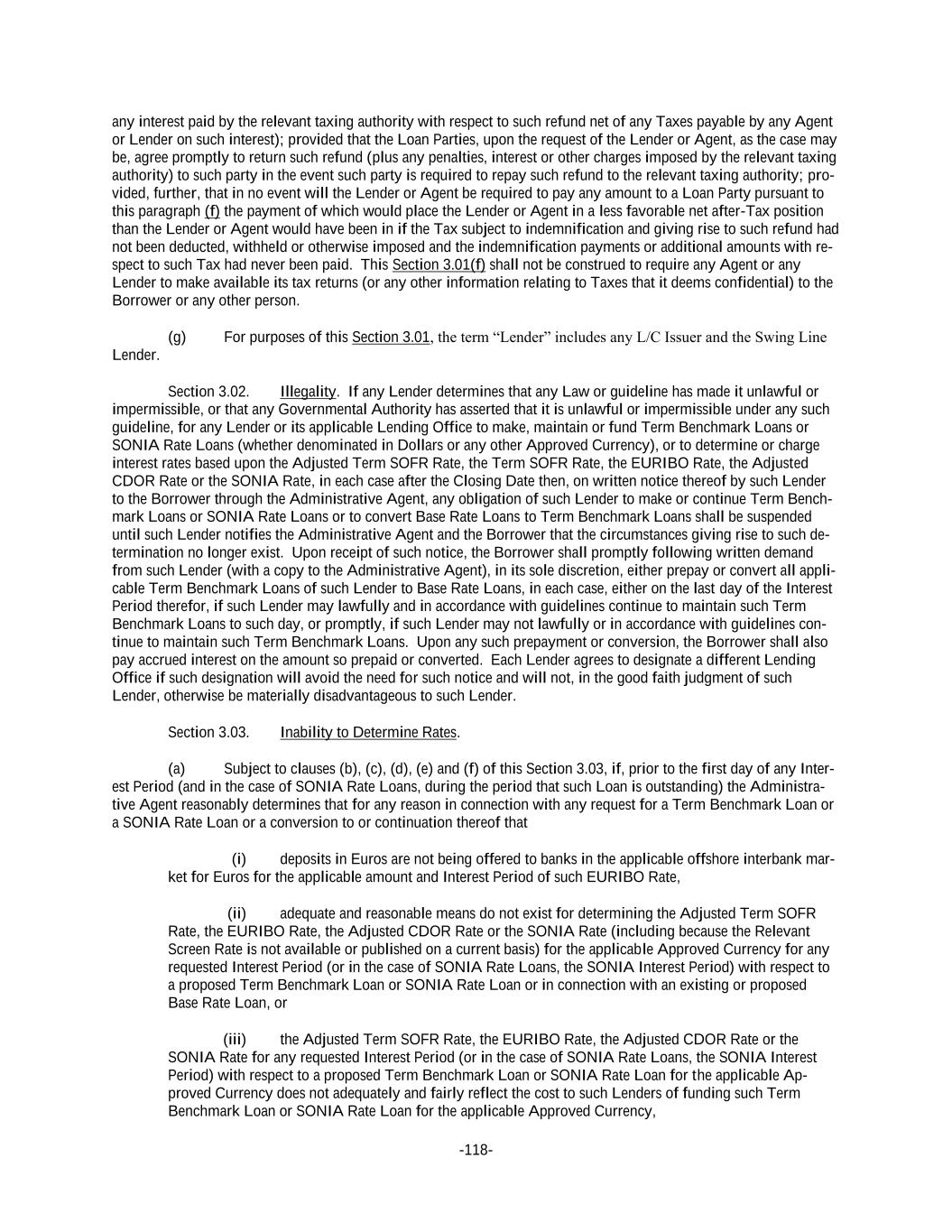 -118- any interest paid by the relevant taxing authority with respect to such refund net of any Taxes payable by any Agent or Lender on such interest); provided that the Loan Parties, upon the request of the Lender or Agent, as the case may be, agree promptly to return such refund (plus any penalties, interest or other charges imposed by the relevant taxing authority) to such party in the event such party is required to repay such refund to the relevant taxing authority; pro- vided, further, that in no event will the Lender or Agent be required to pay any amount to a Loan Party pursuant to this paragraph (f) the payment of which would place the Lender or Agent in a less favorable net after-Tax position than the Lender or Agent would have been in if the Tax subject to indemnification and giving rise to such refund had not been deducted, withheld or otherwise imposed and the indemnification payments or additional amounts with re- spect to such Tax had never been paid. This Section 3.01(f) shall not be construed to require any Agent or any Lender to make available its tax returns (or any other information relating to Taxes that it deems confidential) to the Borrower or any other person. (g) For purposes of this Section 3.01, the term “Lender” includes any L/C Issuer and the Swing Line Lender. Section 3.02. Illegality. If any Lender determines that any Law or guideline has made it unlawful or impermissible, or that any Governmental Authority has asserted that it is unlawful or impermissible under any such guideline, for any Lender or its applicable Lending Office to make, maintain or fund Term Benchmark Loans or SONIA Rate Loans (whether denominated in Dollars or any other Approved Currency), or to determine or charge interest rates based upon the Adjusted Term SOFR Rate, the Term SOFR Rate, the EURIBO Rate, the Adjusted CDOR Rate or the SONIA Rate, in each case after the Closing Date then, on written notice thereof by such Lender to the Borrower through the Administrative Agent, any obligation of such Lender to make or continue Term Bench- mark Loans or SONIA Rate Loans or to convert Base Rate Loans to Term Benchmark Loans shall be suspended until such Lender notifies the Administrative Agent and the Borrower that the circumstances giving rise to such de- termination no longer exist. Upon receipt of such notice, the Borrower shall promptly following written demand from such Lender (with a copy to the Administrative Agent), in its sole discretion, either prepay or convert all appli- cable Term Benchmark Loans of such Lender to Base Rate Loans, in each case, either on the last day of the Interest Period therefor, if such Lender may lawfully and in accordance with guidelines continue to maintain such Term Benchmark Loans to such day, or promptly, if such Lender may not lawfully or in accordance with guidelines con- tinue to maintain such Term Benchmark Loans. Upon any such prepayment or conversion, the Borrower shall also pay accrued interest on the amount so prepaid or converted. Each Lender agrees to designate a different Lending Office if such designation will avoid the need for such notice and will not, in the good faith judgment of such Lender, otherwise be materially disadvantageous to such Lender. Section 3.03. Inability to Determine Rates. (a) Subject to clauses (b), (c), (d), (e) and (f) of this Section 3.03, if, prior to the first day of any Inter- est Period (and in the case of SONIA Rate Loans, during the period that such Loan is outstanding) the Administra- tive Agent reasonably determines that for any reason in connection with any request for a Term Benchmark Loan or a SONIA Rate Loan or a conversion to or continuation thereof that (i) deposits in Euros are not being offered to banks in the applicable offshore interbank mar- ket for Euros for the applicable amount and Interest Period of such EURIBO Rate, (ii) adequate and reasonable means do not exist for determining the Adjusted Term SOFR Rate, the EURIBO Rate, the Adjusted CDOR Rate or the SONIA Rate (including because the Relevant Screen Rate is not available or published on a current basis) for the applicable Approved Currency for any requested Interest Period (or in the case of SONIA Rate Loans, the SONIA Interest Period) with respect to a proposed Term Benchmark Loan or SONIA Rate Loan or in connection with an existing or proposed Base Rate Loan, or (iii) the Adjusted Term SOFR Rate, the EURIBO Rate, the Adjusted CDOR Rate or the SONIA Rate for any requested Interest Period (or in the case of SONIA Rate Loans, the SONIA Interest Period) with respect to a proposed Term Benchmark Loan or SONIA Rate Loan for the applicable Ap- proved Currency does not adequately and fairly reflect the cost to such Lenders of funding such Term Benchmark Loan or SONIA Rate Loan for the applicable Approved Currency,