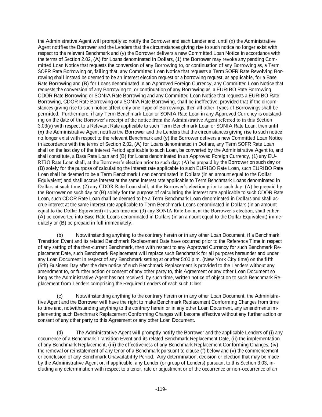 -119- the Administrative Agent will promptly so notify the Borrower and each Lender and, until (x) the Administrative Agent notifies the Borrower and the Lenders that the circumstances giving rise to such notice no longer exist with respect to the relevant Benchmark and (y) the Borrower delivers a new Committed Loan Notice in accordance with the terms of Section 2.02, (A) for Loans denominated in Dollars, (1) the Borrower may revoke any pending Com- mitted Loan Notice that requests the conversion of any Borrowing to, or continuation of any Borrowing as, a Term SOFR Rate Borrowing or, failing that, any Committed Loan Notice that requests a Term SOFR Rate Revolving Bor- rowing shall instead be deemed to be an interest election request or a borrowing request, as applicable, for a Base Rate Borrowing and (B) for Loans denominated in an Approved Foreign Currency, any Committed Loan Notice that requests the conversion of any Borrowing to, or continuation of any Borrowing as, a EURIBO Rate Borrowing, CDOR Rate Borrowing or SONIA Rate Borrowing and any Committed Loan Notice that requests a EURIBO Rate Borrowing, CDOR Rate Borrowing or a SONIA Rate Borrowing, shall be ineffective; provided that if the circum- stances giving rise to such notice affect only one Type of Borrowings, then all other Types of Borrowings shall be permitted. Furthermore, if any Term Benchmark Loan or SONIA Rate Loan in any Approved Currency is outstand- ing on the date of the Borrower’s receipt of the notice from the Administrative Agent referred to in this Section 3.03(a) with respect to a Relevant Rate applicable to such Term Benchmark Loan or SONIA Rate Loan, then until (x) the Administrative Agent notifies the Borrower and the Lenders that the circumstances giving rise to such notice no longer exist with respect to the relevant Benchmark and (y) the Borrower delivers a new Committed Loan Notice in accordance with the terms of Section 2.02, (A) for Loans denominated in Dollars, any Term SOFR Rate Loan shall on the last day of the Interest Period applicable to such Loan, be converted by the Administrative Agent to, and shall constitute, a Base Rate Loan and (B) for Loans denominated in an Approved Foreign Currency, (1) any EU- RIBO Rate Loan shall, at the Borrower’s election prior to such day: (A) be prepaid by the Borrower on such day or (B) solely for the purpose of calculating the interest rate applicable to such EURIBO Rate Loan, such EURIBO Rate Loan shall be deemed to be a Term Benchmark Loan denominated in Dollars (in an amount equal to the Dollar Equivalent) and shall accrue interest at the same interest rate applicable to Term Benchmark Loans denominated in Dollars at such time, (2) any CDOR Rate Loan shall, at the Borrower’s election prior to such day: (A) be prepaid by the Borrower on such day or (B) solely for the purpose of calculating the interest rate applicable to such CDOR Rate Loan, such CDOR Rate Loan shall be deemed to be a Term Benchmark Loan denominated in Dollars and shall ac- crue interest at the same interest rate applicable to Term Benchmark Loans denominated in Dollars (in an amount equal to the Dollar Equivalent) at such time and (3) any SONIA Rate Loan, at the Borrower’s election, shall either (A) be converted into Base Rate Loans denominated in Dollars (in an amount equal to the Dollar Equivalent) imme- diately or (B) be prepaid in full immediately. (b) Notwithstanding anything to the contrary herein or in any other Loan Document, if a Benchmark Transition Event and its related Benchmark Replacement Date have occurred prior to the Reference Time in respect of any setting of the then-current Benchmark, then with respect to any Approved Currency for such Benchmark Re- placement Date, such Benchmark Replacement will replace such Benchmark for all purposes hereunder and under any Loan Document in respect of any Benchmark setting at or after 5:00 p.m. (New York City time) on the fifth (5th) Business Day after the date notice of such Benchmark Replacement is provided to the Lenders without any amendment to, or further action or consent of any other party to, this Agreement or any other Loan Document so long as the Administrative Agent has not received, by such time, written notice of objection to such Benchmark Re- placement from Lenders comprising the Required Lenders of each such Class. (c) Notwithstanding anything to the contrary herein or in any other Loan Document, the Administra- tive Agent and the Borrower will have the right to make Benchmark Replacement Conforming Changes from time to time and, notwithstanding anything to the contrary herein or in any other Loan Document, any amendments im- plementing such Benchmark Replacement Conforming Changes will become effective without any further action or consent of any other party to this Agreement or any other Loan Document. (d) The Administrative Agent will promptly notify the Borrower and the applicable Lenders of (i) any occurrence of a Benchmark Transition Event and its related Benchmark Replacement Date, (ii) the implementation of any Benchmark Replacement, (iii) the effectiveness of any Benchmark Replacement Conforming Changes, (iv) the removal or reinstatement of any tenor of a Benchmark pursuant to clause (f) below and (v) the commencement or conclusion of any Benchmark Unavailability Period. Any determination, decision or election that may be made by the Administrative Agent or, if applicable, any Lender (or group of Lenders) pursuant to this Section 3.03, in- cluding any determination with respect to a tenor, rate or adjustment or of the occurrence or non-occurrence of an