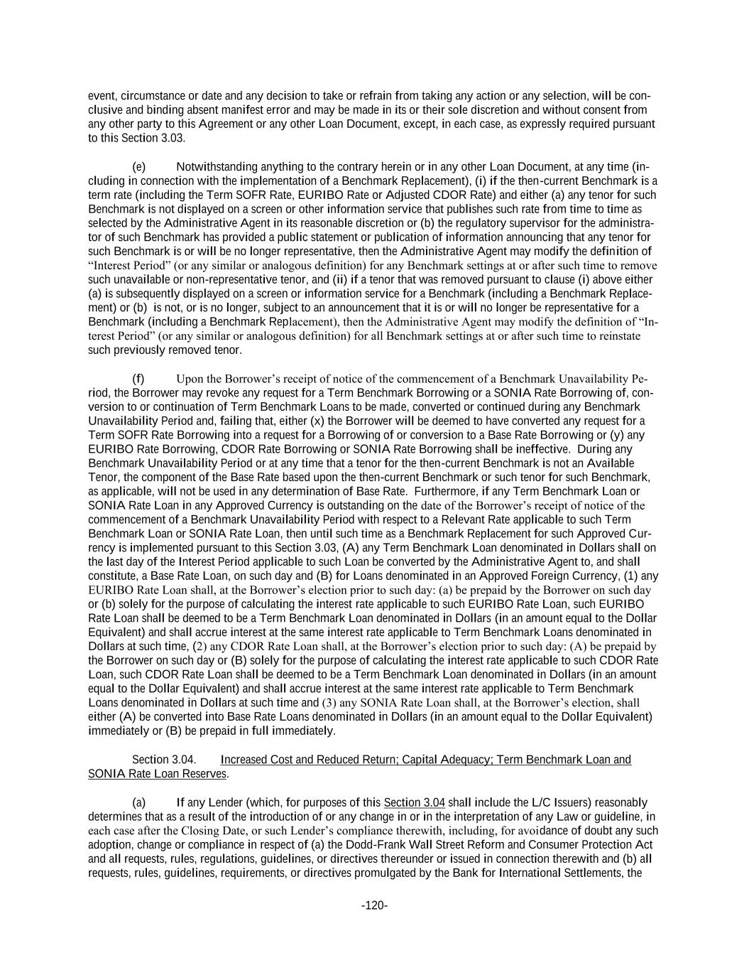 -120- event, circumstance or date and any decision to take or refrain from taking any action or any selection, will be con- clusive and binding absent manifest error and may be made in its or their sole discretion and without consent from any other party to this Agreement or any other Loan Document, except, in each case, as expressly required pursuant to this Section 3.03. (e) Notwithstanding anything to the contrary herein or in any other Loan Document, at any time (in- cluding in connection with the implementation of a Benchmark Replacement), (i) if the then-current Benchmark is a term rate (including the Term SOFR Rate, EURIBO Rate or Adjusted CDOR Rate) and either (a) any tenor for such Benchmark is not displayed on a screen or other information service that publishes such rate from time to time as selected by the Administrative Agent in its reasonable discretion or (b) the regulatory supervisor for the administra- tor of such Benchmark has provided a public statement or publication of information announcing that any tenor for such Benchmark is or will be no longer representative, then the Administrative Agent may modify the definition of “Interest Period” (or any similar or analogous definition) for any Benchmark settings at or after such time to remove such unavailable or non-representative tenor, and (ii) if a tenor that was removed pursuant to clause (i) above either (a) is subsequently displayed on a screen or information service for a Benchmark (including a Benchmark Replace- ment) or (b) is not, or is no longer, subject to an announcement that it is or will no longer be representative for a Benchmark (including a Benchmark Replacement), then the Administrative Agent may modify the definition of “In- terest Period” (or any similar or analogous definition) for all Benchmark settings at or after such time to reinstate such previously removed tenor. (f) Upon the Borrower’s receipt of notice of the commencement of a Benchmark Unavailability Pe- riod, the Borrower may revoke any request for a Term Benchmark Borrowing or a SONIA Rate Borrowing of, con- version to or continuation of Term Benchmark Loans to be made, converted or continued during any Benchmark Unavailability Period and, failing that, either (x) the Borrower will be deemed to have converted any request for a Term SOFR Rate Borrowing into a request for a Borrowing of or conversion to a Base Rate Borrowing or (y) any EURIBO Rate Borrowing, CDOR Rate Borrowing or SONIA Rate Borrowing shall be ineffective. During any Benchmark Unavailability Period or at any time that a tenor for the then-current Benchmark is not an Available Tenor, the component of the Base Rate based upon the then-current Benchmark or such tenor for such Benchmark, as applicable, will not be used in any determination of Base Rate. Furthermore, if any Term Benchmark Loan or SONIA Rate Loan in any Approved Currency is outstanding on the date of the Borrower’s receipt of notice of the commencement of a Benchmark Unavailability Period with respect to a Relevant Rate applicable to such Term Benchmark Loan or SONIA Rate Loan, then until such time as a Benchmark Replacement for such Approved Cur- rency is implemented pursuant to this Section 3.03, (A) any Term Benchmark Loan denominated in Dollars shall on the last day of the Interest Period applicable to such Loan be converted by the Administrative Agent to, and shall constitute, a Base Rate Loan, on such day and (B) for Loans denominated in an Approved Foreign Currency, (1) any EURIBO Rate Loan shall, at the Borrower’s election prior to such day: (a) be prepaid by the Borrower on such day or (b) solely for the purpose of calculating the interest rate applicable to such EURIBO Rate Loan, such EURIBO Rate Loan shall be deemed to be a Term Benchmark Loan denominated in Dollars (in an amount equal to the Dollar Equivalent) and shall accrue interest at the same interest rate applicable to Term Benchmark Loans denominated in Dollars at such time, (2) any CDOR Rate Loan shall, at the Borrower’s election prior to such day: (A) be prepaid by the Borrower on such day or (B) solely for the purpose of calculating the interest rate applicable to such CDOR Rate Loan, such CDOR Rate Loan shall be deemed to be a Term Benchmark Loan denominated in Dollars (in an amount equal to the Dollar Equivalent) and shall accrue interest at the same interest rate applicable to Term Benchmark Loans denominated in Dollars at such time and (3) any SONIA Rate Loan shall, at the Borrower’s election, shall either (A) be converted into Base Rate Loans denominated in Dollars (in an amount equal to the Dollar Equivalent) immediately or (B) be prepaid in full immediately. Section 3.04. Increased Cost and Reduced Return; Capital Adequacy; Term Benchmark Loan and SONIA Rate Loan Reserves. (a) If any Lender (which, for purposes of this Section 3.04 shall include the L/C Issuers) reasonably determines that as a result of the introduction of or any change in or in the interpretation of any Law or guideline, in each case after the Closing Date, or such Lender’s compliance therewith, including, for avoidance of doubt any such adoption, change or compliance in respect of (a) the Dodd-Frank Wall Street Reform and Consumer Protection Act and all requests, rules, regulations, guidelines, or directives thereunder or issued in connection therewith and (b) all requests, rules, guidelines, requirements, or directives promulgated by the Bank for International Settlements, the
