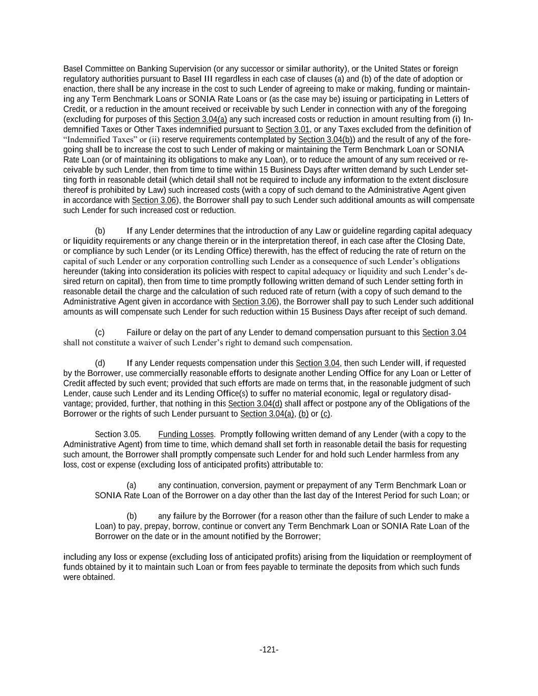 -121- Basel Committee on Banking Supervision (or any successor or similar authority), or the United States or foreign regulatory authorities pursuant to Basel III regardless in each case of clauses (a) and (b) of the date of adoption or enaction, there shall be any increase in the cost to such Lender of agreeing to make or making, funding or maintain- ing any Term Benchmark Loans or SONIA Rate Loans or (as the case may be) issuing or participating in Letters of Credit, or a reduction in the amount received or receivable by such Lender in connection with any of the foregoing (excluding for purposes of this Section 3.04(a) any such increased costs or reduction in amount resulting from (i) In- demnified Taxes or Other Taxes indemnified pursuant to Section 3.01, or any Taxes excluded from the definition of “Indemnified Taxes” or (ii) reserve requirements contemplated by Section 3.04(b)) and the result of any of the fore- going shall be to increase the cost to such Lender of making or maintaining the Term Benchmark Loan or SONIA Rate Loan (or of maintaining its obligations to make any Loan), or to reduce the amount of any sum received or re- ceivable by such Lender, then from time to time within 15 Business Days after written demand by such Lender set- ting forth in reasonable detail (which detail shall not be required to include any information to the extent disclosure thereof is prohibited by Law) such increased costs (with a copy of such demand to the Administrative Agent given in accordance with Section 3.06), the Borrower shall pay to such Lender such additional amounts as will compensate such Lender for such increased cost or reduction. (b) If any Lender determines that the introduction of any Law or guideline regarding capital adequacy or liquidity requirements or any change therein or in the interpretation thereof, in each case after the Closing Date, or compliance by such Lender (or its Lending Office) therewith, has the effect of reducing the rate of return on the capital of such Lender or any corporation controlling such Lender as a consequence of such Lender’s obligations hereunder (taking into consideration its policies with respect to capital adequacy or liquidity and such Lender’s de- sired return on capital), then from time to time promptly following written demand of such Lender setting forth in reasonable detail the charge and the calculation of such reduced rate of return (with a copy of such demand to the Administrative Agent given in accordance with Section 3.06), the Borrower shall pay to such Lender such additional amounts as will compensate such Lender for such reduction within 15 Business Days after receipt of such demand. (c) Failure or delay on the part of any Lender to demand compensation pursuant to this Section 3.04 shall not constitute a waiver of such Lender’s right to demand such compensation. (d) If any Lender requests compensation under this Section 3.04, then such Lender will, if requested by the Borrower, use commercially reasonable efforts to designate another Lending Office for any Loan or Letter of Credit affected by such event; provided that such efforts are made on terms that, in the reasonable judgment of such Lender, cause such Lender and its Lending Office(s) to suffer no material economic, legal or regulatory disad- vantage; provided, further, that nothing in this Section 3.04(d) shall affect or postpone any of the Obligations of the Borrower or the rights of such Lender pursuant to Section 3.04(a), (b) or (c). Section 3.05. Funding Losses. Promptly following written demand of any Lender (with a copy to the Administrative Agent) from time to time, which demand shall set forth in reasonable detail the basis for requesting such amount, the Borrower shall promptly compensate such Lender for and hold such Lender harmless from any loss, cost or expense (excluding loss of anticipated profits) attributable to: (a) any continuation, conversion, payment or prepayment of any Term Benchmark Loan or SONIA Rate Loan of the Borrower on a day other than the last day of the Interest Period for such Loan; or (b) any failure by the Borrower (for a reason other than the failure of such Lender to make a Loan) to pay, prepay, borrow, continue or convert any Term Benchmark Loan or SONIA Rate Loan of the Borrower on the date or in the amount notified by the Borrower; including any loss or expense (excluding loss of anticipated profits) arising from the liquidation or reemployment of funds obtained by it to maintain such Loan or from fees payable to terminate the deposits from which such funds were obtained.