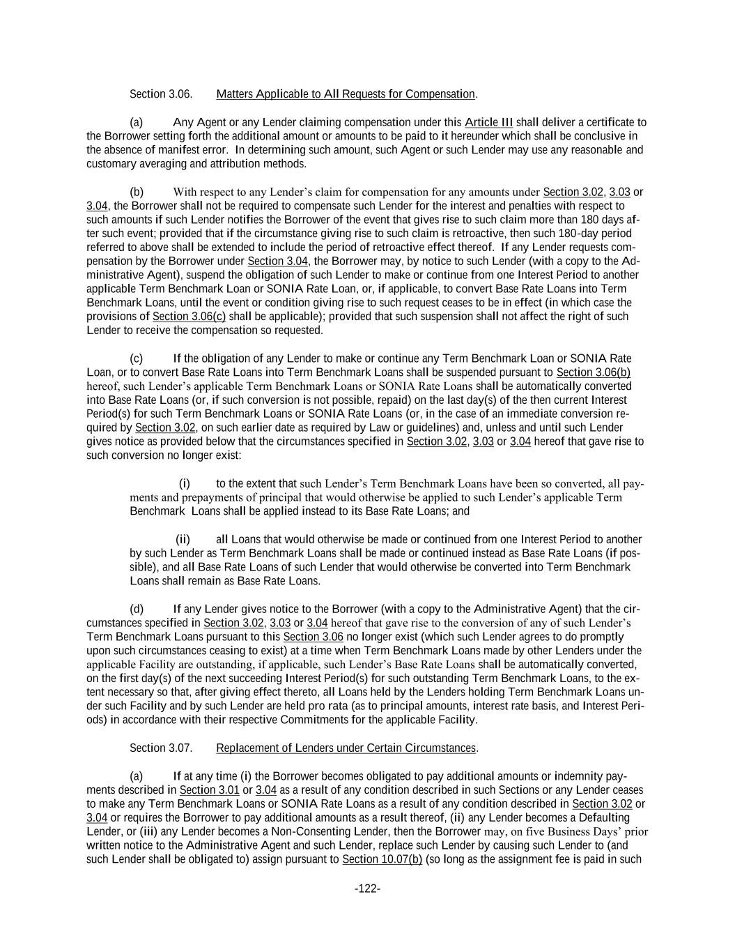 -122- Section 3.06. Matters Applicable to All Requests for Compensation. (a) Any Agent or any Lender claiming compensation under this Article III shall deliver a certificate to the Borrower setting forth the additional amount or amounts to be paid to it hereunder which shall be conclusive in the absence of manifest error. In determining such amount, such Agent or such Lender may use any reasonable and customary averaging and attribution methods. (b) With respect to any Lender’s claim for compensation for any amounts under Section 3.02, 3.03 or 3.04, the Borrower shall not be required to compensate such Lender for the interest and penalties with respect to such amounts if such Lender notifies the Borrower of the event that gives rise to such claim more than 180 days af- ter such event; provided that if the circumstance giving rise to such claim is retroactive, then such 180-day period referred to above shall be extended to include the period of retroactive effect thereof. If any Lender requests com- pensation by the Borrower under Section 3.04, the Borrower may, by notice to such Lender (with a copy to the Ad- ministrative Agent), suspend the obligation of such Lender to make or continue from one Interest Period to another applicable Term Benchmark Loan or SONIA Rate Loan, or, if applicable, to convert Base Rate Loans into Term Benchmark Loans, until the event or condition giving rise to such request ceases to be in effect (in which case the provisions of Section 3.06(c) shall be applicable); provided that such suspension shall not affect the right of such Lender to receive the compensation so requested. (c) If the obligation of any Lender to make or continue any Term Benchmark Loan or SONIA Rate Loan, or to convert Base Rate Loans into Term Benchmark Loans shall be suspended pursuant to Section 3.06(b) hereof, such Lender’s applicable Term Benchmark Loans or SONIA Rate Loans shall be automatically converted into Base Rate Loans (or, if such conversion is not possible, repaid) on the last day(s) of the then current Interest Period(s) for such Term Benchmark Loans or SONIA Rate Loans (or, in the case of an immediate conversion re- quired by Section 3.02, on such earlier date as required by Law or guidelines) and, unless and until such Lender gives notice as provided below that the circumstances specified in Section 3.02, 3.03 or 3.04 hereof that gave rise to such conversion no longer exist: (i) to the extent that such Lender’s Term Benchmark Loans have been so converted, all pay- ments and prepayments of principal that would otherwise be applied to such Lender’s applicable Term Benchmark Loans shall be applied instead to its Base Rate Loans; and (ii) all Loans that would otherwise be made or continued from one Interest Period to another by such Lender as Term Benchmark Loans shall be made or continued instead as Base Rate Loans (if pos- sible), and all Base Rate Loans of such Lender that would otherwise be converted into Term Benchmark Loans shall remain as Base Rate Loans. (d) If any Lender gives notice to the Borrower (with a copy to the Administrative Agent) that the cir- cumstances specified in Section 3.02, 3.03 or 3.04 hereof that gave rise to the conversion of any of such Lender’s Term Benchmark Loans pursuant to this Section 3.06 no longer exist (which such Lender agrees to do promptly upon such circumstances ceasing to exist) at a time when Term Benchmark Loans made by other Lenders under the applicable Facility are outstanding, if applicable, such Lender’s Base Rate Loans shall be automatically converted, on the first day(s) of the next succeeding Interest Period(s) for such outstanding Term Benchmark Loans, to the ex- tent necessary so that, after giving effect thereto, all Loans held by the Lenders holding Term Benchmark Loans un- der such Facility and by such Lender are held pro rata (as to principal amounts, interest rate basis, and Interest Peri- ods) in accordance with their respective Commitments for the applicable Facility. Section 3.07. Replacement of Lenders under Certain Circumstances. (a) If at any time (i) the Borrower becomes obligated to pay additional amounts or indemnity pay- ments described in Section 3.01 or 3.04 as a result of any condition described in such Sections or any Lender ceases to make any Term Benchmark Loans or SONIA Rate Loans as a result of any condition described in Section 3.02 or 3.04 or requires the Borrower to pay additional amounts as a result thereof, (ii) any Lender becomes a Defaulting Lender, or (iii) any Lender becomes a Non-Consenting Lender, then the Borrower may, on five Business Days’ prior written notice to the Administrative Agent and such Lender, replace such Lender by causing such Lender to (and such Lender shall be obligated to) assign pursuant to Section 10.07(b) (so long as the assignment fee is paid in such