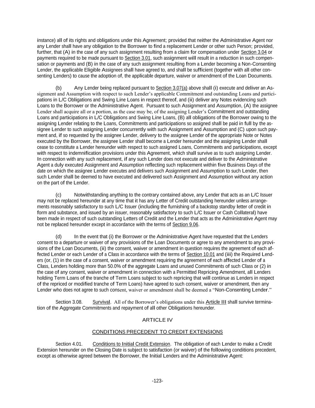 -123- instance) all of its rights and obligations under this Agreement; provided that neither the Administrative Agent nor any Lender shall have any obligation to the Borrower to find a replacement Lender or other such Person; provided, further, that (A) in the case of any such assignment resulting from a claim for compensation under Section 3.04 or payments required to be made pursuant to Section 3.01, such assignment will result in a reduction in such compen- sation or payments and (B) in the case of any such assignment resulting from a Lender becoming a Non-Consenting Lender, the applicable Eligible Assignees shall have agreed to, and shall be sufficient (together with all other con- senting Lenders) to cause the adoption of, the applicable departure, waiver or amendment of the Loan Documents. (b) Any Lender being replaced pursuant to Section 3.07(a) above shall (i) execute and deliver an As- signment and Assumption with respect to such Lender’s applicable Commitment and outstanding Loans and partici- pations in L/C Obligations and Swing Line Loans in respect thereof, and (ii) deliver any Notes evidencing such Loans to the Borrower or the Administrative Agent. Pursuant to such Assignment and Assumption, (A) the assignee Lender shall acquire all or a portion, as the case may be, of the assigning Lender’s Commitment and outstanding Loans and participations in L/C Obligations and Swing Line Loans, (B) all obligations of the Borrower owing to the assigning Lender relating to the Loans, Commitments and participations so assigned shall be paid in full by the as- signee Lender to such assigning Lender concurrently with such Assignment and Assumption and (C) upon such pay- ment and, if so requested by the assignee Lender, delivery to the assignee Lender of the appropriate Note or Notes executed by the Borrower, the assignee Lender shall become a Lender hereunder and the assigning Lender shall cease to constitute a Lender hereunder with respect to such assigned Loans, Commitments and participations, except with respect to indemnification provisions under this Agreement, which shall survive as to such assigning Lender. In connection with any such replacement, if any such Lender does not execute and deliver to the Administrative Agent a duly executed Assignment and Assumption reflecting such replacement within five Business Days of the date on which the assignee Lender executes and delivers such Assignment and Assumption to such Lender, then such Lender shall be deemed to have executed and delivered such Assignment and Assumption without any action on the part of the Lender. (c) Notwithstanding anything to the contrary contained above, any Lender that acts as an L/C Issuer may not be replaced hereunder at any time that it has any Letter of Credit outstanding hereunder unless arrange- ments reasonably satisfactory to such L/C Issuer (including the furnishing of a backstop standby letter of credit in form and substance, and issued by an issuer, reasonably satisfactory to such L/C Issuer or Cash Collateral) have been made in respect of such outstanding Letters of Credit and the Lender that acts as the Administrative Agent may not be replaced hereunder except in accordance with the terms of Section 9.06. (d) In the event that (i) the Borrower or the Administrative Agent have requested that the Lenders consent to a departure or waiver of any provisions of the Loan Documents or agree to any amendment to any provi- sions of the Loan Documents, (ii) the consent, waiver or amendment in question requires the agreement of each af- fected Lender or each Lender of a Class in accordance with the terms of Section 10.01 and (iii) the Required Lend- ers (or, (1) in the case of a consent, waiver or amendment requiring the agreement of each affected Lender of a Class, Lenders holding more than 50.0% of the aggregate Loans and unused Commitments of such Class or (2) in the case of any consent, waiver or amendment in connection with a Permitted Repricing Amendment, all Lenders holding Term Loans of the tranche of Term Loans subject to such repricing that will continue as Lenders in respect of the repriced or modified tranche of Term Loans) have agreed to such consent, waiver or amendment, then any Lender who does not agree to such consent, waiver or amendment shall be deemed a “Non-Consenting Lender.” Section 3.08. Survival. All of the Borrower’s obligations under this Article III shall survive termina- tion of the Aggregate Commitments and repayment of all other Obligations hereunder. ARTICLE IV CONDITIONS PRECEDENT TO CREDIT EXTENSIONS Section 4.01. Conditions to Initial Credit Extension. The obligation of each Lender to make a Credit Extension hereunder on the Closing Date is subject to satisfaction (or waiver) of the following conditions precedent, except as otherwise agreed between the Borrower, the Initial Lenders and the Administrative Agent: