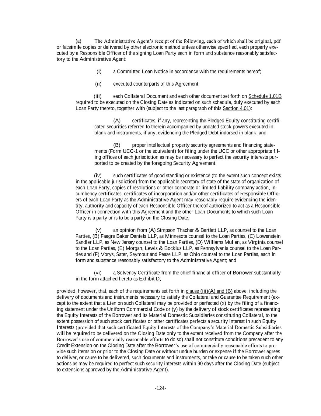 -124- (a) The Administrative Agent’s receipt of the following, each of which shall be original,.pdf or facsimile copies or delivered by other electronic method unless otherwise specified, each properly exe- cuted by a Responsible Officer of the signing Loan Party each in form and substance reasonably satisfac- tory to the Administrative Agent: (i) a Committed Loan Notice in accordance with the requirements hereof; (ii) executed counterparts of this Agreement; (iii) each Collateral Document and each other document set forth on Schedule 1.01B required to be executed on the Closing Date as indicated on such schedule, duly executed by each Loan Party thereto, together with (subject to the last paragraph of this Section 4.01): (A) certificates, if any, representing the Pledged Equity constituting certifi- cated securities referred to therein accompanied by undated stock powers executed in blank and instruments, if any, evidencing the Pledged Debt indorsed in blank; and (B) proper intellectual property security agreements and financing state- ments (Form UCC-1 or the equivalent) for filing under the UCC or other appropriate fil- ing offices of each jurisdiction as may be necessary to perfect the security interests pur- ported to be created by the foregoing Security Agreement; (iv) such certificates of good standing or existence (to the extent such concept exists in the applicable jurisdiction) from the applicable secretary of state of the state of organization of each Loan Party, copies of resolutions or other corporate or limited liability company action, in- cumbency certificates, certificates of incorporation and/or other certificates of Responsible Offic- ers of each Loan Party as the Administrative Agent may reasonably require evidencing the iden- tity, authority and capacity of each Responsible Officer thereof authorized to act as a Responsible Officer in connection with this Agreement and the other Loan Documents to which such Loan Party is a party or is to be a party on the Closing Date; (v) an opinion from (A) Simpson Thacher & Bartlett LLP, as counsel to the Loan Parties, (B) Faegre Baker Daniels LLP, as Minnesota counsel to the Loan Parties, (C) Lowenstein Sandler LLP, as New Jersey counsel to the Loan Parties, (D) Williams Mullen, as Virginia counsel to the Loan Parties, (E) Morgan, Lewis & Bockius LLP, as Pennsylvania counsel to the Loan Par- ties and (F) Vorys, Sater, Seymour and Pease LLP, as Ohio counsel to the Loan Parties, each in form and substance reasonably satisfactory to the Administrative Agent; and (vi) a Solvency Certificate from the chief financial officer of Borrower substantially in the form attached hereto as Exhibit D; provided, however, that, each of the requirements set forth in clause (iii)(A) and (B) above, including the delivery of documents and instruments necessary to satisfy the Collateral and Guarantee Requirement (ex- cept to the extent that a Lien on such Collateral may be provided or perfected (x) by the filing of a financ- ing statement under the Uniform Commercial Code or (y) by the delivery of stock certificates representing the Equity Interests of the Borrower and its Material Domestic Subsidiaries constituting Collateral, to the extent possession of such stock certificates or other certificates perfects a security interest in such Equity Interests (provided that such certificated Equity Interests of the Company’s Material Domestic Subsidiaries will be required to be delivered on the Closing Date only to the extent received from the Company after the Borrower’s use of commercially reasonable efforts to do so) shall not constitute conditions precedent to any Credit Extension on the Closing Date after the Borrower’s use of commercially reasonable efforts to pro- vide such items on or prior to the Closing Date or without undue burden or expense if the Borrower agrees to deliver, or cause to be delivered, such documents and instruments, or take or cause to be taken such other actions as may be required to perfect such security interests within 90 days after the Closing Date (subject to extensions approved by the Administrative Agent).
