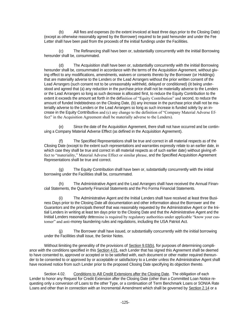 -125- (b) All fees and expenses (to the extent invoiced at least three days prior to the Closing Date) (except as otherwise reasonably agreed by the Borrower) required to be paid hereunder and under the Fee Letter shall have been paid from the proceeds of the initial fundings under the Facilities. (c) The Refinancing shall have been or, substantially concurrently with the initial Borrowing hereunder shall be, consummated. (d) The Acquisition shall have been or, substantially concurrently with the initial Borrowing hereunder shall be, consummated in accordance with the terms of the Acquisition Agreement, without giv- ing effect to any modifications, amendments, waivers or consents thereto by the Borrower (or Holdings) that are materially adverse to the Lenders or the Lead Arrangers without the prior written consent of the Lead Arrangers (such consent not to be unreasonably withheld, delayed or conditioned) (it being under- stood and agreed that (a) any reduction in the purchase price shall not be materially adverse to the Lenders or the Lead Arrangers so long as such decrease is allocated first, to reduce the Equity Contribution to the extent it exceeds the amount set forth in the definition of “Equity Contribution” and second, to reduce the amount of funded Indebtedness on the Closing Date, (b) any increase in the purchase price shall not be ma- terially adverse to the Lenders or the Lead Arrangers so long as such increase is funded solely by an in- crease in the Equity Contribution and (c) any change to the definition of “Company Material Adverse Ef- fect” in the Acquisition Agreement shall be materially adverse to the Lenders). (e) Since the date of the Acquisition Agreement, there shall not have occurred and be contin- uing a Company Material Adverse Effect (as defined in the Acquisition Agreement). (f) The Specified Representations shall be true and correct in all material respects as of the Closing Date (except to the extent such representations and warranties expressly relate to an earlier date, in which case they shall be true and correct in all material respects as of such earlier date) without giving ef- fect to “materiality,” Material Adverse Effect or similar phrase, and the Specified Acquisition Agreement Representations shall be true and correct. (g) The Equity Contribution shall have been or, substantially concurrently with the initial borrowing under the Facilities shall be, consummated. (h) The Administrative Agent and the Lead Arrangers shall have received the Annual Finan- cial Statements, the Quarterly Financial Statements and the Pro Forma Financial Statements. (i) The Administrative Agent and the Initial Lenders shall have received at least three Busi- ness Days prior to the Closing Date all documentation and other information about the Borrower and the Guarantors and the principals thereof that was reasonably requested by the Administrative Agent or the Ini- tial Lenders in writing at least ten days prior to the Closing Date and that the Administrative Agent and the Initial Lenders reasonably determine is required by regulatory authorities under applicable “know your cus- tomer” and anti-money laundering rules and regulations, including the USA Patriot Act. (j) The Borrower shall have issued, or substantially concurrently with the initial borrowing under the Facilities shall issue, the Senior Notes. Without limiting the generality of the provisions of Section 9.03(b), for purposes of determining compli- ance with the conditions specified in this Section 4.01, each Lender that has signed this Agreement shall be deemed to have consented to, approved or accepted or to be satisfied with, each document or other matter required thereun- der to be consented to or approved by or acceptable or satisfactory to a Lender unless the Administrative Agent shall have received notice from such Lender prior to the proposed Closing Date specifying its objection thereto. Section 4.02. Conditions to All Credit Extensions after the Closing Date. The obligation of each Lender to honor any Request for Credit Extension after the Closing Date (other than a Committed Loan Notice re- questing only a conversion of Loans to the other Type, or a continuation of Term Benchmark Loans or SONIA Rate Loans and other than in connection with an Incremental Amendment which shall be governed by Section 2.14 or a