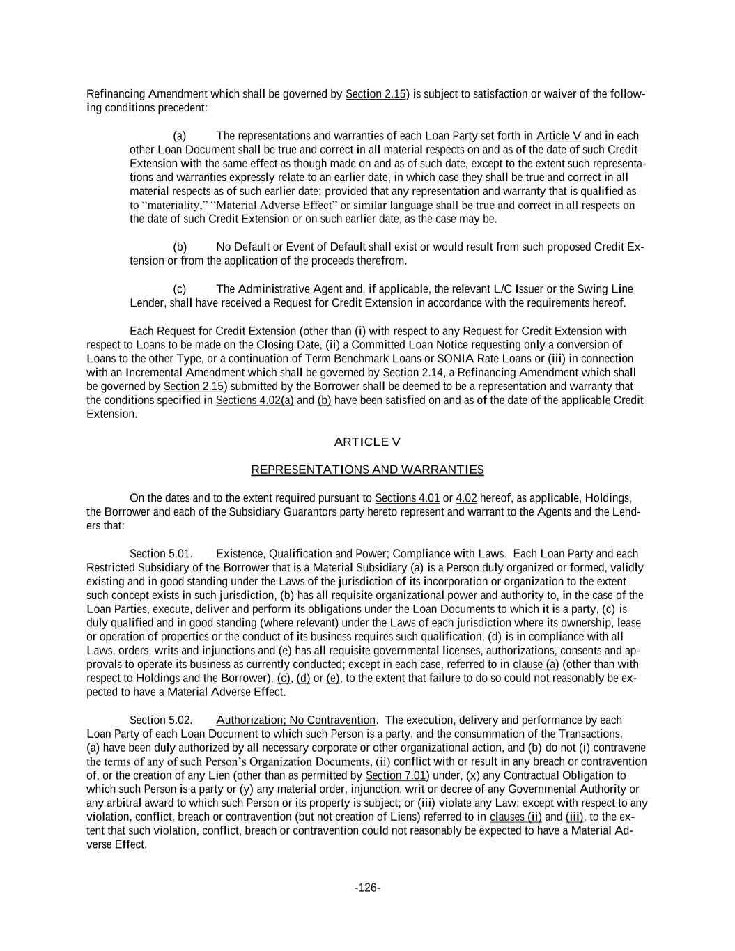 -126- Refinancing Amendment which shall be governed by Section 2.15) is subject to satisfaction or waiver of the follow- ing conditions precedent: (a) The representations and warranties of each Loan Party set forth in Article V and in each other Loan Document shall be true and correct in all material respects on and as of the date of such Credit Extension with the same effect as though made on and as of such date, except to the extent such representa- tions and warranties expressly relate to an earlier date, in which case they shall be true and correct in all material respects as of such earlier date; provided that any representation and warranty that is qualified as to “materiality,” “Material Adverse Effect” or similar language shall be true and correct in all respects on the date of such Credit Extension or on such earlier date, as the case may be. (b) No Default or Event of Default shall exist or would result from such proposed Credit Ex- tension or from the application of the proceeds therefrom. (c) The Administrative Agent and, if applicable, the relevant L/C Issuer or the Swing Line Lender, shall have received a Request for Credit Extension in accordance with the requirements hereof. Each Request for Credit Extension (other than (i) with respect to any Request for Credit Extension with respect to Loans to be made on the Closing Date, (ii) a Committed Loan Notice requesting only a conversion of Loans to the other Type, or a continuation of Term Benchmark Loans or SONIA Rate Loans or (iii) in connection with an Incremental Amendment which shall be governed by Section 2.14, a Refinancing Amendment which shall be governed by Section 2.15) submitted by the Borrower shall be deemed to be a representation and warranty that the conditions specified in Sections 4.02(a) and (b) have been satisfied on and as of the date of the applicable Credit Extension. ARTICLE V REPRESENTATIONS AND WARRANTIES On the dates and to the extent required pursuant to Sections 4.01 or 4.02 hereof, as applicable, Holdings, the Borrower and each of the Subsidiary Guarantors party hereto represent and warrant to the Agents and the Lend- ers that: Section 5.01. Existence, Qualification and Power; Compliance with Laws. Each Loan Party and each Restricted Subsidiary of the Borrower that is a Material Subsidiary (a) is a Person duly organized or formed, validly existing and in good standing under the Laws of the jurisdiction of its incorporation or organization to the extent such concept exists in such jurisdiction, (b) has all requisite organizational power and authority to, in the case of the Loan Parties, execute, deliver and perform its obligations under the Loan Documents to which it is a party, (c) is duly qualified and in good standing (where relevant) under the Laws of each jurisdiction where its ownership, lease or operation of properties or the conduct of its business requires such qualification, (d) is in compliance with all Laws, orders, writs and injunctions and (e) has all requisite governmental licenses, authorizations, consents and ap- provals to operate its business as currently conducted; except in each case, referred to in clause (a) (other than with respect to Holdings and the Borrower), (c), (d) or (e), to the extent that failure to do so could not reasonably be ex- pected to have a Material Adverse Effect. Section 5.02. Authorization; No Contravention. The execution, delivery and performance by each Loan Party of each Loan Document to which such Person is a party, and the consummation of the Transactions, (a) have been duly authorized by all necessary corporate or other organizational action, and (b) do not (i) contravene the terms of any of such Person’s Organization Documents, (ii) conflict with or result in any breach or contravention of, or the creation of any Lien (other than as permitted by Section 7.01) under, (x) any Contractual Obligation to which such Person is a party or (y) any material order, injunction, writ or decree of any Governmental Authority or any arbitral award to which such Person or its property is subject; or (iii) violate any Law; except with respect to any violation, conflict, breach or contravention (but not creation of Liens) referred to in clauses (ii) and (iii), to the ex- tent that such violation, conflict, breach or contravention could not reasonably be expected to have a Material Ad- verse Effect.