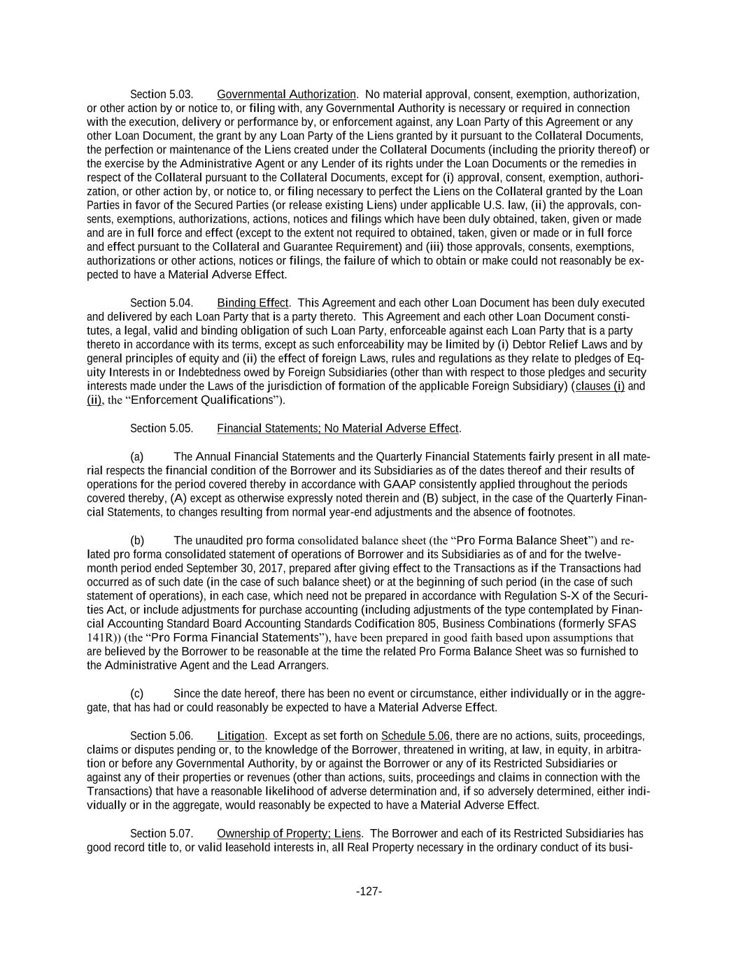 -127- Section 5.03. Governmental Authorization. No material approval, consent, exemption, authorization, or other action by or notice to, or filing with, any Governmental Authority is necessary or required in connection with the execution, delivery or performance by, or enforcement against, any Loan Party of this Agreement or any other Loan Document, the grant by any Loan Party of the Liens granted by it pursuant to the Collateral Documents, the perfection or maintenance of the Liens created under the Collateral Documents (including the priority thereof) or the exercise by the Administrative Agent or any Lender of its rights under the Loan Documents or the remedies in respect of the Collateral pursuant to the Collateral Documents, except for (i) approval, consent, exemption, authori- zation, or other action by, or notice to, or filing necessary to perfect the Liens on the Collateral granted by the Loan Parties in favor of the Secured Parties (or release existing Liens) under applicable U.S. law, (ii) the approvals, con- sents, exemptions, authorizations, actions, notices and filings which have been duly obtained, taken, given or made and are in full force and effect (except to the extent not required to obtained, taken, given or made or in full force and effect pursuant to the Collateral and Guarantee Requirement) and (iii) those approvals, consents, exemptions, authorizations or other actions, notices or filings, the failure of which to obtain or make could not reasonably be ex- pected to have a Material Adverse Effect. Section 5.04. Binding Effect. This Agreement and each other Loan Document has been duly executed and delivered by each Loan Party that is a party thereto. This Agreement and each other Loan Document consti- tutes, a legal, valid and binding obligation of such Loan Party, enforceable against each Loan Party that is a party thereto in accordance with its terms, except as such enforceability may be limited by (i) Debtor Relief Laws and by general principles of equity and (ii) the effect of foreign Laws, rules and regulations as they relate to pledges of Eq- uity Interests in or Indebtedness owed by Foreign Subsidiaries (other than with respect to those pledges and security interests made under the Laws of the jurisdiction of formation of the applicable Foreign Subsidiary) (clauses (i) and (ii), the “Enforcement Qualifications”). Section 5.05. Financial Statements; No Material Adverse Effect. (a) The Annual Financial Statements and the Quarterly Financial Statements fairly present in all mate- rial respects the financial condition of the Borrower and its Subsidiaries as of the dates thereof and their results of operations for the period covered thereby in accordance with GAAP consistently applied throughout the periods covered thereby, (A) except as otherwise expressly noted therein and (B) subject, in the case of the Quarterly Finan- cial Statements, to changes resulting from normal year-end adjustments and the absence of footnotes. (b) The unaudited pro forma consolidated balance sheet (the “Pro Forma Balance Sheet”) and re- lated pro forma consolidated statement of operations of Borrower and its Subsidiaries as of and for the twelve- month period ended September 30, 2017, prepared after giving effect to the Transactions as if the Transactions had occurred as of such date (in the case of such balance sheet) or at the beginning of such period (in the case of such statement of operations), in each case, which need not be prepared in accordance with Regulation S-X of the Securi- ties Act, or include adjustments for purchase accounting (including adjustments of the type contemplated by Finan- cial Accounting Standard Board Accounting Standards Codification 805, Business Combinations (formerly SFAS 141R)) (the “Pro Forma Financial Statements”), have been prepared in good faith based upon assumptions that are believed by the Borrower to be reasonable at the time the related Pro Forma Balance Sheet was so furnished to the Administrative Agent and the Lead Arrangers. (c) Since the date hereof, there has been no event or circumstance, either individually or in the aggre- gate, that has had or could reasonably be expected to have a Material Adverse Effect. Section 5.06. Litigation. Except as set forth on Schedule 5.06, there are no actions, suits, proceedings, claims or disputes pending or, to the knowledge of the Borrower, threatened in writing, at law, in equity, in arbitra- tion or before any Governmental Authority, by or against the Borrower or any of its Restricted Subsidiaries or against any of their properties or revenues (other than actions, suits, proceedings and claims in connection with the Transactions) that have a reasonable likelihood of adverse determination and, if so adversely determined, either indi- vidually or in the aggregate, would reasonably be expected to have a Material Adverse Effect. Section 5.07. Ownership of Property; Liens. The Borrower and each of its Restricted Subsidiaries has good record title to, or valid leasehold interests in, all Real Property necessary in the ordinary conduct of its busi-