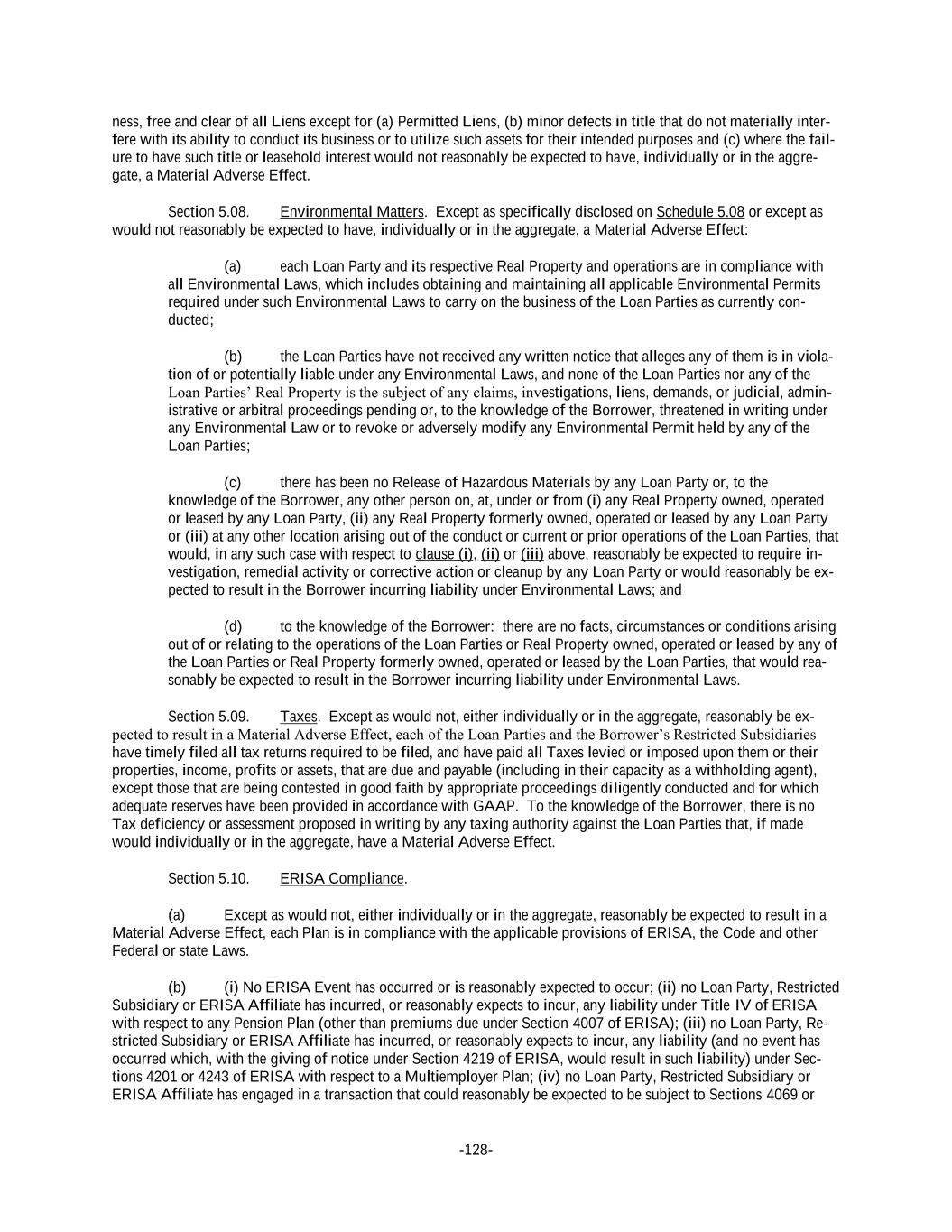 -128- ness, free and clear of all Liens except for (a) Permitted Liens, (b) minor defects in title that do not materially inter- fere with its ability to conduct its business or to utilize such assets for their intended purposes and (c) where the fail- ure to have such title or leasehold interest would not reasonably be expected to have, individually or in the aggre- gate, a Material Adverse Effect. Section 5.08. Environmental Matters. Except as specifically disclosed on Schedule 5.08 or except as would not reasonably be expected to have, individually or in the aggregate, a Material Adverse Effect: (a) each Loan Party and its respective Real Property and operations are in compliance with all Environmental Laws, which includes obtaining and maintaining all applicable Environmental Permits required under such Environmental Laws to carry on the business of the Loan Parties as currently con- ducted; (b) the Loan Parties have not received any written notice that alleges any of them is in viola- tion of or potentially liable under any Environmental Laws, and none of the Loan Parties nor any of the Loan Parties’ Real Property is the subject of any claims, investigations, liens, demands, or judicial, admin- istrative or arbitral proceedings pending or, to the knowledge of the Borrower, threatened in writing under any Environmental Law or to revoke or adversely modify any Environmental Permit held by any of the Loan Parties; (c) there has been no Release of Hazardous Materials by any Loan Party or, to the knowledge of the Borrower, any other person on, at, under or from (i) any Real Property owned, operated or leased by any Loan Party, (ii) any Real Property formerly owned, operated or leased by any Loan Party or (iii) at any other location arising out of the conduct or current or prior operations of the Loan Parties, that would, in any such case with respect to clause (i), (ii) or (iii) above, reasonably be expected to require in- vestigation, remedial activity or corrective action or cleanup by any Loan Party or would reasonably be ex- pected to result in the Borrower incurring liability under Environmental Laws; and (d) to the knowledge of the Borrower: there are no facts, circumstances or conditions arising out of or relating to the operations of the Loan Parties or Real Property owned, operated or leased by any of the Loan Parties or Real Property formerly owned, operated or leased by the Loan Parties, that would rea- sonably be expected to result in the Borrower incurring liability under Environmental Laws. Section 5.09. Taxes. Except as would not, either individually or in the aggregate, reasonably be ex- pected to result in a Material Adverse Effect, each of the Loan Parties and the Borrower’s Restricted Subsidiaries have timely filed all tax returns required to be filed, and have paid all Taxes levied or imposed upon them or their properties, income, profits or assets, that are due and payable (including in their capacity as a withholding agent), except those that are being contested in good faith by appropriate proceedings diligently conducted and for which adequate reserves have been provided in accordance with GAAP. To the knowledge of the Borrower, there is no Tax deficiency or assessment proposed in writing by any taxing authority against the Loan Parties that, if made would individually or in the aggregate, have a Material Adverse Effect. Section 5.10. ERISA Compliance. (a) Except as would not, either individually or in the aggregate, reasonably be expected to result in a Material Adverse Effect, each Plan is in compliance with the applicable provisions of ERISA, the Code and other Federal or state Laws. (b) (i) No ERISA Event has occurred or is reasonably expected to occur; (ii) no Loan Party, Restricted Subsidiary or ERISA Affiliate has incurred, or reasonably expects to incur, any liability under Title IV of ERISA with respect to any Pension Plan (other than premiums due under Section 4007 of ERISA); (iii) no Loan Party, Re- stricted Subsidiary or ERISA Affiliate has incurred, or reasonably expects to incur, any liability (and no event has occurred which, with the giving of notice under Section 4219 of ERISA, would result in such liability) under Sec- tions 4201 or 4243 of ERISA with respect to a Multiemployer Plan; (iv) no Loan Party, Restricted Subsidiary or ERISA Affiliate has engaged in a transaction that could reasonably be expected to be subject to Sections 4069 or