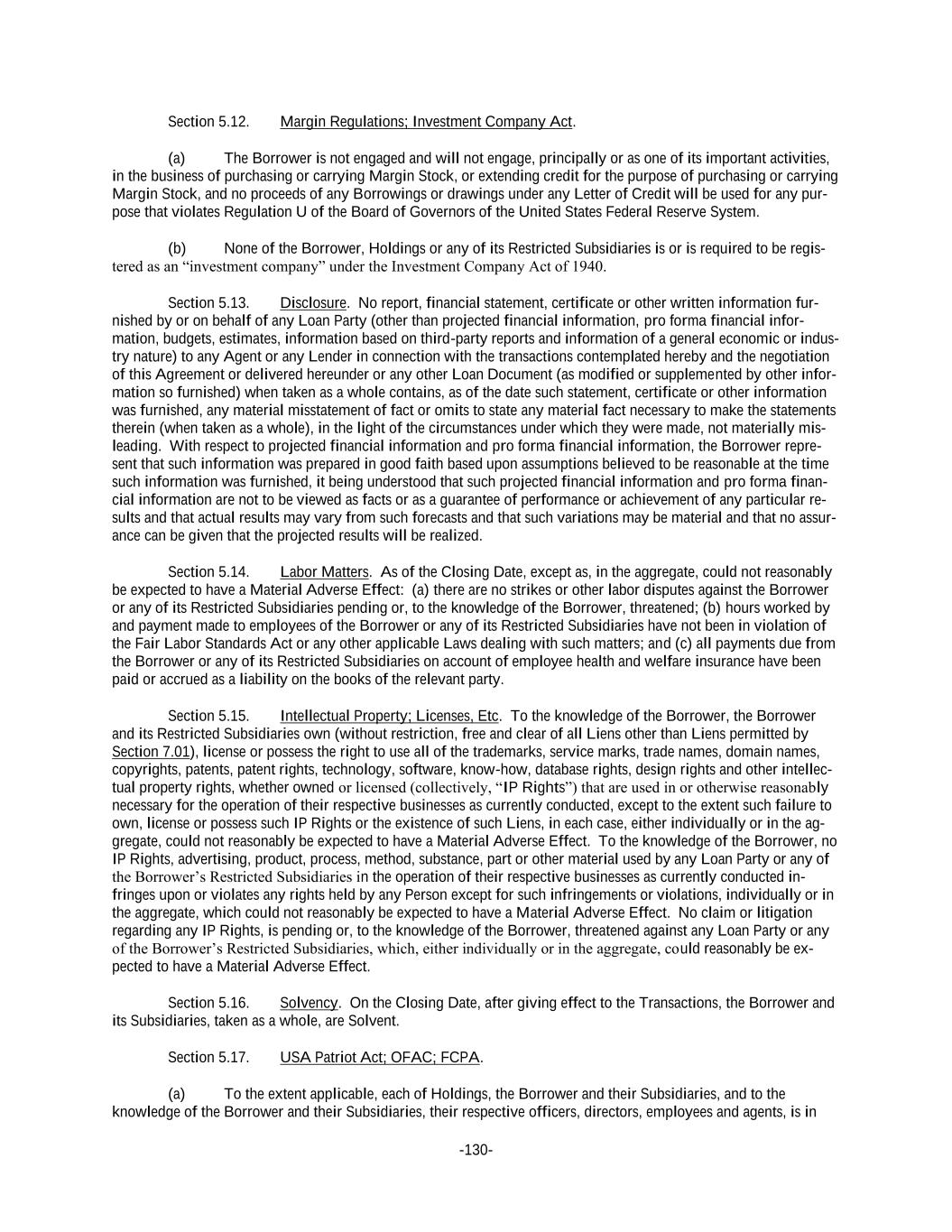 -130- Section 5.12. Margin Regulations; Investment Company Act. (a) The Borrower is not engaged and will not engage, principally or as one of its important activities, in the business of purchasing or carrying Margin Stock, or extending credit for the purpose of purchasing or carrying Margin Stock, and no proceeds of any Borrowings or drawings under any Letter of Credit will be used for any pur- pose that violates Regulation U of the Board of Governors of the United States Federal Reserve System. (b) None of the Borrower, Holdings or any of its Restricted Subsidiaries is or is required to be regis- tered as an “investment company” under the Investment Company Act of 1940. Section 5.13. Disclosure. No report, financial statement, certificate or other written information fur- nished by or on behalf of any Loan Party (other than projected financial information, pro forma financial infor- mation, budgets, estimates, information based on third-party reports and information of a general economic or indus- try nature) to any Agent or any Lender in connection with the transactions contemplated hereby and the negotiation of this Agreement or delivered hereunder or any other Loan Document (as modified or supplemented by other infor- mation so furnished) when taken as a whole contains, as of the date such statement, certificate or other information was furnished, any material misstatement of fact or omits to state any material fact necessary to make the statements therein (when taken as a whole), in the light of the circumstances under which they were made, not materially mis- leading. With respect to projected financial information and pro forma financial information, the Borrower repre- sent that such information was prepared in good faith based upon assumptions believed to be reasonable at the time such information was furnished, it being understood that such projected financial information and pro forma finan- cial information are not to be viewed as facts or as a guarantee of performance or achievement of any particular re- sults and that actual results may vary from such forecasts and that such variations may be material and that no assur- ance can be given that the projected results will be realized. Section 5.14. Labor Matters. As of the Closing Date, except as, in the aggregate, could not reasonably be expected to have a Material Adverse Effect: (a) there are no strikes or other labor disputes against the Borrower or any of its Restricted Subsidiaries pending or, to the knowledge of the Borrower, threatened; (b) hours worked by and payment made to employees of the Borrower or any of its Restricted Subsidiaries have not been in violation of the Fair Labor Standards Act or any other applicable Laws dealing with such matters; and (c) all payments due from the Borrower or any of its Restricted Subsidiaries on account of employee health and welfare insurance have been paid or accrued as a liability on the books of the relevant party. Section 5.15. Intellectual Property; Licenses, Etc. To the knowledge of the Borrower, the Borrower and its Restricted Subsidiaries own (without restriction, free and clear of all Liens other than Liens permitted by Section 7.01), license or possess the right to use all of the trademarks, service marks, trade names, domain names, copyrights, patents, patent rights, technology, software, know-how, database rights, design rights and other intellec- tual property rights, whether owned or licensed (collectively, “IP Rights”) that are used in or otherwise reasonably necessary for the operation of their respective businesses as currently conducted, except to the extent such failure to own, license or possess such IP Rights or the existence of such Liens, in each case, either individually or in the ag- gregate, could not reasonably be expected to have a Material Adverse Effect. To the knowledge of the Borrower, no IP Rights, advertising, product, process, method, substance, part or other material used by any Loan Party or any of the Borrower’s Restricted Subsidiaries in the operation of their respective businesses as currently conducted in- fringes upon or violates any rights held by any Person except for such infringements or violations, individually or in the aggregate, which could not reasonably be expected to have a Material Adverse Effect. No claim or litigation regarding any IP Rights, is pending or, to the knowledge of the Borrower, threatened against any Loan Party or any of the Borrower’s Restricted Subsidiaries, which, either individually or in the aggregate, could reasonably be ex- pected to have a Material Adverse Effect. Section 5.16. Solvency. On the Closing Date, after giving effect to the Transactions, the Borrower and its Subsidiaries, taken as a whole, are Solvent. Section 5.17. USA Patriot Act; OFAC; FCPA. (a) To the extent applicable, each of Holdings, the Borrower and their Subsidiaries, and to the knowledge of the Borrower and their Subsidiaries, their respective officers, directors, employees and agents, is in