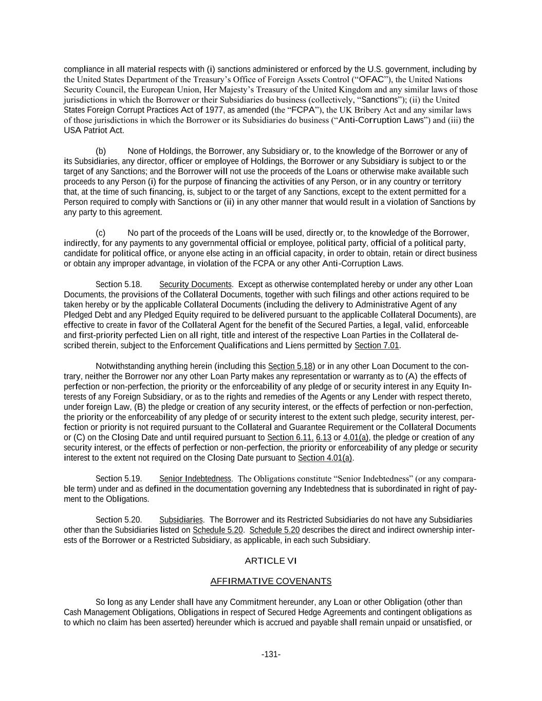 -131- compliance in all material respects with (i) sanctions administered or enforced by the U.S. government, including by the United States Department of the Treasury’s Office of Foreign Assets Control (“OFAC”), the United Nations Security Council, the European Union, Her Majesty’s Treasury of the United Kingdom and any similar laws of those jurisdictions in which the Borrower or their Subsidiaries do business (collectively, “Sanctions”); (ii) the United States Foreign Corrupt Practices Act of 1977, as amended (the “FCPA”), the UK Bribery Act and any similar laws of those jurisdictions in which the Borrower or its Subsidiaries do business (“Anti-Corruption Laws”) and (iii) the USA Patriot Act. (b) None of Holdings, the Borrower, any Subsidiary or, to the knowledge of the Borrower or any of its Subsidiaries, any director, officer or employee of Holdings, the Borrower or any Subsidiary is subject to or the target of any Sanctions; and the Borrower will not use the proceeds of the Loans or otherwise make available such proceeds to any Person (i) for the purpose of financing the activities of any Person, or in any country or territory that, at the time of such financing, is, subject to or the target of any Sanctions, except to the extent permitted for a Person required to comply with Sanctions or (ii) in any other manner that would result in a violation of Sanctions by any party to this agreement. (c) No part of the proceeds of the Loans will be used, directly or, to the knowledge of the Borrower, indirectly, for any payments to any governmental official or employee, political party, official of a political party, candidate for political office, or anyone else acting in an official capacity, in order to obtain, retain or direct business or obtain any improper advantage, in violation of the FCPA or any other Anti-Corruption Laws. Section 5.18. Security Documents. Except as otherwise contemplated hereby or under any other Loan Documents, the provisions of the Collateral Documents, together with such filings and other actions required to be taken hereby or by the applicable Collateral Documents (including the delivery to Administrative Agent of any Pledged Debt and any Pledged Equity required to be delivered pursuant to the applicable Collateral Documents), are effective to create in favor of the Collateral Agent for the benefit of the Secured Parties, a legal, valid, enforceable and first-priority perfected Lien on all right, title and interest of the respective Loan Parties in the Collateral de- scribed therein, subject to the Enforcement Qualifications and Liens permitted by Section 7.01. Notwithstanding anything herein (including this Section 5.18) or in any other Loan Document to the con- trary, neither the Borrower nor any other Loan Party makes any representation or warranty as to (A) the effects of perfection or non-perfection, the priority or the enforceability of any pledge of or security interest in any Equity In- terests of any Foreign Subsidiary, or as to the rights and remedies of the Agents or any Lender with respect thereto, under foreign Law, (B) the pledge or creation of any security interest, or the effects of perfection or non-perfection, the priority or the enforceability of any pledge of or security interest to the extent such pledge, security interest, per- fection or priority is not required pursuant to the Collateral and Guarantee Requirement or the Collateral Documents or (C) on the Closing Date and until required pursuant to Section 6.11, 6.13 or 4.01(a), the pledge or creation of any security interest, or the effects of perfection or non-perfection, the priority or enforceability of any pledge or security interest to the extent not required on the Closing Date pursuant to Section 4.01(a). Section 5.19. Senior Indebtedness. The Obligations constitute “Senior Indebtedness” (or any compara- ble term) under and as defined in the documentation governing any Indebtedness that is subordinated in right of pay- ment to the Obligations. Section 5.20. Subsidiaries. The Borrower and its Restricted Subsidiaries do not have any Subsidiaries other than the Subsidiaries listed on Schedule 5.20. Schedule 5.20 describes the direct and indirect ownership inter- ests of the Borrower or a Restricted Subsidiary, as applicable, in each such Subsidiary. ARTICLE VI AFFIRMATIVE COVENANTS So long as any Lender shall have any Commitment hereunder, any Loan or other Obligation (other than Cash Management Obligations, Obligations in respect of Secured Hedge Agreements and contingent obligations as to which no claim has been asserted) hereunder which is accrued and payable shall remain unpaid or unsatisfied, or