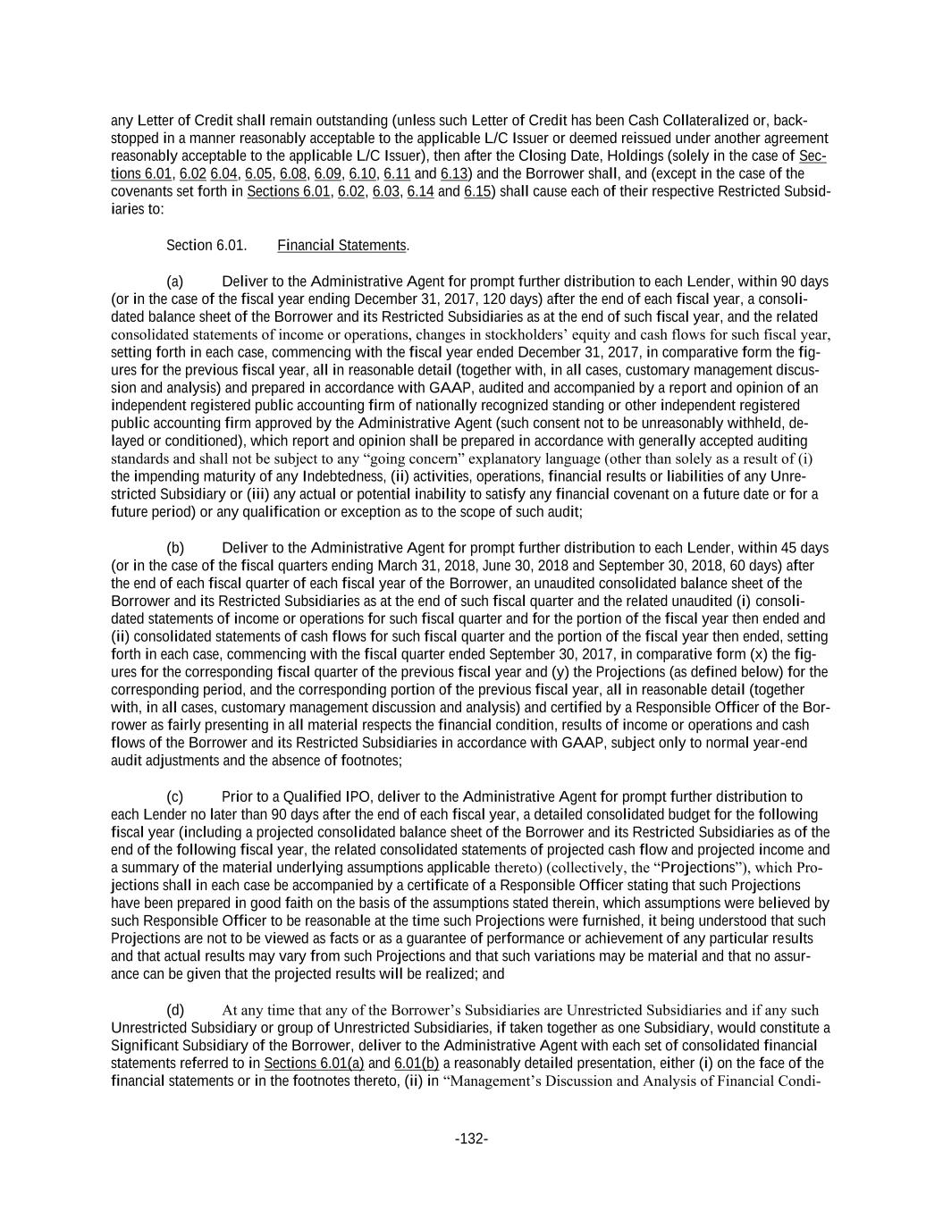 -132- any Letter of Credit shall remain outstanding (unless such Letter of Credit has been Cash Collateralized or, back- stopped in a manner reasonably acceptable to the applicable L/C Issuer or deemed reissued under another agreement reasonably acceptable to the applicable L/C Issuer), then after the Closing Date, Holdings (solely in the case of Sec- tions 6.01, 6.02 6.04, 6.05, 6.08, 6.09, 6.10, 6.11 and 6.13) and the Borrower shall, and (except in the case of the covenants set forth in Sections 6.01, 6.02, 6.03, 6.14 and 6.15) shall cause each of their respective Restricted Subsid- iaries to: Section 6.01. Financial Statements. (a) Deliver to the Administrative Agent for prompt further distribution to each Lender, within 90 days (or in the case of the fiscal year ending December 31, 2017, 120 days) after the end of each fiscal year, a consoli- dated balance sheet of the Borrower and its Restricted Subsidiaries as at the end of such fiscal year, and the related consolidated statements of income or operations, changes in stockholders’ equity and cash flows for such fiscal year, setting forth in each case, commencing with the fiscal year ended December 31, 2017, in comparative form the fig- ures for the previous fiscal year, all in reasonable detail (together with, in all cases, customary management discus- sion and analysis) and prepared in accordance with GAAP, audited and accompanied by a report and opinion of an independent registered public accounting firm of nationally recognized standing or other independent registered public accounting firm approved by the Administrative Agent (such consent not to be unreasonably withheld, de- layed or conditioned), which report and opinion shall be prepared in accordance with generally accepted auditing standards and shall not be subject to any “going concern” explanatory language (other than solely as a result of (i) the impending maturity of any Indebtedness, (ii) activities, operations, financial results or liabilities of any Unre- stricted Subsidiary or (iii) any actual or potential inability to satisfy any financial covenant on a future date or for a future period) or any qualification or exception as to the scope of such audit; (b) Deliver to the Administrative Agent for prompt further distribution to each Lender, within 45 days (or in the case of the fiscal quarters ending March 31, 2018, June 30, 2018 and September 30, 2018, 60 days) after the end of each fiscal quarter of each fiscal year of the Borrower, an unaudited consolidated balance sheet of the Borrower and its Restricted Subsidiaries as at the end of such fiscal quarter and the related unaudited (i) consoli- dated statements of income or operations for such fiscal quarter and for the portion of the fiscal year then ended and (ii) consolidated statements of cash flows for such fiscal quarter and the portion of the fiscal year then ended, setting forth in each case, commencing with the fiscal quarter ended September 30, 2017, in comparative form (x) the fig- ures for the corresponding fiscal quarter of the previous fiscal year and (y) the Projections (as defined below) for the corresponding period, and the corresponding portion of the previous fiscal year, all in reasonable detail (together with, in all cases, customary management discussion and analysis) and certified by a Responsible Officer of the Bor- rower as fairly presenting in all material respects the financial condition, results of income or operations and cash flows of the Borrower and its Restricted Subsidiaries in accordance with GAAP, subject only to normal year-end audit adjustments and the absence of footnotes; (c) Prior to a Qualified IPO, deliver to the Administrative Agent for prompt further distribution to each Lender no later than 90 days after the end of each fiscal year, a detailed consolidated budget for the following fiscal year (including a projected consolidated balance sheet of the Borrower and its Restricted Subsidiaries as of the end of the following fiscal year, the related consolidated statements of projected cash flow and projected income and a summary of the material underlying assumptions applicable thereto) (collectively, the “Projections”), which Pro- jections shall in each case be accompanied by a certificate of a Responsible Officer stating that such Projections have been prepared in good faith on the basis of the assumptions stated therein, which assumptions were believed by such Responsible Officer to be reasonable at the time such Projections were furnished, it being understood that such Projections are not to be viewed as facts or as a guarantee of performance or achievement of any particular results and that actual results may vary from such Projections and that such variations may be material and that no assur- ance can be given that the projected results will be realized; and (d) At any time that any of the Borrower’s Subsidiaries are Unrestricted Subsidiaries and if any such Unrestricted Subsidiary or group of Unrestricted Subsidiaries, if taken together as one Subsidiary, would constitute a Significant Subsidiary of the Borrower, deliver to the Administrative Agent with each set of consolidated financial statements referred to in Sections 6.01(a) and 6.01(b) a reasonably detailed presentation, either (i) on the face of the financial statements or in the footnotes thereto, (ii) in “Management’s Discussion and Analysis of Financial Condi-