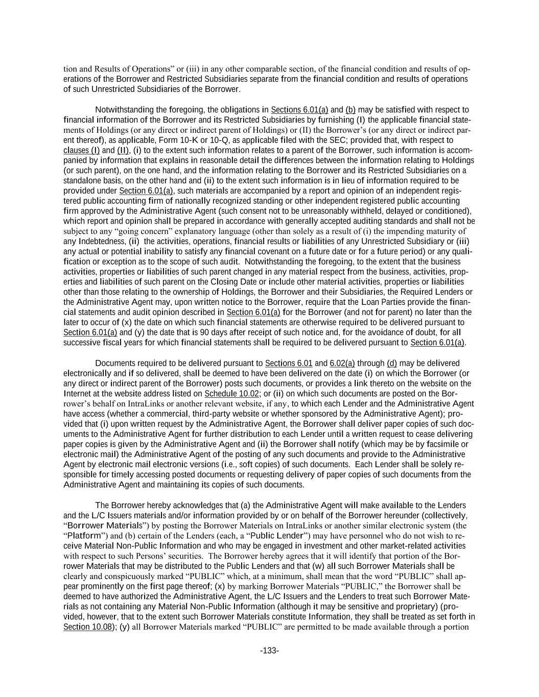 -133- tion and Results of Operations” or (iii) in any other comparable section, of the financial condition and results of op- erations of the Borrower and Restricted Subsidiaries separate from the financial condition and results of operations of such Unrestricted Subsidiaries of the Borrower. Notwithstanding the foregoing, the obligations in Sections 6.01(a) and (b) may be satisfied with respect to financial information of the Borrower and its Restricted Subsidiaries by furnishing (I) the applicable financial state- ments of Holdings (or any direct or indirect parent of Holdings) or (II) the Borrower’s (or any direct or indirect par- ent thereof), as applicable, Form 10-K or 10-Q, as applicable filed with the SEC; provided that, with respect to clauses (I) and (II), (i) to the extent such information relates to a parent of the Borrower, such information is accom- panied by information that explains in reasonable detail the differences between the information relating to Holdings (or such parent), on the one hand, and the information relating to the Borrower and its Restricted Subsidiaries on a standalone basis, on the other hand and (ii) to the extent such information is in lieu of information required to be provided under Section 6.01(a), such materials are accompanied by a report and opinion of an independent regis- tered public accounting firm of nationally recognized standing or other independent registered public accounting firm approved by the Administrative Agent (such consent not to be unreasonably withheld, delayed or conditioned), which report and opinion shall be prepared in accordance with generally accepted auditing standards and shall not be subject to any “going concern” explanatory language (other than solely as a result of (i) the impending maturity of any Indebtedness, (ii) the activities, operations, financial results or liabilities of any Unrestricted Subsidiary or (iii) any actual or potential inability to satisfy any financial covenant on a future date or for a future period) or any quali- fication or exception as to the scope of such audit. Notwithstanding the foregoing, to the extent that the business activities, properties or liabilities of such parent changed in any material respect from the business, activities, prop- erties and liabilities of such parent on the Closing Date or include other material activities, properties or liabilities other than those relating to the ownership of Holdings, the Borrower and their Subsidiaries, the Required Lenders or the Administrative Agent may, upon written notice to the Borrower, require that the Loan Parties provide the finan- cial statements and audit opinion described in Section 6.01(a) for the Borrower (and not for parent) no later than the later to occur of (x) the date on which such financial statements are otherwise required to be delivered pursuant to Section 6.01(a) and (y) the date that is 90 days after receipt of such notice and, for the avoidance of doubt, for all successive fiscal years for which financial statements shall be required to be delivered pursuant to Section 6.01(a). Documents required to be delivered pursuant to Sections 6.01 and 6.02(a) through (d) may be delivered electronically and if so delivered, shall be deemed to have been delivered on the date (i) on which the Borrower (or any direct or indirect parent of the Borrower) posts such documents, or provides a link thereto on the website on the Internet at the website address listed on Schedule 10.02; or (ii) on which such documents are posted on the Bor- rower’s behalf on IntraLinks or another relevant website, if any, to which each Lender and the Administrative Agent have access (whether a commercial, third-party website or whether sponsored by the Administrative Agent); pro- vided that (i) upon written request by the Administrative Agent, the Borrower shall deliver paper copies of such doc- uments to the Administrative Agent for further distribution to each Lender until a written request to cease delivering paper copies is given by the Administrative Agent and (ii) the Borrower shall notify (which may be by facsimile or electronic mail) the Administrative Agent of the posting of any such documents and provide to the Administrative Agent by electronic mail electronic versions (i.e., soft copies) of such documents. Each Lender shall be solely re- sponsible for timely accessing posted documents or requesting delivery of paper copies of such documents from the Administrative Agent and maintaining its copies of such documents. The Borrower hereby acknowledges that (a) the Administrative Agent will make available to the Lenders and the L/C Issuers materials and/or information provided by or on behalf of the Borrower hereunder (collectively, “Borrower Materials”) by posting the Borrower Materials on IntraLinks or another similar electronic system (the “Platform”) and (b) certain of the Lenders (each, a “Public Lender”) may have personnel who do not wish to re- ceive Material Non-Public Information and who may be engaged in investment and other market-related activities with respect to such Persons’ securities. The Borrower hereby agrees that it will identify that portion of the Bor- rower Materials that may be distributed to the Public Lenders and that (w) all such Borrower Materials shall be clearly and conspicuously marked “PUBLIC” which, at a minimum, shall mean that the word “PUBLIC” shall ap- pear prominently on the first page thereof; (x) by marking Borrower Materials “PUBLIC,” the Borrower shall be deemed to have authorized the Administrative Agent, the L/C Issuers and the Lenders to treat such Borrower Mate- rials as not containing any Material Non-Public Information (although it may be sensitive and proprietary) (pro- vided, however, that to the extent such Borrower Materials constitute Information, they shall be treated as set forth in Section 10.08); (y) all Borrower Materials marked “PUBLIC” are pe