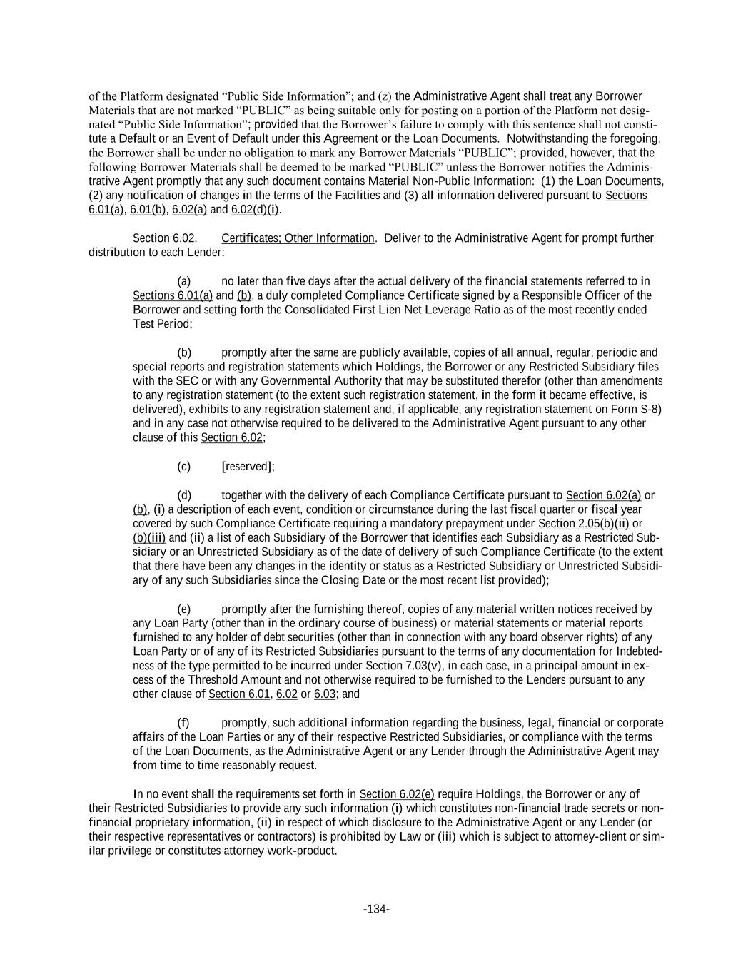 -134- of the Platform designated “Public Side Information”; and (z) the Administrative Agent shall treat any Borrower Materials that are not marked “PUBLIC” as being suitable only for posting on a portion of the Platform not desig- nated “Public Side Information”; provided that the Borrower’s failure to comply with this sentence shall not consti- tute a Default or an Event of Default under this Agreement or the Loan Documents. Notwithstanding the foregoing, the Borrower shall be under no obligation to mark any Borrower Materials “PUBLIC”; provided, however, that the following Borrower Materials shall be deemed to be marked “PUBLIC” unless the Borrower notifies the Adminis- trative Agent promptly that any such document contains Material Non-Public Information: (1) the Loan Documents, (2) any notification of changes in the terms of the Facilities and (3) all information delivered pursuant to Sections 6.01(a), 6.01(b), 6.02(a) and 6.02(d)(i). Section 6.02. Certificates; Other Information. Deliver to the Administrative Agent for prompt further distribution to each Lender: (a) no later than five days after the actual delivery of the financial statements referred to in Sections 6.01(a) and (b), a duly completed Compliance Certificate signed by a Responsible Officer of the Borrower and setting forth the Consolidated First Lien Net Leverage Ratio as of the most recently ended Test Period; (b) promptly after the same are publicly available, copies of all annual, regular, periodic and special reports and registration statements which Holdings, the Borrower or any Restricted Subsidiary files with the SEC or with any Governmental Authority that may be substituted therefor (other than amendments to any registration statement (to the extent such registration statement, in the form it became effective, is delivered), exhibits to any registration statement and, if applicable, any registration statement on Form S-8) and in any case not otherwise required to be delivered to the Administrative Agent pursuant to any other clause of this Section 6.02; (c) [reserved]; (d) together with the delivery of each Compliance Certificate pursuant to Section 6.02(a) or (b), (i) a description of each event, condition or circumstance during the last fiscal quarter or fiscal year covered by such Compliance Certificate requiring a mandatory prepayment under Section 2.05(b)(ii) or (b)(iii) and (ii) a list of each Subsidiary of the Borrower that identifies each Subsidiary as a Restricted Sub- sidiary or an Unrestricted Subsidiary as of the date of delivery of such Compliance Certificate (to the extent that there have been any changes in the identity or status as a Restricted Subsidiary or Unrestricted Subsidi- ary of any such Subsidiaries since the Closing Date or the most recent list provided); (e) promptly after the furnishing thereof, copies of any material written notices received by any Loan Party (other than in the ordinary course of business) or material statements or material reports furnished to any holder of debt securities (other than in connection with any board observer rights) of any Loan Party or of any of its Restricted Subsidiaries pursuant to the terms of any documentation for Indebted- ness of the type permitted to be incurred under Section 7.03(v), in each case, in a principal amount in ex- cess of the Threshold Amount and not otherwise required to be furnished to the Lenders pursuant to any other clause of Section 6.01, 6.02 or 6.03; and (f) promptly, such additional information regarding the business, legal, financial or corporate affairs of the Loan Parties or any of their respective Restricted Subsidiaries, or compliance with the terms of the Loan Documents, as the Administrative Agent or any Lender through the Administrative Agent may from time to time reasonably request. In no event shall the requirements set forth in Section 6.02(e) require Holdings, the Borrower or any of their Restricted Subsidiaries to provide any such information (i) which constitutes non-financial trade secrets or non- financial proprietary information, (ii) in respect of which disclosure to the Administrative Agent or any Lender (or their respective representatives or contractors) is prohibited by Law or (iii) which is subject to attorney-client or sim- ilar privilege or constitutes attorney work-product.