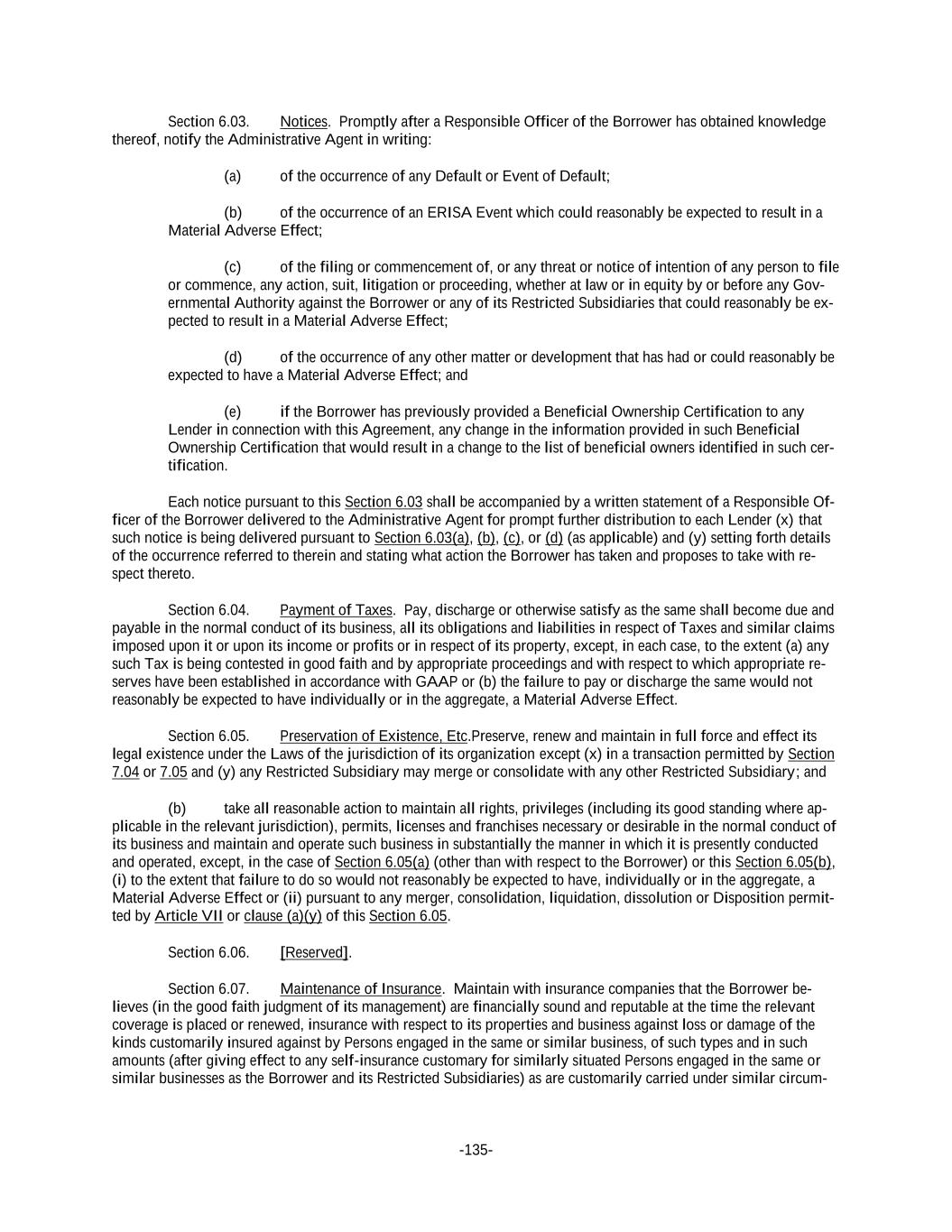 -135- Section 6.03. Notices. Promptly after a Responsible Officer of the Borrower has obtained knowledge thereof, notify the Administrative Agent in writing: (a) of the occurrence of any Default or Event of Default; (b) of the occurrence of an ERISA Event which could reasonably be expected to result in a Material Adverse Effect; (c) of the filing or commencement of, or any threat or notice of intention of any person to file or commence, any action, suit, litigation or proceeding, whether at law or in equity by or before any Gov- ernmental Authority against the Borrower or any of its Restricted Subsidiaries that could reasonably be ex- pected to result in a Material Adverse Effect; (d) of the occurrence of any other matter or development that has had or could reasonably be expected to have a Material Adverse Effect; and (e) if the Borrower has previously provided a Beneficial Ownership Certification to any Lender in connection with this Agreement, any change in the information provided in such Beneficial Ownership Certification that would result in a change to the list of beneficial owners identified in such cer- tification. Each notice pursuant to this Section 6.03 shall be accompanied by a written statement of a Responsible Of- ficer of the Borrower delivered to the Administrative Agent for prompt further distribution to each Lender (x) that such notice is being delivered pursuant to Section 6.03(a), (b), (c), or (d) (as applicable) and (y) setting forth details of the occurrence referred to therein and stating what action the Borrower has taken and proposes to take with re- spect thereto. Section 6.04. Payment of Taxes. Pay, discharge or otherwise satisfy as the same shall become due and payable in the normal conduct of its business, all its obligations and liabilities in respect of Taxes and similar claims imposed upon it or upon its income or profits or in respect of its property, except, in each case, to the extent (a) any such Tax is being contested in good faith and by appropriate proceedings and with respect to which appropriate re- serves have been established in accordance with GAAP or (b) the failure to pay or discharge the same would not reasonably be expected to have individually or in the aggregate, a Material Adverse Effect. Section 6.05. Preservation of Existence, Etc.Preserve, renew and maintain in full force and effect its legal existence under the Laws of the jurisdiction of its organization except (x) in a transaction permitted by Section 7.04 or 7.05 and (y) any Restricted Subsidiary may merge or consolidate with any other Restricted Subsidiary; and (b) take all reasonable action to maintain all rights, privileges (including its good standing where ap- plicable in the relevant jurisdiction), permits, licenses and franchises necessary or desirable in the normal conduct of its business and maintain and operate such business in substantially the manner in which it is presently conducted and operated, except, in the case of Section 6.05(a) (other than with respect to the Borrower) or this Section 6.05(b), (i) to the extent that failure to do so would not reasonably be expected to have, individually or in the aggregate, a Material Adverse Effect or (ii) pursuant to any merger, consolidation, liquidation, dissolution or Disposition permit- ted by Article VII or clause (a)(y) of this Section 6.05. Section 6.06. [Reserved]. Section 6.07. Maintenance of Insurance. Maintain with insurance companies that the Borrower be- lieves (in the good faith judgment of its management) are financially sound and reputable at the time the relevant coverage is placed or renewed, insurance with respect to its properties and business against loss or damage of the kinds customarily insured against by Persons engaged in the same or similar business, of such types and in such amounts (after giving effect to any self-insurance customary for similarly situated Persons engaged in the same or similar businesses as the Borrower and its Restricted Subsidiaries) as are customarily carried under similar circum-