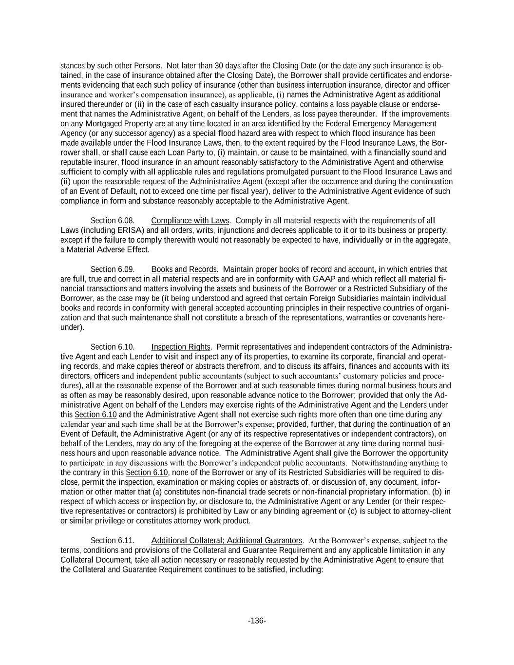 -136- stances by such other Persons. Not later than 30 days after the Closing Date (or the date any such insurance is ob- tained, in the case of insurance obtained after the Closing Date), the Borrower shall provide certificates and endorse- ments evidencing that each such policy of insurance (other than business interruption insurance, director and officer insurance and worker’s compensation insurance), as applicable, (i) names the Administrative Agent as additional insured thereunder or (ii) in the case of each casualty insurance policy, contains a loss payable clause or endorse- ment that names the Administrative Agent, on behalf of the Lenders, as loss payee thereunder. If the improvements on any Mortgaged Property are at any time located in an area identified by the Federal Emergency Management Agency (or any successor agency) as a special flood hazard area with respect to which flood insurance has been made available under the Flood Insurance Laws, then, to the extent required by the Flood Insurance Laws, the Bor- rower shall, or shall cause each Loan Party to, (i) maintain, or cause to be maintained, with a financially sound and reputable insurer, flood insurance in an amount reasonably satisfactory to the Administrative Agent and otherwise sufficient to comply with all applicable rules and regulations promulgated pursuant to the Flood Insurance Laws and (ii) upon the reasonable request of the Administrative Agent (except after the occurrence and during the continuation of an Event of Default, not to exceed one time per fiscal year), deliver to the Administrative Agent evidence of such compliance in form and substance reasonably acceptable to the Administrative Agent. Section 6.08. Compliance with Laws. Comply in all material respects with the requirements of all Laws (including ERISA) and all orders, writs, injunctions and decrees applicable to it or to its business or property, except if the failure to comply therewith would not reasonably be expected to have, individually or in the aggregate, a Material Adverse Effect. Section 6.09. Books and Records. Maintain proper books of record and account, in which entries that are full, true and correct in all material respects and are in conformity with GAAP and which reflect all material fi- nancial transactions and matters involving the assets and business of the Borrower or a Restricted Subsidiary of the Borrower, as the case may be (it being understood and agreed that certain Foreign Subsidiaries maintain individual books and records in conformity with general accepted accounting principles in their respective countries of organi- zation and that such maintenance shall not constitute a breach of the representations, warranties or covenants here- under). Section 6.10. Inspection Rights. Permit representatives and independent contractors of the Administra- tive Agent and each Lender to visit and inspect any of its properties, to examine its corporate, financial and operat- ing records, and make copies thereof or abstracts therefrom, and to discuss its affairs, finances and accounts with its directors, officers and independent public accountants (subject to such accountants’ customary policies and proce- dures), all at the reasonable expense of the Borrower and at such reasonable times during normal business hours and as often as may be reasonably desired, upon reasonable advance notice to the Borrower; provided that only the Ad- ministrative Agent on behalf of the Lenders may exercise rights of the Administrative Agent and the Lenders under this Section 6.10 and the Administrative Agent shall not exercise such rights more often than one time during any calendar year and such time shall be at the Borrower’s expense; provided, further, that during the continuation of an Event of Default, the Administrative Agent (or any of its respective representatives or independent contractors), on behalf of the Lenders, may do any of the foregoing at the expense of the Borrower at any time during normal busi- ness hours and upon reasonable advance notice. The Administrative Agent shall give the Borrower the opportunity to participate in any discussions with the Borrower’s independent public accountants. Notwithstanding anything to the contrary in this Section 6.10, none of the Borrower or any of its Restricted Subsidiaries will be required to dis- close, permit the inspection, examination or making copies or abstracts of, or discussion of, any document, infor- mation or other matter that (a) constitutes non-financial trade secrets or non-financial proprietary information, (b) in respect of which access or inspection by, or disclosure to, the Administrative Agent or any Lender (or their respec- tive representatives or contractors) is prohibited by Law or any binding agreement or (c) is subject to attorney-client or similar privilege or constitutes attorney work product. Section 6.11. Additional Collateral; Additional Guarantors. At the Borrower’s expense, subject to the terms, conditions and provisions of the Collateral and Guarantee Requirement and any applicable limitation in any Collateral Document, take all action necessary or reasonably requested by the Administrative Agent to ensure that the Collateral and Guarantee Requirement continues to be satisfied, including: