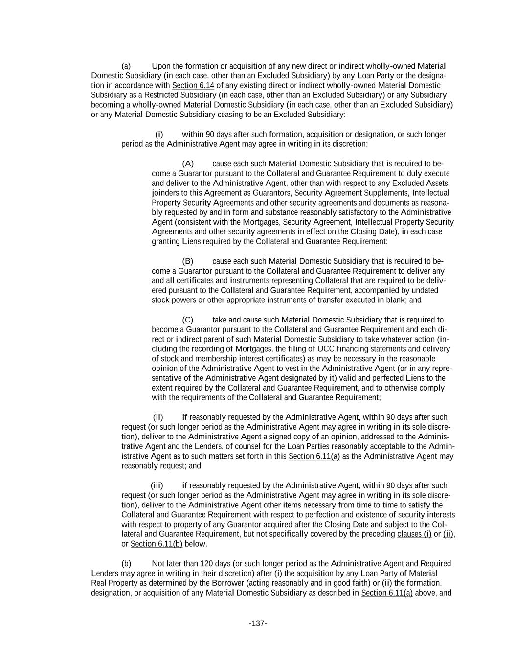 -137- (a) Upon the formation or acquisition of any new direct or indirect wholly-owned Material Domestic Subsidiary (in each case, other than an Excluded Subsidiary) by any Loan Party or the designa- tion in accordance with Section 6.14 of any existing direct or indirect wholly-owned Material Domestic Subsidiary as a Restricted Subsidiary (in each case, other than an Excluded Subsidiary) or any Subsidiary becoming a wholly-owned Material Domestic Subsidiary (in each case, other than an Excluded Subsidiary) or any Material Domestic Subsidiary ceasing to be an Excluded Subsidiary: (i) within 90 days after such formation, acquisition or designation, or such longer period as the Administrative Agent may agree in writing in its discretion: (A) cause each such Material Domestic Subsidiary that is required to be- come a Guarantor pursuant to the Collateral and Guarantee Requirement to duly execute and deliver to the Administrative Agent, other than with respect to any Excluded Assets, joinders to this Agreement as Guarantors, Security Agreement Supplements, Intellectual Property Security Agreements and other security agreements and documents as reasona- bly requested by and in form and substance reasonably satisfactory to the Administrative Agent (consistent with the Mortgages, Security Agreement, Intellectual Property Security Agreements and other security agreements in effect on the Closing Date), in each case granting Liens required by the Collateral and Guarantee Requirement; (B) cause each such Material Domestic Subsidiary that is required to be- come a Guarantor pursuant to the Collateral and Guarantee Requirement to deliver any and all certificates and instruments representing Collateral that are required to be deliv- ered pursuant to the Collateral and Guarantee Requirement, accompanied by undated stock powers or other appropriate instruments of transfer executed in blank; and (C) take and cause such Material Domestic Subsidiary that is required to become a Guarantor pursuant to the Collateral and Guarantee Requirement and each di- rect or indirect parent of such Material Domestic Subsidiary to take whatever action (in- cluding the recording of Mortgages, the filing of UCC financing statements and delivery of stock and membership interest certificates) as may be necessary in the reasonable opinion of the Administrative Agent to vest in the Administrative Agent (or in any repre- sentative of the Administrative Agent designated by it) valid and perfected Liens to the extent required by the Collateral and Guarantee Requirement, and to otherwise comply with the requirements of the Collateral and Guarantee Requirement; (ii) if reasonably requested by the Administrative Agent, within 90 days after such request (or such longer period as the Administrative Agent may agree in writing in its sole discre- tion), deliver to the Administrative Agent a signed copy of an opinion, addressed to the Adminis- trative Agent and the Lenders, of counsel for the Loan Parties reasonably acceptable to the Admin- istrative Agent as to such matters set forth in this Section 6.11(a) as the Administrative Agent may reasonably request; and (iii) if reasonably requested by the Administrative Agent, within 90 days after such request (or such longer period as the Administrative Agent may agree in writing in its sole discre- tion), deliver to the Administrative Agent other items necessary from time to time to satisfy the Collateral and Guarantee Requirement with respect to perfection and existence of security interests with respect to property of any Guarantor acquired after the Closing Date and subject to the Col- lateral and Guarantee Requirement, but not specifically covered by the preceding clauses (i) or (ii), or Section 6.11(b) below. (b) Not later than 120 days (or such longer period as the Administrative Agent and Required Lenders may agree in writing in their discretion) after (i) the acquisition by any Loan Party of Material Real Property as determined by the Borrower (acting reasonably and in good faith) or (ii) the formation, designation, or acquisition of any Material Domestic Subsidiary as described in Section 6.11(a) above, and