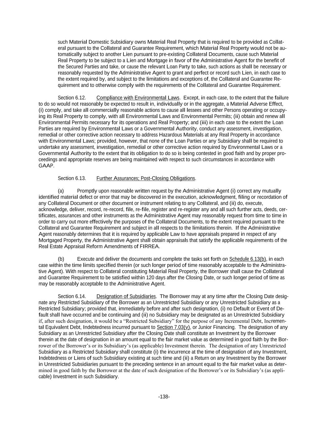 -138- such Material Domestic Subsidiary owns Material Real Property that is required to be provided as Collat- eral pursuant to the Collateral and Guarantee Requirement, which Material Real Property would not be au- tomatically subject to another Lien pursuant to pre-existing Collateral Documents, cause such Material Real Property to be subject to a Lien and Mortgage in favor of the Administrative Agent for the benefit of the Secured Parties and take, or cause the relevant Loan Party to take, such actions as shall be necessary or reasonably requested by the Administrative Agent to grant and perfect or record such Lien, in each case to the extent required by, and subject to the limitations and exceptions of, the Collateral and Guarantee Re- quirement and to otherwise comply with the requirements of the Collateral and Guarantee Requirement. Section 6.12. Compliance with Environmental Laws. Except, in each case, to the extent that the failure to do so would not reasonably be expected to result in, individually or in the aggregate, a Material Adverse Effect, (i) comply, and take all commercially reasonable actions to cause all lessees and other Persons operating or occupy- ing its Real Property to comply, with all Environmental Laws and Environmental Permits; (ii) obtain and renew all Environmental Permits necessary for its operations and Real Property; and (iii) in each case to the extent the Loan Parties are required by Environmental Laws or a Governmental Authority, conduct any assessment, investigation, remedial or other corrective action necessary to address Hazardous Materials at any Real Property in accordance with Environmental Laws; provided, however, that none of the Loan Parties or any Subsidiary shall be required to undertake any assessment, investigation, remedial or other corrective action required by Environmental Laws or a Governmental Authority to the extent that its obligation to do so is being contested in good faith and by proper pro- ceedings and appropriate reserves are being maintained with respect to such circumstances in accordance with GAAP. Section 6.13. Further Assurances; Post-Closing Obligations. (a) Promptly upon reasonable written request by the Administrative Agent (i) correct any mutually identified material defect or error that may be discovered in the execution, acknowledgment, filing or recordation of any Collateral Document or other document or instrument relating to any Collateral, and (ii) do, execute, acknowledge, deliver, record, re-record, file, re-file, register and re-register any and all such further acts, deeds, cer- tificates, assurances and other instruments as the Administrative Agent may reasonably request from time to time in order to carry out more effectively the purposes of the Collateral Documents, to the extent required pursuant to the Collateral and Guarantee Requirement and subject in all respects to the limitations therein. If the Administrative Agent reasonably determines that it is required by applicable Law to have appraisals prepared in respect of any Mortgaged Property, the Administrative Agent shall obtain appraisals that satisfy the applicable requirements of the Real Estate Appraisal Reform Amendments of FIRREA. (b) Execute and deliver the documents and complete the tasks set forth on Schedule 6.13(b), in each case within the time limits specified therein (or such longer period of time reasonably acceptable to the Administra- tive Agent). With respect to Collateral constituting Material Real Property, the Borrower shall cause the Collateral and Guarantee Requirement to be satisfied within 120 days after the Closing Date, or such longer period of time as may be reasonably acceptable to the Administrative Agent. Section 6.14. Designation of Subsidiaries. The Borrower may at any time after the Closing Date desig- nate any Restricted Subsidiary of the Borrower as an Unrestricted Subsidiary or any Unrestricted Subsidiary as a Restricted Subsidiary; provided that, immediately before and after such designation, (i) no Default or Event of De- fault shall have occurred and be continuing and (ii) no Subsidiary may be designated as an Unrestricted Subsidiary if, after such designation, it would be a “Restricted Subsidiary” for the purpose of any Incremental Debt, Incremen- tal Equivalent Debt, Indebtedness incurred pursuant to Section 7.03(v), or Junior Financing. The designation of any Subsidiary as an Unrestricted Subsidiary after the Closing Date shall constitute an Investment by the Borrower therein at the date of designation in an amount equal to the fair market value as determined in good faith by the Bor- rower of the Borrower’s or its Subsidiary’s (as applicable) Investment therein. The designation of any Unrestricted Subsidiary as a Restricted Subsidiary shall constitute (i) the incurrence at the time of designation of any Investment, Indebtedness or Liens of such Subsidiary existing at such time and (ii) a Return on any Investment by the Borrower in Unrestricted Subsidiaries pursuant to the preceding sentence in an amount equal to the fair market value as deter- mined in good faith by the Borrower at the date of such designation of the Borrower’s or its Subsidiary’s (as appli- cable) Investment in such Subsidiary.