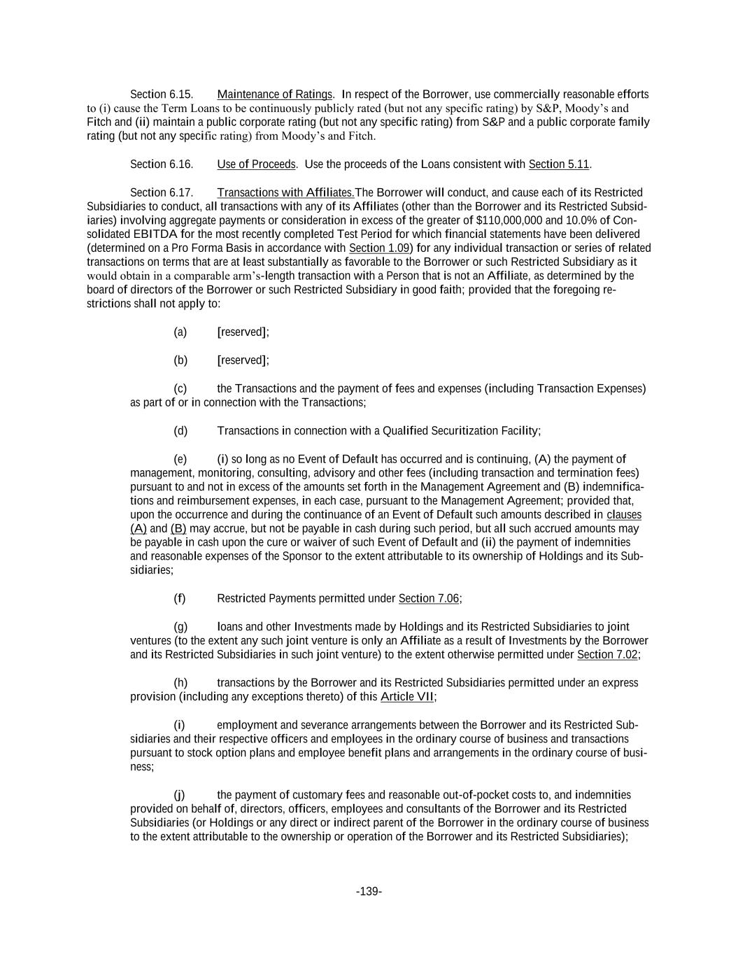 -139- Section 6.15. Maintenance of Ratings. In respect of the Borrower, use commercially reasonable efforts to (i) cause the Term Loans to be continuously publicly rated (but not any specific rating) by S&P, Moody’s and Fitch and (ii) maintain a public corporate rating (but not any specific rating) from S&P and a public corporate family rating (but not any specific rating) from Moody’s and Fitch. Section 6.16. Use of Proceeds. Use the proceeds of the Loans consistent with Section 5.11. Section 6.17. Transactions with Affiliates.The Borrower will conduct, and cause each of its Restricted Subsidiaries to conduct, all transactions with any of its Affiliates (other than the Borrower and its Restricted Subsid- iaries) involving aggregate payments or consideration in excess of the greater of $110,000,000 and 10.0% of Con- solidated EBITDA for the most recently completed Test Period for which financial statements have been delivered (determined on a Pro Forma Basis in accordance with Section 1.09) for any individual transaction or series of related transactions on terms that are at least substantially as favorable to the Borrower or such Restricted Subsidiary as it would obtain in a comparable arm’s-length transaction with a Person that is not an Affiliate, as determined by the board of directors of the Borrower or such Restricted Subsidiary in good faith; provided that the foregoing re- strictions shall not apply to: (a) [reserved]; (b) [reserved]; (c) the Transactions and the payment of fees and expenses (including Transaction Expenses) as part of or in connection with the Transactions; (d) Transactions in connection with a Qualified Securitization Facility; (e) (i) so long as no Event of Default has occurred and is continuing, (A) the payment of management, monitoring, consulting, advisory and other fees (including transaction and termination fees) pursuant to and not in excess of the amounts set forth in the Management Agreement and (B) indemnifica- tions and reimbursement expenses, in each case, pursuant to the Management Agreement; provided that, upon the occurrence and during the continuance of an Event of Default such amounts described in clauses (A) and (B) may accrue, but not be payable in cash during such period, but all such accrued amounts may be payable in cash upon the cure or waiver of such Event of Default and (ii) the payment of indemnities and reasonable expenses of the Sponsor to the extent attributable to its ownership of Holdings and its Sub- sidiaries; (f) Restricted Payments permitted under Section 7.06; (g) loans and other Investments made by Holdings and its Restricted Subsidiaries to joint ventures (to the extent any such joint venture is only an Affiliate as a result of Investments by the Borrower and its Restricted Subsidiaries in such joint venture) to the extent otherwise permitted under Section 7.02; (h) transactions by the Borrower and its Restricted Subsidiaries permitted under an express provision (including any exceptions thereto) of this Article VII; (i) employment and severance arrangements between the Borrower and its Restricted Sub- sidiaries and their respective officers and employees in the ordinary course of business and transactions pursuant to stock option plans and employee benefit plans and arrangements in the ordinary course of busi- ness; (j) the payment of customary fees and reasonable out-of-pocket costs to, and indemnities provided on behalf of, directors, officers, employees and consultants of the Borrower and its Restricted Subsidiaries (or Holdings or any direct or indirect parent of the Borrower in the ordinary course of business to the extent attributable to the ownership or operation of the Borrower and its Restricted Subsidiaries);