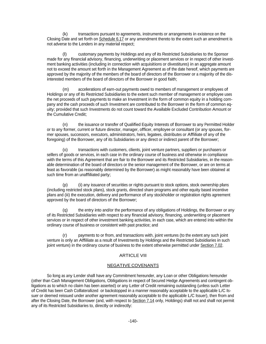 -140- (k) transactions pursuant to agreements, instruments or arrangements in existence on the Closing Date and set forth on Schedule 6.17 or any amendment thereto to the extent such an amendment is not adverse to the Lenders in any material respect; (l) customary payments by Holdings and any of its Restricted Subsidiaries to the Sponsor made for any financial advisory, financing, underwriting or placement services or in respect of other invest- ment banking activities (including in connection with acquisitions or divestitures) in an aggregate amount not to exceed the amount set forth in the Management Agreement as of the date hereof, which payments are approved by the majority of the members of the board of directors of the Borrower or a majority of the dis- interested members of the board of directors of the Borrower in good faith; (m) accelerations of earn-out payments owed to members of management or employees of Holdings or any of its Restricted Subsidiaries to the extent such member of management or employee uses the net proceeds of such payments to make an Investment in the form of common equity in a holding com- pany and the cash proceeds of such Investment are contributed to the Borrower in the form of common eq- uity; provided that such Investments do not count toward the Available Excluded Contribution Amount or the Cumulative Credit; (n) the issuance or transfer of Qualified Equity Interests of Borrower to any Permitted Holder or to any former, current or future director, manager, officer, employee or consultant (or any spouses, for- mer spouses, successors, executors, administrators, heirs, legatees, distributes or Affiliate of any of the foregoing) of the Borrower, any of its Subsidiaries or any direct or indirect parent of the Borrower; (o) transactions with customers, clients, joint venture partners, suppliers or purchasers or sellers of goods or services, in each case in the ordinary course of business and otherwise in compliance with the terms of this Agreement that are fair to the Borrower and its Restricted Subsidiaries, in the reason- able determination of the board of directors or the senior management of the Borrower, or are on terms at least as favorable (as reasonably determined by the Borrower) as might reasonably have been obtained at such time from an unaffiliated party; (p) (i) any issuance of securities or rights pursuant to stock options, stock ownership plans (including restricted stock plans), stock grants, directed share programs and other equity based incentive plans and (ii) the execution, delivery and performance of any stockholder or registration rights agreement approved by the board of directors of the Borrower; (q) the entry into and/or the performance of any obligations of Holdings, the Borrower or any of its Restricted Subsidiaries with respect to any financial advisory, financing, underwriting or placement services or in respect of other investment banking activities, in each case, which are entered into within the ordinary course of business or consistent with past practice; and (r) payments to or from, and transactions with, joint ventures (to the extent any such joint venture is only an Affiliate as a result of Investments by Holdings and the Restricted Subsidiaries in such joint venture) in the ordinary course of business to the extent otherwise permitted under Section 7.02. ARTICLE VII NEGATIVE COVENANTS So long as any Lender shall have any Commitment hereunder, any Loan or other Obligations hereunder (other than Cash Management Obligations, Obligations in respect of Secured Hedge Agreements and contingent ob- ligations as to which no claim has been asserted) or any Letter of Credit remaining outstanding (unless such Letter of Credit has been Cash Collateralized or backstopped in a manner reasonably acceptable to the applicable L/C Is- suer or deemed reissued under another agreement reasonably acceptable to the applicable L/C Issuer), then from and after the Closing Date, the Borrower (and, with respect to Section 7.14 only, Holdings) shall not and shall not permit any of its Restricted Subsidiaries to, directly or indirectly: