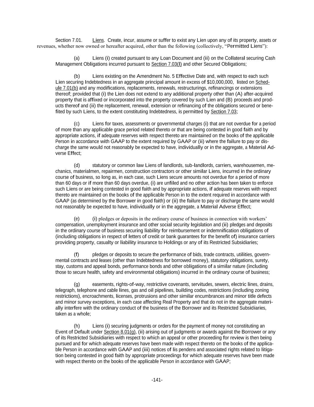-141- Section 7.01. Liens. Create, incur, assume or suffer to exist any Lien upon any of its property, assets or revenues, whether now owned or hereafter acquired, other than the following (collectively, “Permitted Liens”): (a) Liens (i) created pursuant to any Loan Document and (ii) on the Collateral securing Cash Management Obligations incurred pursuant to Section 7.03(l) and other Secured Obligations; (b) Liens existing on the Amendment No. 5 Effective Date and, with respect to each such Lien securing Indebtedness in an aggregate principal amount in excess of $10,000,000, listed on Sched- ule 7.01(b) and any modifications, replacements, renewals, restructurings, refinancings or extensions thereof; provided that (i) the Lien does not extend to any additional property other than (A) after-acquired property that is affixed or incorporated into the property covered by such Lien and (B) proceeds and prod- ucts thereof and (ii) the replacement, renewal, extension or refinancing of the obligations secured or bene- fited by such Liens, to the extent constituting Indebtedness, is permitted by Section 7.03; (c) Liens for taxes, assessments or governmental charges (i) that are not overdue for a period of more than any applicable grace period related thereto or that are being contested in good faith and by appropriate actions, if adequate reserves with respect thereto are maintained on the books of the applicable Person in accordance with GAAP to the extent required by GAAP or (ii) where the failure to pay or dis- charge the same would not reasonably be expected to have, individually or in the aggregate, a Material Ad- verse Effect; (d) statutory or common law Liens of landlords, sub-landlords, carriers, warehousemen, me- chanics, materialmen, repairmen, construction contractors or other similar Liens, incurred in the ordinary course of business, so long as, in each case, such Liens secure amounts not overdue for a period of more than 60 days or if more than 60 days overdue, (i) are unfiled and no other action has been taken to enforce such Liens or are being contested in good faith and by appropriate actions, if adequate reserves with respect thereto are maintained on the books of the applicable Person in to the extent required in accordance with GAAP (as determined by the Borrower in good faith) or (ii) the failure to pay or discharge the same would not reasonably be expected to have, individually or in the aggregate, a Material Adverse Effect; (e) (i) pledges or deposits in the ordinary course of business in connection with workers’ compensation, unemployment insurance and other social security legislation and (ii) pledges and deposits in the ordinary course of business securing liability for reimbursement or indemnification obligations of (including obligations in respect of letters of credit or bank guarantees for the benefit of) insurance carriers providing property, casualty or liability insurance to Holdings or any of its Restricted Subsidiaries; (f) pledges or deposits to secure the performance of bids, trade contracts, utilities, govern- mental contracts and leases (other than Indebtedness for borrowed money), statutory obligations, surety, stay, customs and appeal bonds, performance bonds and other obligations of a similar nature (including those to secure health, safety and environmental obligations) incurred in the ordinary course of business; (g) easements, rights-of-way, restrictive covenants, servitudes, sewers, electric lines, drains, telegraph, telephone and cable lines, gas and oil pipelines, building codes, restrictions (including zoning restrictions), encroachments, licenses, protrusions and other similar encumbrances and minor title defects and minor survey exceptions, in each case affecting Real Property and that do not in the aggregate materi- ally interfere with the ordinary conduct of the business of the Borrower and its Restricted Subsidiaries, taken as a whole; (h) Liens (i) securing judgments or orders for the payment of money not constituting an Event of Default under Section 8.01(g), (ii) arising out of judgments or awards against the Borrower or any of its Restricted Subsidiaries with respect to which an appeal or other proceeding for review is then being pursued and for which adequate reserves have been made with respect thereto on the books of the applica- ble Person in accordance with GAAP and (iii) notices of lis pendens and associated rights related to litiga- tion being contested in good faith by appropriate proceedings for which adequate reserves have been made with respect thereto on the books of the applicable Person in accordance with GAAP;