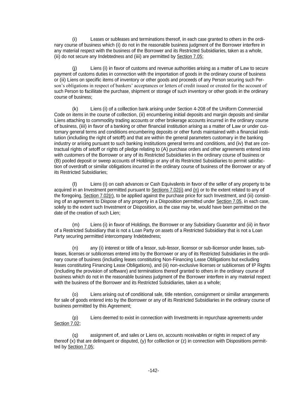 -142- (i) Leases or subleases and terminations thereof, in each case granted to others in the ordi- nary course of business which (i) do not in the reasonable business judgment of the Borrower interfere in any material respect with the business of the Borrower and its Restricted Subsidiaries, taken as a whole, (ii) do not secure any Indebtedness and (iii) are permitted by Section 7.05; (j) Liens (i) in favor of customs and revenue authorities arising as a matter of Law to secure payment of customs duties in connection with the importation of goods in the ordinary course of business or (ii) Liens on specific items of inventory or other goods and proceeds of any Person securing such Per- son’s obligations in respect of bankers’ acceptances or letters of credit issued or created for the account of such Person to facilitate the purchase, shipment or storage of such inventory or other goods in the ordinary course of business; (k) Liens (i) of a collection bank arising under Section 4-208 of the Uniform Commercial Code on items in the course of collection, (ii) encumbering initial deposits and margin deposits and similar Liens attaching to commodity trading accounts or other brokerage accounts incurred in the ordinary course of business, (iii) in favor of a banking or other financial institution arising as a matter of Law or under cus- tomary general terms and conditions encumbering deposits or other funds maintained with a financial insti- tution (including the right of setoff) and that are within the general parameters customary in the banking industry or arising pursuant to such banking institutions general terms and conditions, and (iv) that are con- tractual rights of setoff or rights of pledge relating to (A) purchase orders and other agreements entered into with customers of the Borrower or any of its Restricted Subsidiaries in the ordinary course of business or (B) pooled deposit or sweep accounts of Holdings or any of its Restricted Subsidiaries to permit satisfac- tion of overdraft or similar obligations incurred in the ordinary course of business of the Borrower or any of its Restricted Subsidiaries; (l) Liens (i) on cash advances or Cash Equivalents in favor of the seller of any property to be acquired in an Investment permitted pursuant to Sections 7.02(i) and (n) or to the extent related to any of the foregoing, Section 7.02(r), to be applied against the purchase price for such Investment, and (ii) consist- ing of an agreement to Dispose of any property in a Disposition permitted under Section 7.05, in each case, solely to the extent such Investment or Disposition, as the case may be, would have been permitted on the date of the creation of such Lien; (m) Liens (i) in favor of Holdings, the Borrower or any Subsidiary Guarantor and (ii) in favor of a Restricted Subsidiary that is not a Loan Party on assets of a Restricted Subsidiary that is not a Loan Party securing permitted intercompany Indebtedness; (n) any (i) interest or title of a lessor, sub-lessor, licensor or sub-licensor under leases, sub- leases, licenses or sublicenses entered into by the Borrower or any of its Restricted Subsidiaries in the ordi- nary course of business (including leases constituting Non-Financing Lease Obligations but excluding leases constituting Financing Lease Obligations), and (ii) non-exclusive licenses or sublicenses of IP Rights (including the provision of software) and terminations thereof granted to others in the ordinary course of business which do not in the reasonable business judgment of the Borrower interfere in any material respect with the business of the Borrower and its Restricted Subsidiaries, taken as a whole; (o) Liens arising out of conditional sale, title retention, consignment or similar arrangements for sale of goods entered into by the Borrower or any of its Restricted Subsidiaries in the ordinary course of business permitted by this Agreement; (p) Liens deemed to exist in connection with Investments in repurchase agreements under Section 7.02; (q) assignment of, and sales or Liens on, accounts receivables or rights in respect of any thereof (x) that are delinquent or disputed, (y) for collection or (z) in connection with Dispositions permit- ted by Section 7.05;