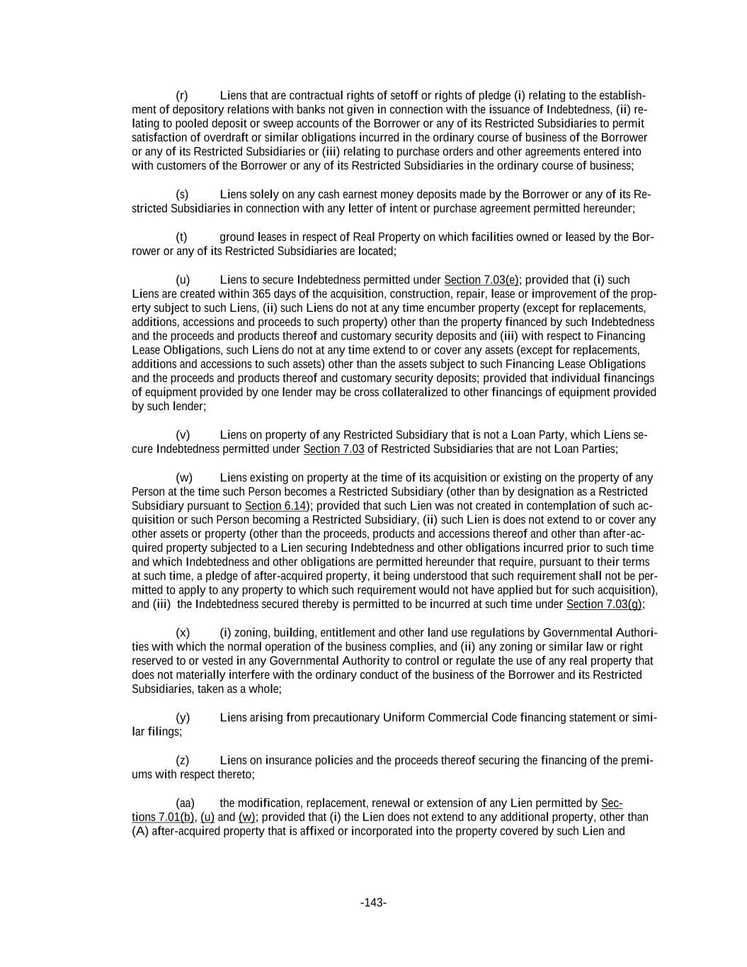 -143- (r) Liens that are contractual rights of setoff or rights of pledge (i) relating to the establish- ment of depository relations with banks not given in connection with the issuance of Indebtedness, (ii) re- lating to pooled deposit or sweep accounts of the Borrower or any of its Restricted Subsidiaries to permit satisfaction of overdraft or similar obligations incurred in the ordinary course of business of the Borrower or any of its Restricted Subsidiaries or (iii) relating to purchase orders and other agreements entered into with customers of the Borrower or any of its Restricted Subsidiaries in the ordinary course of business; (s) Liens solely on any cash earnest money deposits made by the Borrower or any of its Re- stricted Subsidiaries in connection with any letter of intent or purchase agreement permitted hereunder; (t) ground leases in respect of Real Property on which facilities owned or leased by the Bor- rower or any of its Restricted Subsidiaries are located; (u) Liens to secure Indebtedness permitted under Section 7.03(e); provided that (i) such Liens are created within 365 days of the acquisition, construction, repair, lease or improvement of the prop- erty subject to such Liens, (ii) such Liens do not at any time encumber property (except for replacements, additions, accessions and proceeds to such property) other than the property financed by such Indebtedness and the proceeds and products thereof and customary security deposits and (iii) with respect to Financing Lease Obligations, such Liens do not at any time extend to or cover any assets (except for replacements, additions and accessions to such assets) other than the assets subject to such Financing Lease Obligations and the proceeds and products thereof and customary security deposits; provided that individual financings of equipment provided by one lender may be cross collateralized to other financings of equipment provided by such lender; (v) Liens on property of any Restricted Subsidiary that is not a Loan Party, which Liens se- cure Indebtedness permitted under Section 7.03 of Restricted Subsidiaries that are not Loan Parties; (w) Liens existing on property at the time of its acquisition or existing on the property of any Person at the time such Person becomes a Restricted Subsidiary (other than by designation as a Restricted Subsidiary pursuant to Section 6.14); provided that such Lien was not created in contemplation of such ac- quisition or such Person becoming a Restricted Subsidiary, (ii) such Lien is does not extend to or cover any other assets or property (other than the proceeds, products and accessions thereof and other than after-ac- quired property subjected to a Lien securing Indebtedness and other obligations incurred prior to such time and which Indebtedness and other obligations are permitted hereunder that require, pursuant to their terms at such time, a pledge of after-acquired property, it being understood that such requirement shall not be per- mitted to apply to any property to which such requirement would not have applied but for such acquisition), and (iii) the Indebtedness secured thereby is permitted to be incurred at such time under Section 7.03(g); (x) (i) zoning, building, entitlement and other land use regulations by Governmental Authori- ties with which the normal operation of the business complies, and (ii) any zoning or similar law or right reserved to or vested in any Governmental Authority to control or regulate the use of any real property that does not materially interfere with the ordinary conduct of the business of the Borrower and its Restricted Subsidiaries, taken as a whole; (y) Liens arising from precautionary Uniform Commercial Code financing statement or simi- lar filings; (z) Liens on insurance policies and the proceeds thereof securing the financing of the premi- ums with respect thereto; (aa) the modification, replacement, renewal or extension of any Lien permitted by Sec- tions 7.01(b), (u) and (w); provided that (i) the Lien does not extend to any additional property, other than (A) after-acquired property that is affixed or incorporated into the property covered by such Lien and