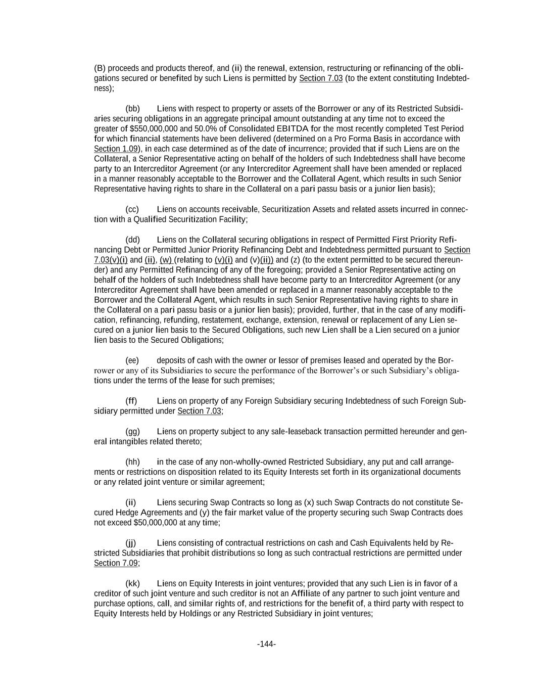 -144- (B) proceeds and products thereof, and (ii) the renewal, extension, restructuring or refinancing of the obli- gations secured or benefited by such Liens is permitted by Section 7.03 (to the extent constituting Indebted- ness); (bb) Liens with respect to property or assets of the Borrower or any of its Restricted Subsidi- aries securing obligations in an aggregate principal amount outstanding at any time not to exceed the greater of $550,000,000 and 50.0% of Consolidated EBITDA for the most recently completed Test Period for which financial statements have been delivered (determined on a Pro Forma Basis in accordance with Section 1.09), in each case determined as of the date of incurrence; provided that if such Liens are on the Collateral, a Senior Representative acting on behalf of the holders of such Indebtedness shall have become party to an Intercreditor Agreement (or any Intercreditor Agreement shall have been amended or replaced in a manner reasonably acceptable to the Borrower and the Collateral Agent, which results in such Senior Representative having rights to share in the Collateral on a pari passu basis or a junior lien basis); (cc) Liens on accounts receivable, Securitization Assets and related assets incurred in connec- tion with a Qualified Securitization Facility; (dd) Liens on the Collateral securing obligations in respect of Permitted First Priority Refi- nancing Debt or Permitted Junior Priority Refinancing Debt and Indebtedness permitted pursuant to Section 7.03(v)(i) and (ii), (w) (relating to (v)(i) and (v)(ii)) and (z) (to the extent permitted to be secured thereun- der) and any Permitted Refinancing of any of the foregoing; provided a Senior Representative acting on behalf of the holders of such Indebtedness shall have become party to an Intercreditor Agreement (or any Intercreditor Agreement shall have been amended or replaced in a manner reasonably acceptable to the Borrower and the Collateral Agent, which results in such Senior Representative having rights to share in the Collateral on a pari passu basis or a junior lien basis); provided, further, that in the case of any modifi- cation, refinancing, refunding, restatement, exchange, extension, renewal or replacement of any Lien se- cured on a junior lien basis to the Secured Obligations, such new Lien shall be a Lien secured on a junior lien basis to the Secured Obligations; (ee) deposits of cash with the owner or lessor of premises leased and operated by the Bor- rower or any of its Subsidiaries to secure the performance of the Borrower’s or such Subsidiary’s obliga- tions under the terms of the lease for such premises; (ff) Liens on property of any Foreign Subsidiary securing Indebtedness of such Foreign Sub- sidiary permitted under Section 7.03; (gg) Liens on property subject to any sale-leaseback transaction permitted hereunder and gen- eral intangibles related thereto; (hh) in the case of any non-wholly-owned Restricted Subsidiary, any put and call arrange- ments or restrictions on disposition related to its Equity Interests set forth in its organizational documents or any related joint venture or similar agreement; (ii) Liens securing Swap Contracts so long as (x) such Swap Contracts do not constitute Se- cured Hedge Agreements and (y) the fair market value of the property securing such Swap Contracts does not exceed $50,000,000 at any time; (jj) Liens consisting of contractual restrictions on cash and Cash Equivalents held by Re- stricted Subsidiaries that prohibit distributions so long as such contractual restrictions are permitted under Section 7.09; (kk) Liens on Equity Interests in joint ventures; provided that any such Lien is in favor of a creditor of such joint venture and such creditor is not an Affiliate of any partner to such joint venture and purchase options, call, and similar rights of, and restrictions for the benefit of, a third party with respect to Equity Interests held by Holdings or any Restricted Subsidiary in joint ventures;