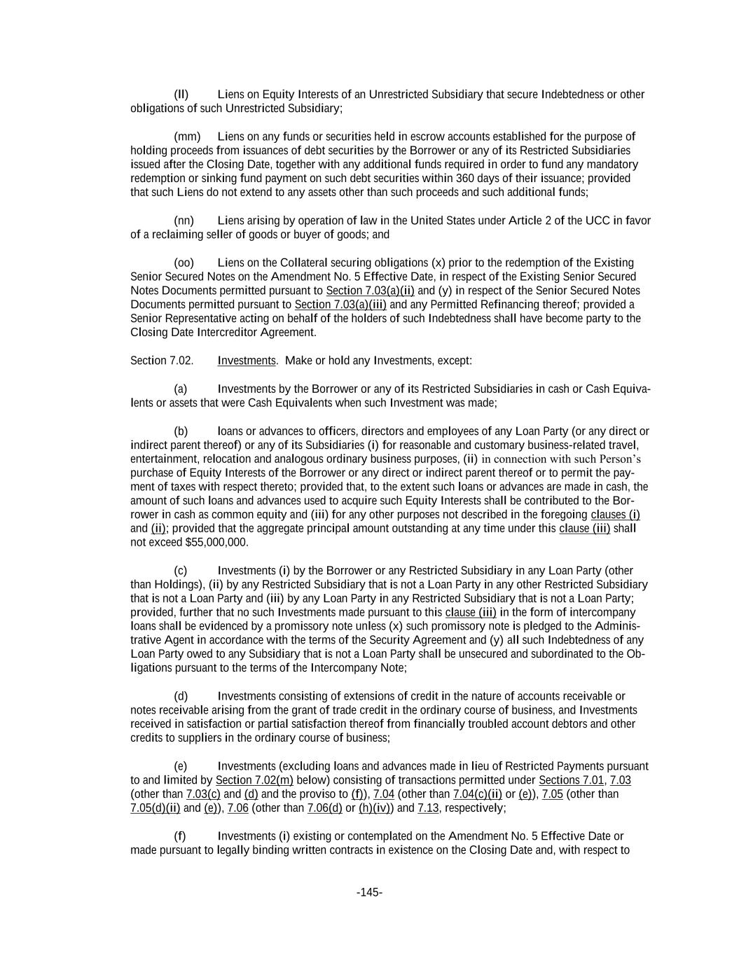 -145- (ll) Liens on Equity Interests of an Unrestricted Subsidiary that secure Indebtedness or other obligations of such Unrestricted Subsidiary; (mm) Liens on any funds or securities held in escrow accounts established for the purpose of holding proceeds from issuances of debt securities by the Borrower or any of its Restricted Subsidiaries issued after the Closing Date, together with any additional funds required in order to fund any mandatory redemption or sinking fund payment on such debt securities within 360 days of their issuance; provided that such Liens do not extend to any assets other than such proceeds and such additional funds; (nn) Liens arising by operation of law in the United States under Article 2 of the UCC in favor of a reclaiming seller of goods or buyer of goods; and (oo) Liens on the Collateral securing obligations (x) prior to the redemption of the Existing Senior Secured Notes on the Amendment No. 5 Effective Date, in respect of the Existing Senior Secured Notes Documents permitted pursuant to Section 7.03(a)(ii) and (y) in respect of the Senior Secured Notes Documents permitted pursuant to Section 7.03(a)(iii) and any Permitted Refinancing thereof; provided a Senior Representative acting on behalf of the holders of such Indebtedness shall have become party to the Closing Date Intercreditor Agreement. Section 7.02. Investments. Make or hold any Investments, except: (a) Investments by the Borrower or any of its Restricted Subsidiaries in cash or Cash Equiva- lents or assets that were Cash Equivalents when such Investment was made; (b) loans or advances to officers, directors and employees of any Loan Party (or any direct or indirect parent thereof) or any of its Subsidiaries (i) for reasonable and customary business-related travel, entertainment, relocation and analogous ordinary business purposes, (ii) in connection with such Person’s purchase of Equity Interests of the Borrower or any direct or indirect parent thereof or to permit the pay- ment of taxes with respect thereto; provided that, to the extent such loans or advances are made in cash, the amount of such loans and advances used to acquire such Equity Interests shall be contributed to the Bor- rower in cash as common equity and (iii) for any other purposes not described in the foregoing clauses (i) and (ii); provided that the aggregate principal amount outstanding at any time under this clause (iii) shall not exceed $55,000,000. (c) Investments (i) by the Borrower or any Restricted Subsidiary in any Loan Party (other than Holdings), (ii) by any Restricted Subsidiary that is not a Loan Party in any other Restricted Subsidiary that is not a Loan Party and (iii) by any Loan Party in any Restricted Subsidiary that is not a Loan Party; provided, further that no such Investments made pursuant to this clause (iii) in the form of intercompany loans shall be evidenced by a promissory note unless (x) such promissory note is pledged to the Adminis- trative Agent in accordance with the terms of the Security Agreement and (y) all such Indebtedness of any Loan Party owed to any Subsidiary that is not a Loan Party shall be unsecured and subordinated to the Ob- ligations pursuant to the terms of the Intercompany Note; (d) Investments consisting of extensions of credit in the nature of accounts receivable or notes receivable arising from the grant of trade credit in the ordinary course of business, and Investments received in satisfaction or partial satisfaction thereof from financially troubled account debtors and other credits to suppliers in the ordinary course of business; (e) Investments (excluding loans and advances made in lieu of Restricted Payments pursuant to and limited by Section 7.02(m) below) consisting of transactions permitted under Sections 7.01, 7.03 (other than 7.03(c) and (d) and the proviso to (f)), 7.04 (other than 7.04(c)(ii) or (e)), 7.05 (other than 7.05(d)(ii) and (e)), 7.06 (other than 7.06(d) or (h)(iv)) and 7.13, respectively; (f) Investments (i) existing or contemplated on the Amendment No. 5 Effective Date or made pursuant to legally binding written contracts in existence on the Closing Date and, with respect to