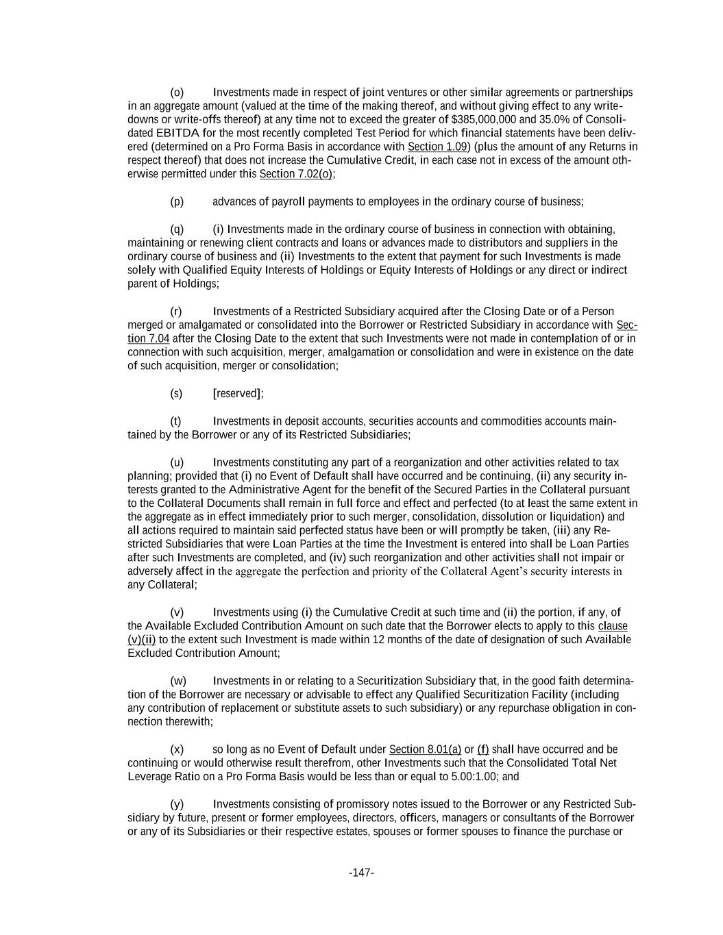 -147- (o) Investments made in respect of joint ventures or other similar agreements or partnerships in an aggregate amount (valued at the time of the making thereof, and without giving effect to any write- downs or write-offs thereof) at any time not to exceed the greater of $385,000,000 and 35.0% of Consoli- dated EBITDA for the most recently completed Test Period for which financial statements have been deliv- ered (determined on a Pro Forma Basis in accordance with Section 1.09) (plus the amount of any Returns in respect thereof) that does not increase the Cumulative Credit, in each case not in excess of the amount oth- erwise permitted under this Section 7.02(o); (p) advances of payroll payments to employees in the ordinary course of business; (q) (i) Investments made in the ordinary course of business in connection with obtaining, maintaining or renewing client contracts and loans or advances made to distributors and suppliers in the ordinary course of business and (ii) Investments to the extent that payment for such Investments is made solely with Qualified Equity Interests of Holdings or Equity Interests of Holdings or any direct or indirect parent of Holdings; (r) Investments of a Restricted Subsidiary acquired after the Closing Date or of a Person merged or amalgamated or consolidated into the Borrower or Restricted Subsidiary in accordance with Sec- tion 7.04 after the Closing Date to the extent that such Investments were not made in contemplation of or in connection with such acquisition, merger, amalgamation or consolidation and were in existence on the date of such acquisition, merger or consolidation; (s) [reserved]; (t) Investments in deposit accounts, securities accounts and commodities accounts main- tained by the Borrower or any of its Restricted Subsidiaries; (u) Investments constituting any part of a reorganization and other activities related to tax planning; provided that (i) no Event of Default shall have occurred and be continuing, (ii) any security in- terests granted to the Administrative Agent for the benefit of the Secured Parties in the Collateral pursuant to the Collateral Documents shall remain in full force and effect and perfected (to at least the same extent in the aggregate as in effect immediately prior to such merger, consolidation, dissolution or liquidation) and all actions required to maintain said perfected status have been or will promptly be taken, (iii) any Re- stricted Subsidiaries that were Loan Parties at the time the Investment is entered into shall be Loan Parties after such Investments are completed, and (iv) such reorganization and other activities shall not impair or adversely affect in the aggregate the perfection and priority of the Collateral Agent’s security interests in any Collateral; (v) Investments using (i) the Cumulative Credit at such time and (ii) the portion, if any, of the Available Excluded Contribution Amount on such date that the Borrower elects to apply to this clause (v)(ii) to the extent such Investment is made within 12 months of the date of designation of such Available Excluded Contribution Amount; (w) Investments in or relating to a Securitization Subsidiary that, in the good faith determina- tion of the Borrower are necessary or advisable to effect any Qualified Securitization Facility (including any contribution of replacement or substitute assets to such subsidiary) or any repurchase obligation in con- nection therewith; (x) so long as no Event of Default under Section 8.01(a) or (f) shall have occurred and be continuing or would otherwise result therefrom, other Investments such that the Consolidated Total Net Leverage Ratio on a Pro Forma Basis would be less than or equal to 5.00:1.00; and (y) Investments consisting of promissory notes issued to the Borrower or any Restricted Sub- sidiary by future, present or former employees, directors, officers, managers or consultants of the Borrower or any of its Subsidiaries or their respective estates, spouses or former spouses to finance the purchase or