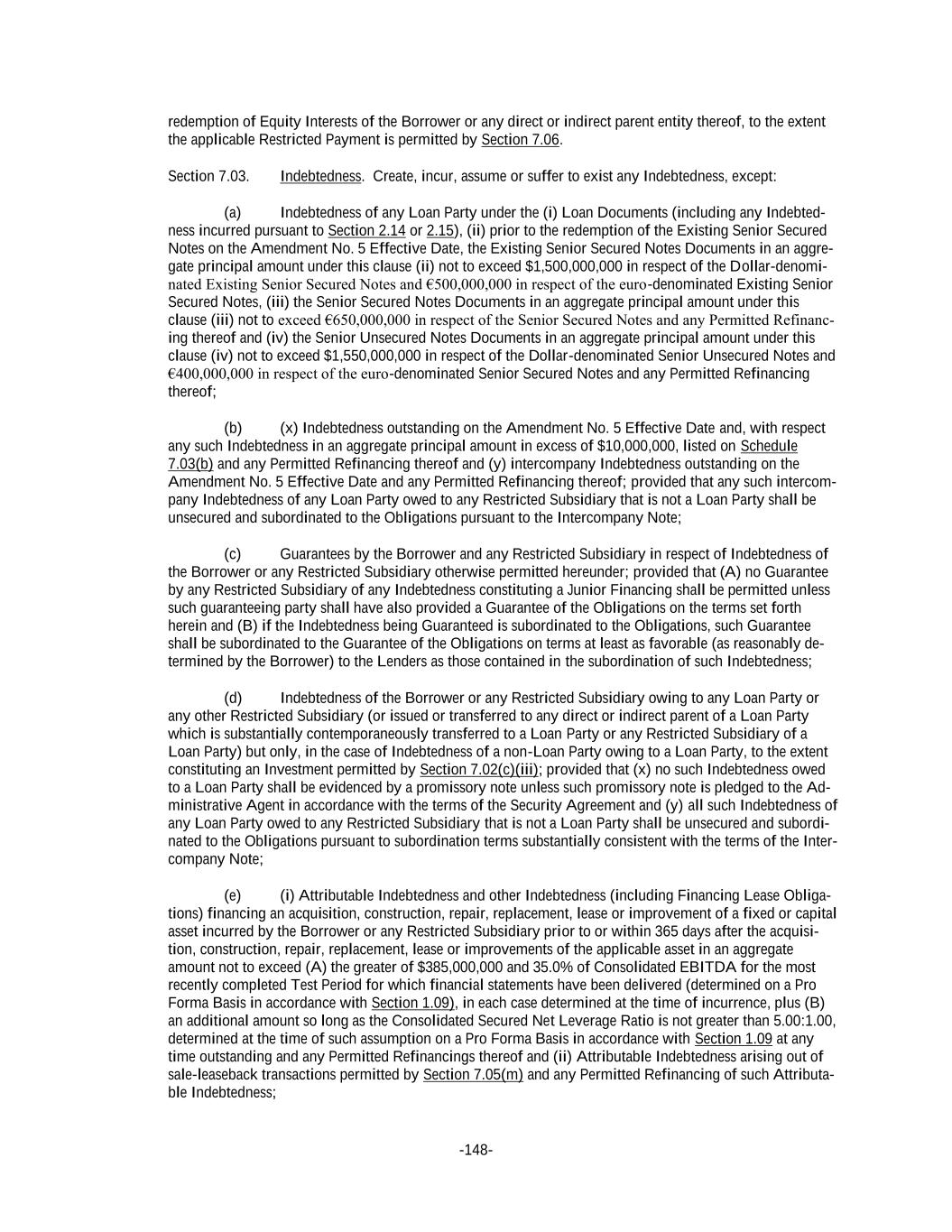 -148- redemption of Equity Interests of the Borrower or any direct or indirect parent entity thereof, to the extent the applicable Restricted Payment is permitted by Section 7.06. Section 7.03. Indebtedness. Create, incur, assume or suffer to exist any Indebtedness, except: (a) Indebtedness of any Loan Party under the (i) Loan Documents (including any Indebted- ness incurred pursuant to Section 2.14 or 2.15), (ii) prior to the redemption of the Existing Senior Secured Notes on the Amendment No. 5 Effective Date, the Existing Senior Secured Notes Documents in an aggre- gate principal amount under this clause (ii) not to exceed $1,500,000,000 in respect of the Dollar-denomi- nated Existing Senior Secured Notes and €500,000,000 in respect of the euro-denominated Existing Senior Secured Notes, (iii) the Senior Secured Notes Documents in an aggregate principal amount under this clause (iii) not to exceed €650,000,000 in respect of the Senior Secured Notes and any Permitted Refinanc- ing thereof and (iv) the Senior Unsecured Notes Documents in an aggregate principal amount under this clause (iv) not to exceed $1,550,000,000 in respect of the Dollar-denominated Senior Unsecured Notes and €400,000,000 in respect of the euro-denominated Senior Secured Notes and any Permitted Refinancing thereof; (b) (x) Indebtedness outstanding on the Amendment No. 5 Effective Date and, with respect any such Indebtedness in an aggregate principal amount in excess of $10,000,000, listed on Schedule 7.03(b) and any Permitted Refinancing thereof and (y) intercompany Indebtedness outstanding on the Amendment No. 5 Effective Date and any Permitted Refinancing thereof; provided that any such intercom- pany Indebtedness of any Loan Party owed to any Restricted Subsidiary that is not a Loan Party shall be unsecured and subordinated to the Obligations pursuant to the Intercompany Note; (c) Guarantees by the Borrower and any Restricted Subsidiary in respect of Indebtedness of the Borrower or any Restricted Subsidiary otherwise permitted hereunder; provided that (A) no Guarantee by any Restricted Subsidiary of any Indebtedness constituting a Junior Financing shall be permitted unless such guaranteeing party shall have also provided a Guarantee of the Obligations on the terms set forth herein and (B) if the Indebtedness being Guaranteed is subordinated to the Obligations, such Guarantee shall be subordinated to the Guarantee of the Obligations on terms at least as favorable (as reasonably de- termined by the Borrower) to the Lenders as those contained in the subordination of such Indebtedness; (d) Indebtedness of the Borrower or any Restricted Subsidiary owing to any Loan Party or any other Restricted Subsidiary (or issued or transferred to any direct or indirect parent of a Loan Party which is substantially contemporaneously transferred to a Loan Party or any Restricted Subsidiary of a Loan Party) but only, in the case of Indebtedness of a non-Loan Party owing to a Loan Party, to the extent constituting an Investment permitted by Section 7.02(c)(iii); provided that (x) no such Indebtedness owed to a Loan Party shall be evidenced by a promissory note unless such promissory note is pledged to the Ad- ministrative Agent in accordance with the terms of the Security Agreement and (y) all such Indebtedness of any Loan Party owed to any Restricted Subsidiary that is not a Loan Party shall be unsecured and subordi- nated to the Obligations pursuant to subordination terms substantially consistent with the terms of the Inter- company Note; (e) (i) Attributable Indebtedness and other Indebtedness (including Financing Lease Obliga- tions) financing an acquisition, construction, repair, replacement, lease or improvement of a fixed or capital asset incurred by the Borrower or any Restricted Subsidiary prior to or within 365 days after the acquisi- tion, construction, repair, replacement, lease or improvements of the applicable asset in an aggregate amount not to exceed (A) the greater of $385,000,000 and 35.0% of Consolidated EBITDA for the most recently completed Test Period for which financial statements have been delivered (determined on a Pro Forma Basis in accordance with Section 1.09), in each case determined at the time of incurrence, plus (B) an additional amount so long as the Consolidated Secured Net Leverage Ratio is not greater than 5.00:1.00, determined at the time of such assumption on a Pro Forma Basis in accordance with Section 1.09 at any time outstanding and any Permitted Refinancings thereof and (ii) Attributable Indebtedness arising out of sale-leaseback transactions permitted by Section 7.05(m) and any Permitted Refinancing of such Attributa- ble Indebtedness;