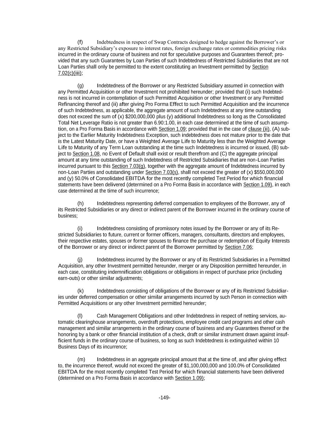 -149- (f) Indebtedness in respect of Swap Contracts designed to hedge against the Borrower’s or any Restricted Subsidiary’s exposure to interest rates, foreign exchange rates or commodities pricing risks incurred in the ordinary course of business and not for speculative purposes and Guarantees thereof; pro- vided that any such Guarantees by Loan Parties of such Indebtedness of Restricted Subsidiaries that are not Loan Parties shall only be permitted to the extent constituting an Investment permitted by Section 7.02(c)(iii); (g) Indebtedness of the Borrower or any Restricted Subsidiary assumed in connection with any Permitted Acquisition or other Investment not prohibited hereunder; provided that (i) such Indebted- ness is not incurred in contemplation of such Permitted Acquisition or other Investment or any Permitted Refinancing thereof and (ii) after giving Pro Forma Effect to such Permitted Acquisition and the incurrence of such Indebtedness, as applicable, the aggregate amount of such Indebtedness at any time outstanding does not exceed the sum of (x) $200,000,000 plus (y) additional Indebtedness so long as the Consolidated Total Net Leverage Ratio is not greater than 6.90:1.00, in each case determined at the time of such assump- tion, on a Pro Forma Basis in accordance with Section 1.09; provided that in the case of clause (ii), (A) sub- ject to the Earlier Maturity Indebtedness Exception, such indebtedness does not mature prior to the date that is the Latest Maturity Date, or have a Weighted Average Life to Maturity less than the Weighted Average Life to Maturity of any Term Loan outstanding at the time such Indebtedness is incurred or issued, (B) sub- ject to Section 1.08, no Event of Default shall exist or result therefrom and (C) the aggregate principal amount at any time outstanding of such Indebtedness of Restricted Subsidiaries that are non-Loan Parties incurred pursuant to this Section 7.03(g), together with the aggregate amount of Indebtedness incurred by non-Loan Parties and outstanding under Section 7.03(s), shall not exceed the greater of (x) $550,000,000 and (y) 50.0% of Consolidated EBITDA for the most recently completed Test Period for which financial statements have been delivered (determined on a Pro Forma Basis in accordance with Section 1.09), in each case determined at the time of such incurrence; (h) Indebtedness representing deferred compensation to employees of the Borrower, any of its Restricted Subsidiaries or any direct or indirect parent of the Borrower incurred in the ordinary course of business; (i) Indebtedness consisting of promissory notes issued by the Borrower or any of its Re- stricted Subsidiaries to future, current or former officers, managers, consultants, directors and employees, their respective estates, spouses or former spouses to finance the purchase or redemption of Equity Interests of the Borrower or any direct or indirect parent of the Borrower permitted by Section 7.06; (j) Indebtedness incurred by the Borrower or any of its Restricted Subsidiaries in a Permitted Acquisition, any other Investment permitted hereunder, merger or any Disposition permitted hereunder, in each case, constituting indemnification obligations or obligations in respect of purchase price (including earn-outs) or other similar adjustments; (k) Indebtedness consisting of obligations of the Borrower or any of its Restricted Subsidiar- ies under deferred compensation or other similar arrangements incurred by such Person in connection with Permitted Acquisitions or any other Investment permitted hereunder; (l) Cash Management Obligations and other Indebtedness in respect of netting services, au- tomatic clearinghouse arrangements, overdraft protections, employee credit card programs and other cash management and similar arrangements in the ordinary course of business and any Guarantees thereof or the honoring by a bank or other financial institution of a check, draft or similar instrument drawn against insuf- ficient funds in the ordinary course of business, so long as such Indebtedness is extinguished within 10 Business Days of its incurrence; (m) Indebtedness in an aggregate principal amount that at the time of, and after giving effect to, the incurrence thereof, would not exceed the greater of $1,100,000,000 and 100.0% of Consolidated EBITDA for the most recently completed Test Period for which financial statements have been delivered (determined on a Pro Forma Basis in accordance with Section 1.09);