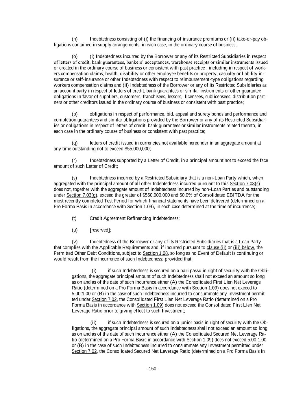 -150- (n) Indebtedness consisting of (i) the financing of insurance premiums or (ii) take-or-pay ob- ligations contained in supply arrangements, in each case, in the ordinary course of business; (o) (i) Indebtedness incurred by the Borrower or any of its Restricted Subsidiaries in respect of letters of credit, bank guarantees, bankers’ acceptances, warehouse receipts or similar instruments issued or created in the ordinary course of business or consistent with past practice , including in respect of work- ers compensation claims, health, disability or other employee benefits or property, casualty or liability in- surance or self-insurance or other Indebtedness with respect to reimbursement-type obligations regarding workers compensation claims and (ii) Indebtedness of the Borrower or any of its Restricted Subsidiaries as an account party in respect of letters of credit, bank guarantees or similar instruments or other guarantee obligations in favor of suppliers, customers, franchisees, lessors, licensees, sublicensees, distribution part- ners or other creditors issued in the ordinary course of business or consistent with past practice; (p) obligations in respect of performance, bid, appeal and surety bonds and performance and completion guarantees and similar obligations provided by the Borrower or any of its Restricted Subsidiar- ies or obligations in respect of letters of credit, bank guarantees or similar instruments related thereto, in each case in the ordinary course of business or consistent with past practice; (q) letters of credit issued in currencies not available hereunder in an aggregate amount at any time outstanding not to exceed $55,000,000; (r) Indebtedness supported by a Letter of Credit, in a principal amount not to exceed the face amount of such Letter of Credit; (s) Indebtedness incurred by a Restricted Subsidiary that is a non-Loan Party which, when aggregated with the principal amount of all other Indebtedness incurred pursuant to this Section 7.03(s) does not, together with the aggregate amount of Indebtedness incurred by non-Loan Parties and outstanding under Section 7.03(g), exceed the greater of $550,000,000 and 50.0% of Consolidated EBITDA for the most recently completed Test Period for which financial statements have been delivered (determined on a Pro Forma Basis in accordance with Section 1.09), in each case determined at the time of incurrence; (t) Credit Agreement Refinancing Indebtedness; (u) [reserved]; (v) Indebtedness of the Borrower or any of its Restricted Subsidiaries that is a Loan Party that complies with the Applicable Requirements and, if incurred pursuant to clause (ii) or (iii) below, the Permitted Other Debt Conditions, subject to Section 1.08, so long as no Event of Default is continuing or would result from the incurrence of such Indebtedness; provided that: (i) if such Indebtedness is secured on a pari passu in right of security with the Obli- gations, the aggregate principal amount of such Indebtedness shall not exceed an amount so long as on and as of the date of such incurrence either (A) the Consolidated First Lien Net Leverage Ratio (determined on a Pro Forma Basis in accordance with Section 1.09) does not exceed to 5.00:1.00 or (B) in the case of such Indebtedness incurred to consummate any Investment permit- ted under Section 7.02, the Consolidated First Lien Net Leverage Ratio (determined on a Pro Forma Basis in accordance with Section 1.09) does not exceed the Consolidated First Lien Net Leverage Ratio prior to giving effect to such Investment; (ii) if such Indebtedness is secured on a junior basis in right of security with the Ob- ligations, the aggregate principal amount of such Indebtedness shall not exceed an amount so long as on and as of the date of such incurrence either (A) the Consolidated Secured Net Leverage Ra- tio (determined on a Pro Forma Basis in accordance with Section 1.09) does not exceed 5.00:1.00 or (B) in the case of such Indebtedness incurred to consummate any Investment permitted under Section 7.02, the Consolidated Secured Net Leverage Ratio (determined on a Pro Forma Basis in