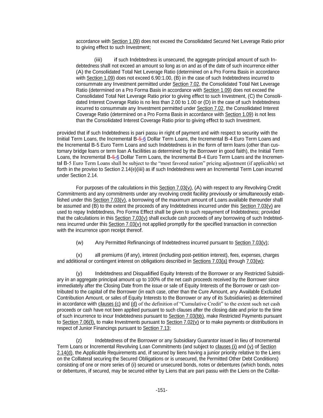 -151- accordance with Section 1.09) does not exceed the Consolidated Secured Net Leverage Ratio prior to giving effect to such Investment; (iii) if such Indebtedness is unsecured, the aggregate principal amount of such In- debtedness shall not exceed an amount so long as on and as of the date of such incurrence either (A) the Consolidated Total Net Leverage Ratio (determined on a Pro Forma Basis in accordance with Section 1.09) does not exceed 6.90:1.00, (B) in the case of such Indebtedness incurred to consummate any Investment permitted under Section 7.02, the Consolidated Total Net Leverage Ratio (determined on a Pro Forma Basis in accordance with Section 1.09) does not exceed the Consolidated Total Net Leverage Ratio prior to giving effect to such Investment, (C) the Consoli- dated Interest Coverage Ratio is no less than 2.00 to 1.00 or (D) in the case of such Indebtedness incurred to consummate any Investment permitted under Section 7.02, the Consolidated Interest Coverage Ratio (determined on a Pro Forma Basis in accordance with Section 1.09) is not less than the Consolidated Interest Coverage Ratio prior to giving effect to such Investment. provided that if such Indebtedness is pari passu in right of payment and with respect to security with the Initial Term Loans, the Incremental B-5-6 Dollar Term Loans, the Incremental B-4 Euro Term Loans and the Incremental B-5 Euro Term Loans and such Indebtedness is in the form of term loans (other than cus- tomary bridge loans or term loan A facilities as determined by the Borrower in good faith), the Initial Term Loans, the Incremental B-5-6 Dollar Term Loans, the Incremental B-4 Euro Term Loans and the Incremen- tal B-5 Euro Term Loans shall be subject to the “most favored nation” pricing adjustment (if applicable) set forth in the proviso to Section 2.14(e)(iii) as if such Indebtedness were an Incremental Term Loan incurred under Section 2.14. For purposes of the calculations in this Section 7.03(v), (A) with respect to any Revolving Credit Commitments and any commitments under any revolving credit facility previously or simultaneously estab- lished under this Section 7.03(v), a borrowing of the maximum amount of Loans available thereunder shall be assumed and (B) to the extent the proceeds of any Indebtedness incurred under this Section 7.03(v) are used to repay Indebtedness, Pro Forma Effect shall be given to such repayment of Indebtedness; provided that the calculations in this Section 7,03(v) shall exclude cash proceeds of any borrowing of such Indebted- ness incurred under this Section 7.03(v) not applied promptly for the specified transaction in connection with the incurrence upon receipt thereof. (w) Any Permitted Refinancings of Indebtedness incurred pursuant to Section 7.03(v); (x) all premiums (if any), interest (including post-petition interest), fees, expenses, charges and additional or contingent interest on obligations described in Sections 7.03(a) through 7.03(w); (y) Indebtedness and Disqualified Equity Interests of the Borrower or any Restricted Subsidi- ary in an aggregate principal amount up to 100% of the net cash proceeds received by the Borrower since immediately after the Closing Date from the issue or sale of Equity Interests of the Borrower or cash con- tributed to the capital of the Borrower (in each case, other than the Cure Amount, any Available Excluded Contribution Amount, or sales of Equity Interests to the Borrower or any of its Subsidiaries) as determined in accordance with clauses (c) and (d) of the definition of “Cumulative Credit” to the extent such net cash proceeds or cash have not been applied pursuant to such clauses after the closing date and prior to the time of such incurrence to incur Indebtedness pursuant to Section 7.03(bb), make Restricted Payments pursuant to Section 7.06(l), to make Investments pursuant to Section 7.02(v) or to make payments or distributions in respect of Junior Financings pursuant to Section 7.13; (z) Indebtedness of the Borrower or any Subsidiary Guarantor issued in lieu of Incremental Term Loans or Incremental Revolving Loan Commitments (and subject to clauses (i) and (v) of Section 2.14(d), the Applicable Requirements and, if secured by liens having a junior priority relative to the Liens on the Collateral securing the Secured Obligations or is unsecured, the Permitted Other Debt Conditions) consisting of one or more series of (i) secured or unsecured bonds, notes or debentures (which bonds, notes or debentures, if secured, may be secured either by Liens that are pari passu with the Liens on the Collat-