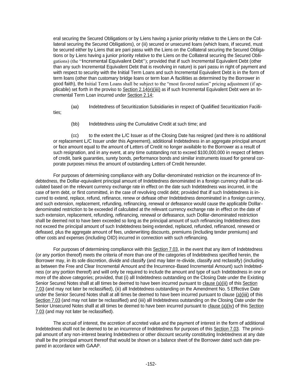 -152- eral securing the Secured Obligations or by Liens having a junior priority relative to the Liens on the Col- lateral securing the Secured Obligations), or (ii) secured or unsecured loans (which loans, if secured, must be secured either by Liens that are pari passu with the Liens on the Collateral securing the Secured Obliga- tions or by Liens having a junior priority relative to the Liens on the Collateral securing the Secured Obli- gations) (the “Incremental Equivalent Debt”); provided that if such Incremental Equivalent Debt (other than any such Incremental Equivalent Debt that is revolving in nature) is pari passu in right of payment and with respect to security with the Initial Term Loans and such Incremental Equivalent Debt is in the form of term loans (other than customary bridge loans or term loan A facilities as determined by the Borrower in good faith), the Initial Term Loans shall be subject to the “most favored nation” pricing adjustment (if ap- plicable) set forth in the proviso to Section 2.14(e)(iii) as if such Incremental Equivalent Debt were an In- cremental Term Loan incurred under Section 2.14; (aa) Indebtedness of Securitization Subsidiaries in respect of Qualified Securitization Facili- ties; (bb) Indebtedness using the Cumulative Credit at such time; and (cc) to the extent the L/C Issuer as of the Closing Date has resigned (and there is no additional or replacement L/C Issuer under this Agreement), additional Indebtedness in an aggregate principal amount or face amount equal to the amount of Letters of Credit no longer available to the Borrower as a result of such resignation, and in any event, at any time outstanding not to exceed $100,000,000 in respect of letters of credit, bank guaranties, surety bonds, performance bonds and similar instruments issued for general cor- porate purposes minus the amount of outstanding Letters of Credit hereunder. For purposes of determining compliance with any Dollar-denominated restriction on the incurrence of In- debtedness, the Dollar-equivalent principal amount of Indebtedness denominated in a foreign currency shall be cal- culated based on the relevant currency exchange rate in effect on the date such Indebtedness was incurred, in the case of term debt, or first committed, in the case of revolving credit debt; provided that if such Indebtedness is in- curred to extend, replace, refund, refinance, renew or defease other Indebtedness denominated in a foreign currency, and such extension, replacement, refunding, refinancing, renewal or defeasance would cause the applicable Dollar- denominated restriction to be exceeded if calculated at the relevant currency exchange rate in effect on the date of such extension, replacement, refunding, refinancing, renewal or defeasance, such Dollar-denominated restriction shall be deemed not to have been exceeded so long as the principal amount of such refinancing Indebtedness does not exceed the principal amount of such Indebtedness being extended, replaced, refunded, refinanced, renewed or defeased, plus the aggregate amount of fees, underwriting discounts, premiums (including tender premiums) and other costs and expenses (including OID) incurred in connection with such refinancing. For purposes of determining compliance with this Section 7.03, in the event that any item of Indebtedness (or any portion thereof) meets the criteria of more than one of the categories of Indebtedness specified herein, the Borrower may, in its sole discretion, divide and classify (and may later re-divide, classify and reclassify) (including as between the Free and Clear Incremental Amount and the Incurrence-Based Incremental Amount) such Indebted- ness (or any portion thereof) and will only be required to include the amount and type of such Indebtedness in one or more of the above categories; provided, that (i) all Indebtedness outstanding on the Closing Date under the Existing Senior Secured Notes shall at all times be deemed to have been incurred pursuant to clause (a)(ii) of this Section 7.03 (and may not later be reclassified), (ii) all Indebtedness outstanding on the Amendment No. 5 Effective Date under the Senior Secured Notes shall at all times be deemed to have been incurred pursuant to clause (a)(iii) of this Section 7.03 (and may not later be reclassified) and (iii) all Indebtedness outstanding on the Closing Date under the Senior Unsecured Notes shall at all times be deemed to have been incurred pursuant to clause (a)(iv) of this Section 7.03 (and may not later be reclassified). The accrual of interest, the accretion of accreted value and the payment of interest in the form of additional Indebtedness shall not be deemed to be an incurrence of Indebtedness for purposes of this Section 7.03. The princi- pal amount of any non-interest bearing Indebtedness or other discount security constituting Indebtedness at any date shall be the principal amount thereof that would be shown on a balance sheet of the Borrower dated such date pre- pared in accordance with GAAP.