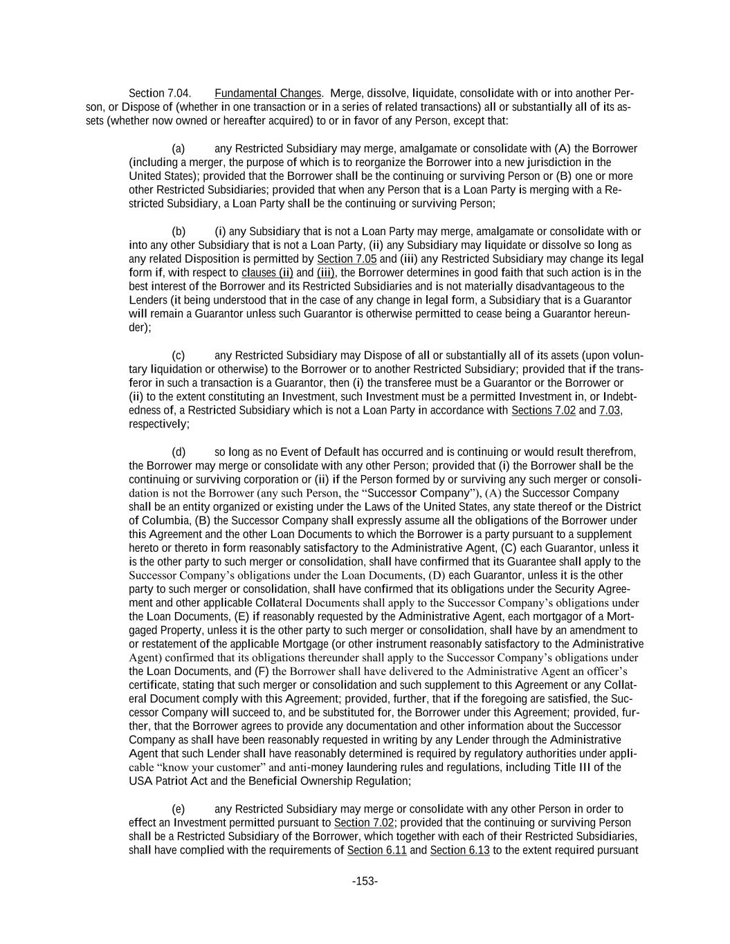 -153- Section 7.04. Fundamental Changes. Merge, dissolve, liquidate, consolidate with or into another Per- son, or Dispose of (whether in one transaction or in a series of related transactions) all or substantially all of its as- sets (whether now owned or hereafter acquired) to or in favor of any Person, except that: (a) any Restricted Subsidiary may merge, amalgamate or consolidate with (A) the Borrower (including a merger, the purpose of which is to reorganize the Borrower into a new jurisdiction in the United States); provided that the Borrower shall be the continuing or surviving Person or (B) one or more other Restricted Subsidiaries; provided that when any Person that is a Loan Party is merging with a Re- stricted Subsidiary, a Loan Party shall be the continuing or surviving Person; (b) (i) any Subsidiary that is not a Loan Party may merge, amalgamate or consolidate with or into any other Subsidiary that is not a Loan Party, (ii) any Subsidiary may liquidate or dissolve so long as any related Disposition is permitted by Section 7.05 and (iii) any Restricted Subsidiary may change its legal form if, with respect to clauses (ii) and (iii), the Borrower determines in good faith that such action is in the best interest of the Borrower and its Restricted Subsidiaries and is not materially disadvantageous to the Lenders (it being understood that in the case of any change in legal form, a Subsidiary that is a Guarantor will remain a Guarantor unless such Guarantor is otherwise permitted to cease being a Guarantor hereun- der); (c) any Restricted Subsidiary may Dispose of all or substantially all of its assets (upon volun- tary liquidation or otherwise) to the Borrower or to another Restricted Subsidiary; provided that if the trans- feror in such a transaction is a Guarantor, then (i) the transferee must be a Guarantor or the Borrower or (ii) to the extent constituting an Investment, such Investment must be a permitted Investment in, or Indebt- edness of, a Restricted Subsidiary which is not a Loan Party in accordance with Sections 7.02 and 7.03, respectively; (d) so long as no Event of Default has occurred and is continuing or would result therefrom, the Borrower may merge or consolidate with any other Person; provided that (i) the Borrower shall be the continuing or surviving corporation or (ii) if the Person formed by or surviving any such merger or consoli- dation is not the Borrower (any such Person, the “Successor Company”), (A) the Successor Company shall be an entity organized or existing under the Laws of the United States, any state thereof or the District of Columbia, (B) the Successor Company shall expressly assume all the obligations of the Borrower under this Agreement and the other Loan Documents to which the Borrower is a party pursuant to a supplement hereto or thereto in form reasonably satisfactory to the Administrative Agent, (C) each Guarantor, unless it is the other party to such merger or consolidation, shall have confirmed that its Guarantee shall apply to the Successor Company’s obligations under the Loan Documents, (D) each Guarantor, unless it is the other party to such merger or consolidation, shall have confirmed that its obligations under the Security Agree- ment and other applicable Collateral Documents shall apply to the Successor Company’s obligations under the Loan Documents, (E) if reasonably requested by the Administrative Agent, each mortgagor of a Mort- gaged Property, unless it is the other party to such merger or consolidation, shall have by an amendment to or restatement of the applicable Mortgage (or other instrument reasonably satisfactory to the Administrative Agent) confirmed that its obligations thereunder shall apply to the Successor Company’s obligations under the Loan Documents, and (F) the Borrower shall have delivered to the Administrative Agent an officer’s certificate, stating that such merger or consolidation and such supplement to this Agreement or any Collat- eral Document comply with this Agreement; provided, further, that if the foregoing are satisfied, the Suc- cessor Company will succeed to, and be substituted for, the Borrower under this Agreement; provided, fur- ther, that the Borrower agrees to provide any documentation and other information about the Successor Company as shall have been reasonably requested in writing by any Lender through the Administrative Agent that such Lender shall have reasonably determined is required by regulatory authorities under appli- cable “know your customer” and anti-money laundering rules and regulations, including Title III of the USA Patriot Act and the Beneficial Ownership Regulation; (e) any Restricted Subsidiary may merge or consolidate with any other Person in order to effect an Investment permitted pursuant to Section 7.02; provided that the continuing or surviving Person shall be a Restricted Subsidiary of the Borrower, which together with each of their Restricted Subsidiaries, shall have complied with the requirements of Section 6.11 and Section 6.13 to the extent required pursuant