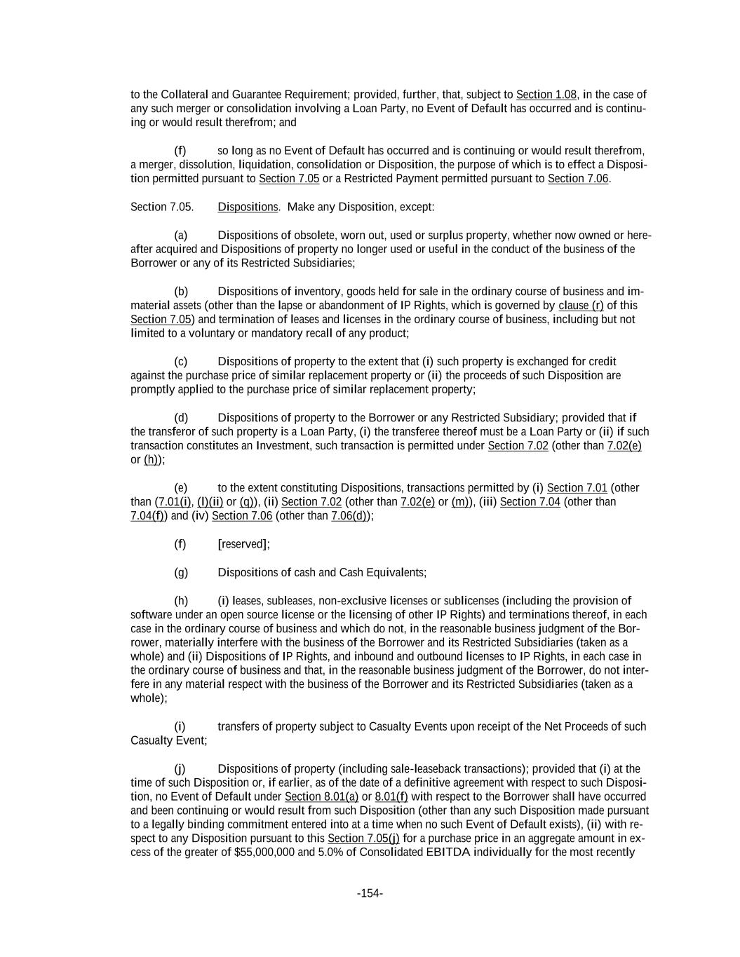 -154- to the Collateral and Guarantee Requirement; provided, further, that, subject to Section 1.08, in the case of any such merger or consolidation involving a Loan Party, no Event of Default has occurred and is continu- ing or would result therefrom; and (f) so long as no Event of Default has occurred and is continuing or would result therefrom, a merger, dissolution, liquidation, consolidation or Disposition, the purpose of which is to effect a Disposi- tion permitted pursuant to Section 7.05 or a Restricted Payment permitted pursuant to Section 7.06. Section 7.05. Dispositions. Make any Disposition, except: (a) Dispositions of obsolete, worn out, used or surplus property, whether now owned or here- after acquired and Dispositions of property no longer used or useful in the conduct of the business of the Borrower or any of its Restricted Subsidiaries; (b) Dispositions of inventory, goods held for sale in the ordinary course of business and im- material assets (other than the lapse or abandonment of IP Rights, which is governed by clause (r) of this Section 7.05) and termination of leases and licenses in the ordinary course of business, including but not limited to a voluntary or mandatory recall of any product; (c) Dispositions of property to the extent that (i) such property is exchanged for credit against the purchase price of similar replacement property or (ii) the proceeds of such Disposition are promptly applied to the purchase price of similar replacement property; (d) Dispositions of property to the Borrower or any Restricted Subsidiary; provided that if the transferor of such property is a Loan Party, (i) the transferee thereof must be a Loan Party or (ii) if such transaction constitutes an Investment, such transaction is permitted under Section 7.02 (other than 7.02(e) or (h)); (e) to the extent constituting Dispositions, transactions permitted by (i) Section 7.01 (other than (7.01(i), (l)(ii) or (q)), (ii) Section 7.02 (other than 7.02(e) or (m)), (iii) Section 7.04 (other than 7.04(f)) and (iv) Section 7.06 (other than 7.06(d)); (f) [reserved]; (g) Dispositions of cash and Cash Equivalents; (h) (i) leases, subleases, non-exclusive licenses or sublicenses (including the provision of software under an open source license or the licensing of other IP Rights) and terminations thereof, in each case in the ordinary course of business and which do not, in the reasonable business judgment of the Bor- rower, materially interfere with the business of the Borrower and its Restricted Subsidiaries (taken as a whole) and (ii) Dispositions of IP Rights, and inbound and outbound licenses to IP Rights, in each case in the ordinary course of business and that, in the reasonable business judgment of the Borrower, do not inter- fere in any material respect with the business of the Borrower and its Restricted Subsidiaries (taken as a whole); (i) transfers of property subject to Casualty Events upon receipt of the Net Proceeds of such Casualty Event; (j) Dispositions of property (including sale-leaseback transactions); provided that (i) at the time of such Disposition or, if earlier, as of the date of a definitive agreement with respect to such Disposi- tion, no Event of Default under Section 8.01(a) or 8.01(f) with respect to the Borrower shall have occurred and been continuing or would result from such Disposition (other than any such Disposition made pursuant to a legally binding commitment entered into at a time when no such Event of Default exists), (ii) with re- spect to any Disposition pursuant to this Section 7.05(j) for a purchase price in an aggregate amount in ex- cess of the greater of $55,000,000 and 5.0% of Consolidated EBITDA individually for the most recently