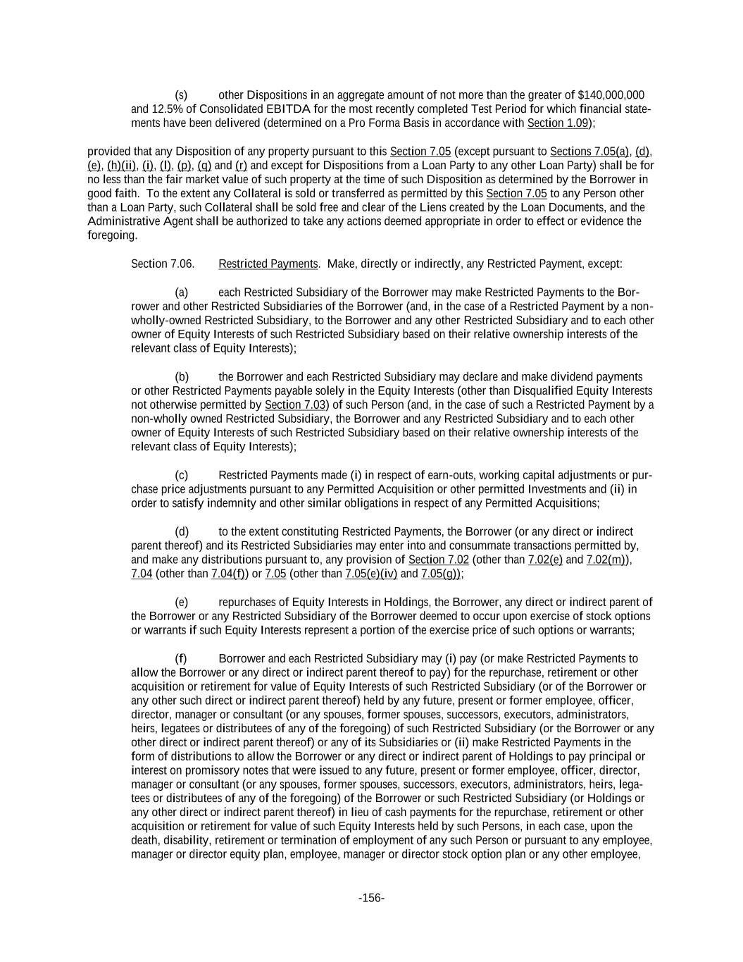 -156- (s) other Dispositions in an aggregate amount of not more than the greater of $140,000,000 and 12.5% of Consolidated EBITDA for the most recently completed Test Period for which financial state- ments have been delivered (determined on a Pro Forma Basis in accordance with Section 1.09); provided that any Disposition of any property pursuant to this Section 7.05 (except pursuant to Sections 7.05(a), (d), (e), (h)(ii), (i), (l), (p), (q) and (r) and except for Dispositions from a Loan Party to any other Loan Party) shall be for no less than the fair market value of such property at the time of such Disposition as determined by the Borrower in good faith. To the extent any Collateral is sold or transferred as permitted by this Section 7.05 to any Person other than a Loan Party, such Collateral shall be sold free and clear of the Liens created by the Loan Documents, and the Administrative Agent shall be authorized to take any actions deemed appropriate in order to effect or evidence the foregoing. Section 7.06. Restricted Payments. Make, directly or indirectly, any Restricted Payment, except: (a) each Restricted Subsidiary of the Borrower may make Restricted Payments to the Bor- rower and other Restricted Subsidiaries of the Borrower (and, in the case of a Restricted Payment by a non- wholly-owned Restricted Subsidiary, to the Borrower and any other Restricted Subsidiary and to each other owner of Equity Interests of such Restricted Subsidiary based on their relative ownership interests of the relevant class of Equity Interests); (b) the Borrower and each Restricted Subsidiary may declare and make dividend payments or other Restricted Payments payable solely in the Equity Interests (other than Disqualified Equity Interests not otherwise permitted by Section 7.03) of such Person (and, in the case of such a Restricted Payment by a non-wholly owned Restricted Subsidiary, the Borrower and any Restricted Subsidiary and to each other owner of Equity Interests of such Restricted Subsidiary based on their relative ownership interests of the relevant class of Equity Interests); (c) Restricted Payments made (i) in respect of earn-outs, working capital adjustments or pur- chase price adjustments pursuant to any Permitted Acquisition or other permitted Investments and (ii) in order to satisfy indemnity and other similar obligations in respect of any Permitted Acquisitions; (d) to the extent constituting Restricted Payments, the Borrower (or any direct or indirect parent thereof) and its Restricted Subsidiaries may enter into and consummate transactions permitted by, and make any distributions pursuant to, any provision of Section 7.02 (other than 7.02(e) and 7.02(m)), 7.04 (other than 7.04(f)) or 7.05 (other than 7.05(e)(iv) and 7.05(g)); (e) repurchases of Equity Interests in Holdings, the Borrower, any direct or indirect parent of the Borrower or any Restricted Subsidiary of the Borrower deemed to occur upon exercise of stock options or warrants if such Equity Interests represent a portion of the exercise price of such options or warrants; (f) Borrower and each Restricted Subsidiary may (i) pay (or make Restricted Payments to allow the Borrower or any direct or indirect parent thereof to pay) for the repurchase, retirement or other acquisition or retirement for value of Equity Interests of such Restricted Subsidiary (or of the Borrower or any other such direct or indirect parent thereof) held by any future, present or former employee, officer, director, manager or consultant (or any spouses, former spouses, successors, executors, administrators, heirs, legatees or distributees of any of the foregoing) of such Restricted Subsidiary (or the Borrower or any other direct or indirect parent thereof) or any of its Subsidiaries or (ii) make Restricted Payments in the form of distributions to allow the Borrower or any direct or indirect parent of Holdings to pay principal or interest on promissory notes that were issued to any future, present or former employee, officer, director, manager or consultant (or any spouses, former spouses, successors, executors, administrators, heirs, lega- tees or distributees of any of the foregoing) of the Borrower or such Restricted Subsidiary (or Holdings or any other direct or indirect parent thereof) in lieu of cash payments for the repurchase, retirement or other acquisition or retirement for value of such Equity Interests held by such Persons, in each case, upon the death, disability, retirement or termination of employment of any such Person or pursuant to any employee, manager or director equity plan, employee, manager or director stock option plan or any other employee,