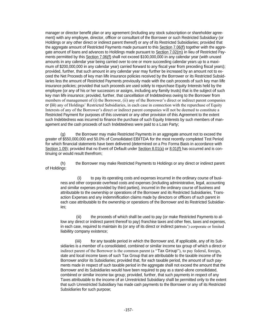 -157- manager or director benefit plan or any agreement (including any stock subscription or shareholder agree- ment) with any employee, director, officer or consultant of the Borrower or such Restricted Subsidiary (or Holdings or any other direct or indirect parent thereof) or any of its Restricted Subsidiaries; provided that the aggregate amount of Restricted Payments made pursuant to this Section 7.06(f) together with the aggre- gate amount of loans and advances to Holdings made pursuant to Section 7.02(m) in lieu of Restricted Pay- ments permitted by this Section 7.06(f) shall not exceed $100,000,000 in any calendar year (with unused amounts in any calendar year being carried over to one or more succeeding calendar years up to a maxi- mum of $200,000,000 in any calendar year) carried forward to any fiscal year from preceding fiscal years); provided, further, that such amount in any calendar year may further be increased by an amount not to ex- ceed the Net Proceeds of key man life insurance policies received by the Borrower or its Restricted Subsid- iaries less the amount of Restricted Payments previously made with the cash proceeds of such key man life insurance policies; provided that such proceeds are used solely to repurchase Equity Interests held by the employee (or any of his or her successors or assigns, including any family trusts) that is the subject of such key man life insurance; provided, further, that cancellation of Indebtedness owing to the Borrower from members of management of (i) the Borrower, (ii) any of the Borrower’s direct or indirect parent companies or (iii) any of Holdings’ Restricted Subsidiaries, in each case in connection with the repurchase of Equity Interests of any of the Borrower’s direct or indirect parent companies will not be deemed to constitute a Restricted Payment for purposes of this covenant or any other provision of this Agreement to the extent such Indebtedness was incurred to finance the purchase of such Equity Interests by such members of man- agement and the cash proceeds of such Indebtedness were paid to a Loan Party; (g) the Borrower may make Restricted Payments in an aggregate amount not to exceed the greater of $550,000,000 and 50.0% of Consolidated EBITDA for the most recently completed Test Period for which financial statements have been delivered (determined on a Pro Forma Basis in accordance with Section 1.09); provided that no Event of Default under Section 8.01(a) or 8.01(f) has occurred and is con- tinuing or would result therefrom; (h) the Borrower may make Restricted Payments to Holdings or any direct or indirect parent of Holdings: (i) to pay its operating costs and expenses incurred in the ordinary course of busi- ness and other corporate overhead costs and expenses (including administrative, legal, accounting and similar expenses provided by third parties), incurred in the ordinary course of business and attributable to the ownership or operations of the Borrower and its Restricted Subsidiaries, Trans- action Expenses and any indemnification claims made by directors or officers of such parent in each case attributable to the ownership or operations of the Borrower and its Restricted Subsidiar- ies; (ii) the proceeds of which shall be used to pay (or make Restricted Payments to al- low any direct or indirect parent thereof to pay) franchise taxes and other fees, taxes and expenses, in each case, required to maintain its (or any of its direct or indirect parents’) corporate or limited liability company existence; (iii) for any taxable period in which the Borrower and, if applicable, any of its Sub- sidiaries is a member of a consolidated, combined or similar income tax group of which a direct or indirect parent of the Borrower is the common parent (a “Tax Group”), to pay federal, foreign, state and local income taxes of such Tax Group that are attributable to the taxable income of the Borrower and/or its Subsidiaries; provided that, for each taxable period, the amount of such pay- ments made in respect of such taxable period in the aggregate shall not exceed the amount that the Borrower and its Subsidiaries would have been required to pay as a stand-alone consolidated, combined or similar income tax group; provided, further, that such payments in respect of any Taxes attributable to the income of an Unrestricted Subsidiary shall be permitted only to the extent that such Unrestricted Subsidiary has made cash payments to the Borrower or any of its Restricted Subsidiaries for such purpose;