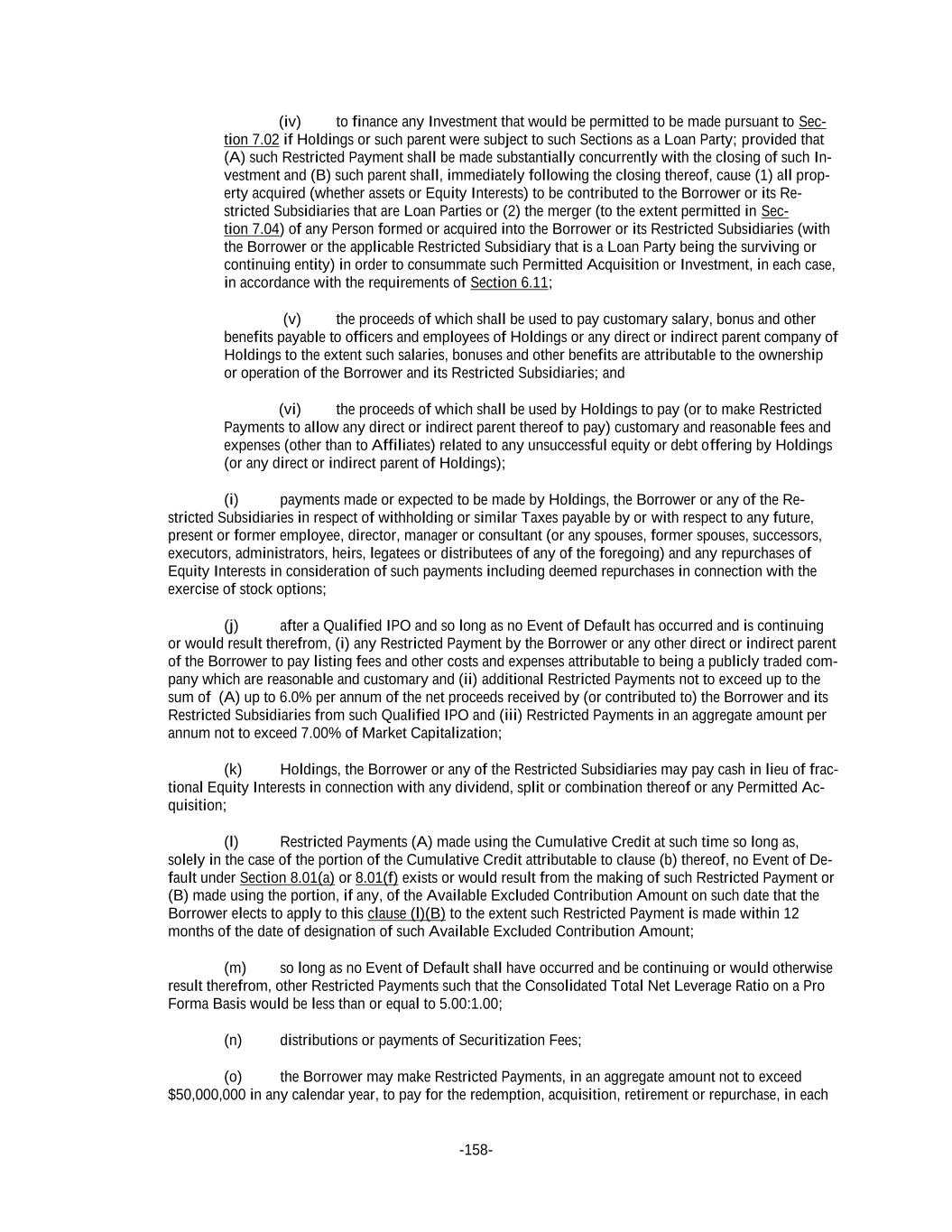 -158- (iv) to finance any Investment that would be permitted to be made pursuant to Sec- tion 7.02 if Holdings or such parent were subject to such Sections as a Loan Party; provided that (A) such Restricted Payment shall be made substantially concurrently with the closing of such In- vestment and (B) such parent shall, immediately following the closing thereof, cause (1) all prop- erty acquired (whether assets or Equity Interests) to be contributed to the Borrower or its Re- stricted Subsidiaries that are Loan Parties or (2) the merger (to the extent permitted in Sec- tion 7.04) of any Person formed or acquired into the Borrower or its Restricted Subsidiaries (with the Borrower or the applicable Restricted Subsidiary that is a Loan Party being the surviving or continuing entity) in order to consummate such Permitted Acquisition or Investment, in each case, in accordance with the requirements of Section 6.11; (v) the proceeds of which shall be used to pay customary salary, bonus and other benefits payable to officers and employees of Holdings or any direct or indirect parent company of Holdings to the extent such salaries, bonuses and other benefits are attributable to the ownership or operation of the Borrower and its Restricted Subsidiaries; and (vi) the proceeds of which shall be used by Holdings to pay (or to make Restricted Payments to allow any direct or indirect parent thereof to pay) customary and reasonable fees and expenses (other than to Affiliates) related to any unsuccessful equity or debt offering by Holdings (or any direct or indirect parent of Holdings); (i) payments made or expected to be made by Holdings, the Borrower or any of the Re- stricted Subsidiaries in respect of withholding or similar Taxes payable by or with respect to any future, present or former employee, director, manager or consultant (or any spouses, former spouses, successors, executors, administrators, heirs, legatees or distributees of any of the foregoing) and any repurchases of Equity Interests in consideration of such payments including deemed repurchases in connection with the exercise of stock options; (j) after a Qualified IPO and so long as no Event of Default has occurred and is continuing or would result therefrom, (i) any Restricted Payment by the Borrower or any other direct or indirect parent of the Borrower to pay listing fees and other costs and expenses attributable to being a publicly traded com- pany which are reasonable and customary and (ii) additional Restricted Payments not to exceed up to the sum of (A) up to 6.0% per annum of the net proceeds received by (or contributed to) the Borrower and its Restricted Subsidiaries from such Qualified IPO and (iii) Restricted Payments in an aggregate amount per annum not to exceed 7.00% of Market Capitalization; (k) Holdings, the Borrower or any of the Restricted Subsidiaries may pay cash in lieu of frac- tional Equity Interests in connection with any dividend, split or combination thereof or any Permitted Ac- quisition; (l) Restricted Payments (A) made using the Cumulative Credit at such time so long as, solely in the case of the portion of the Cumulative Credit attributable to clause (b) thereof, no Event of De- fault under Section 8.01(a) or 8.01(f) exists or would result from the making of such Restricted Payment or (B) made using the portion, if any, of the Available Excluded Contribution Amount on such date that the Borrower elects to apply to this clause (l)(B) to the extent such Restricted Payment is made within 12 months of the date of designation of such Available Excluded Contribution Amount; (m) so long as no Event of Default shall have occurred and be continuing or would otherwise result therefrom, other Restricted Payments such that the Consolidated Total Net Leverage Ratio on a Pro Forma Basis would be less than or equal to 5.00:1.00; (n) distributions or payments of Securitization Fees; (o) the Borrower may make Restricted Payments, in an aggregate amount not to exceed $50,000,000 in any calendar year, to pay for the redemption, acquisition, retirement or repurchase, in each