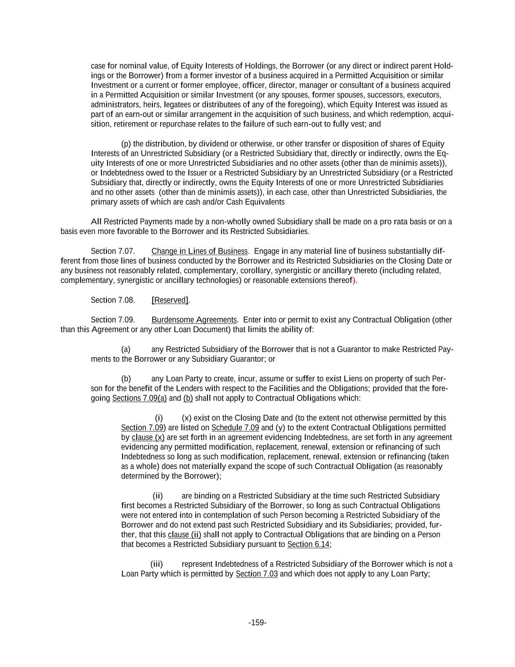 -159- case for nominal value, of Equity Interests of Holdings, the Borrower (or any direct or indirect parent Hold- ings or the Borrower) from a former investor of a business acquired in a Permitted Acquisition or similar Investment or a current or former employee, officer, director, manager or consultant of a business acquired in a Permitted Acquisition or similar Investment (or any spouses, former spouses, successors, executors, administrators, heirs, legatees or distributees of any of the foregoing), which Equity Interest was issued as part of an earn-out or similar arrangement in the acquisition of such business, and which redemption, acqui- sition, retirement or repurchase relates to the failure of such earn-out to fully vest; and (p) the distribution, by dividend or otherwise, or other transfer or disposition of shares of Equity Interests of an Unrestricted Subsidiary (or a Restricted Subsidiary that, directly or indirectly, owns the Eq- uity Interests of one or more Unrestricted Subsidiaries and no other assets (other than de minimis assets)), or Indebtedness owed to the Issuer or a Restricted Subsidiary by an Unrestricted Subsidiary (or a Restricted Subsidiary that, directly or indirectly, owns the Equity Interests of one or more Unrestricted Subsidiaries and no other assets (other than de minimis assets)), in each case, other than Unrestricted Subsidiaries, the primary assets of which are cash and/or Cash Equivalents All Restricted Payments made by a non-wholly owned Subsidiary shall be made on a pro rata basis or on a basis even more favorable to the Borrower and its Restricted Subsidiaries. Section 7.07. Change in Lines of Business. Engage in any material line of business substantially dif- ferent from those lines of business conducted by the Borrower and its Restricted Subsidiaries on the Closing Date or any business not reasonably related, complementary, corollary, synergistic or ancillary thereto (including related, complementary, synergistic or ancillary technologies) or reasonable extensions thereof). Section 7.08. [Reserved]. Section 7.09. Burdensome Agreements. Enter into or permit to exist any Contractual Obligation (other than this Agreement or any other Loan Document) that limits the ability of: (a) any Restricted Subsidiary of the Borrower that is not a Guarantor to make Restricted Pay- ments to the Borrower or any Subsidiary Guarantor; or (b) any Loan Party to create, incur, assume or suffer to exist Liens on property of such Per- son for the benefit of the Lenders with respect to the Facilities and the Obligations; provided that the fore- going Sections 7.09(a) and (b) shall not apply to Contractual Obligations which: (i) (x) exist on the Closing Date and (to the extent not otherwise permitted by this Section 7.09) are listed on Schedule 7.09 and (y) to the extent Contractual Obligations permitted by clause (x) are set forth in an agreement evidencing Indebtedness, are set forth in any agreement evidencing any permitted modification, replacement, renewal, extension or refinancing of such Indebtedness so long as such modification, replacement, renewal, extension or refinancing (taken as a whole) does not materially expand the scope of such Contractual Obligation (as reasonably determined by the Borrower); (ii) are binding on a Restricted Subsidiary at the time such Restricted Subsidiary first becomes a Restricted Subsidiary of the Borrower, so long as such Contractual Obligations were not entered into in contemplation of such Person becoming a Restricted Subsidiary of the Borrower and do not extend past such Restricted Subsidiary and its Subsidiaries; provided, fur- ther, that this clause (ii) shall not apply to Contractual Obligations that are binding on a Person that becomes a Restricted Subsidiary pursuant to Section 6.14; (iii) represent Indebtedness of a Restricted Subsidiary of the Borrower which is not a Loan Party which is permitted by Section 7.03 and which does not apply to any Loan Party;