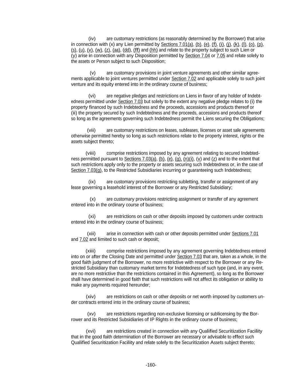 -160- (iv) are customary restrictions (as reasonably determined by the Borrower) that arise in connection with (x) any Lien permitted by Sections 7.01(a), (b), (e), (f), (i), (j), (k), (l), (o), (p), (s), (u), (v), (w), (z), (aa), (dd), (ff) and (hh) and relate to the property subject to such Lien or (y) arise in connection with any Disposition permitted by Section 7.04 or 7.05 and relate solely to the assets or Person subject to such Disposition; (v) are customary provisions in joint venture agreements and other similar agree- ments applicable to joint ventures permitted under Section 7.02 and applicable solely to such joint venture and its equity entered into in the ordinary course of business; (vi) are negative pledges and restrictions on Liens in favor of any holder of Indebt- edness permitted under Section 7.03 but solely to the extent any negative pledge relates to (i) the property financed by such Indebtedness and the proceeds, accessions and products thereof or (ii) the property secured by such Indebtedness and the proceeds, accessions and products thereof so long as the agreements governing such Indebtedness permit the Liens securing the Obligations; (vii) are customary restrictions on leases, subleases, licenses or asset sale agreements otherwise permitted hereby so long as such restrictions relate to the property interest, rights or the assets subject thereto; (viii) comprise restrictions imposed by any agreement relating to secured Indebted- ness permitted pursuant to Sections 7.03(a), (b), (e), (g), (n)(i), (v) and (z) and to the extent that such restrictions apply only to the property or assets securing such Indebtedness or, in the case of Section 7.03(g), to the Restricted Subsidiaries incurring or guaranteeing such Indebtedness; (ix) are customary provisions restricting subletting, transfer or assignment of any lease governing a leasehold interest of the Borrower or any Restricted Subsidiary; (x) are customary provisions restricting assignment or transfer of any agreement entered into in the ordinary course of business; (xi) are restrictions on cash or other deposits imposed by customers under contracts entered into in the ordinary course of business; (xii) arise in connection with cash or other deposits permitted under Sections 7.01 and 7.02 and limited to such cash or deposit; (xiii) comprise restrictions imposed by any agreement governing Indebtedness entered into on or after the Closing Date and permitted under Section 7.03 that are, taken as a whole, in the good faith judgment of the Borrower, no more restrictive with respect to the Borrower or any Re- stricted Subsidiary than customary market terms for Indebtedness of such type (and, in any event, are no more restrictive than the restrictions contained in this Agreement), so long as the Borrower shall have determined in good faith that such restrictions will not affect its obligation or ability to make any payments required hereunder; (xiv) are restrictions on cash or other deposits or net worth imposed by customers un- der contracts entered into in the ordinary course of business; (xv) are restrictions regarding non-exclusive licensing or sublicensing by the Bor- rower and its Restricted Subsidiaries of IP Rights in the ordinary course of business; (xvi) are restrictions created in connection with any Qualified Securitization Facility that in the good faith determination of the Borrower are necessary or advisable to effect such Qualified Securitization Facility and relate solely to the Securitization Assets subject thereto;