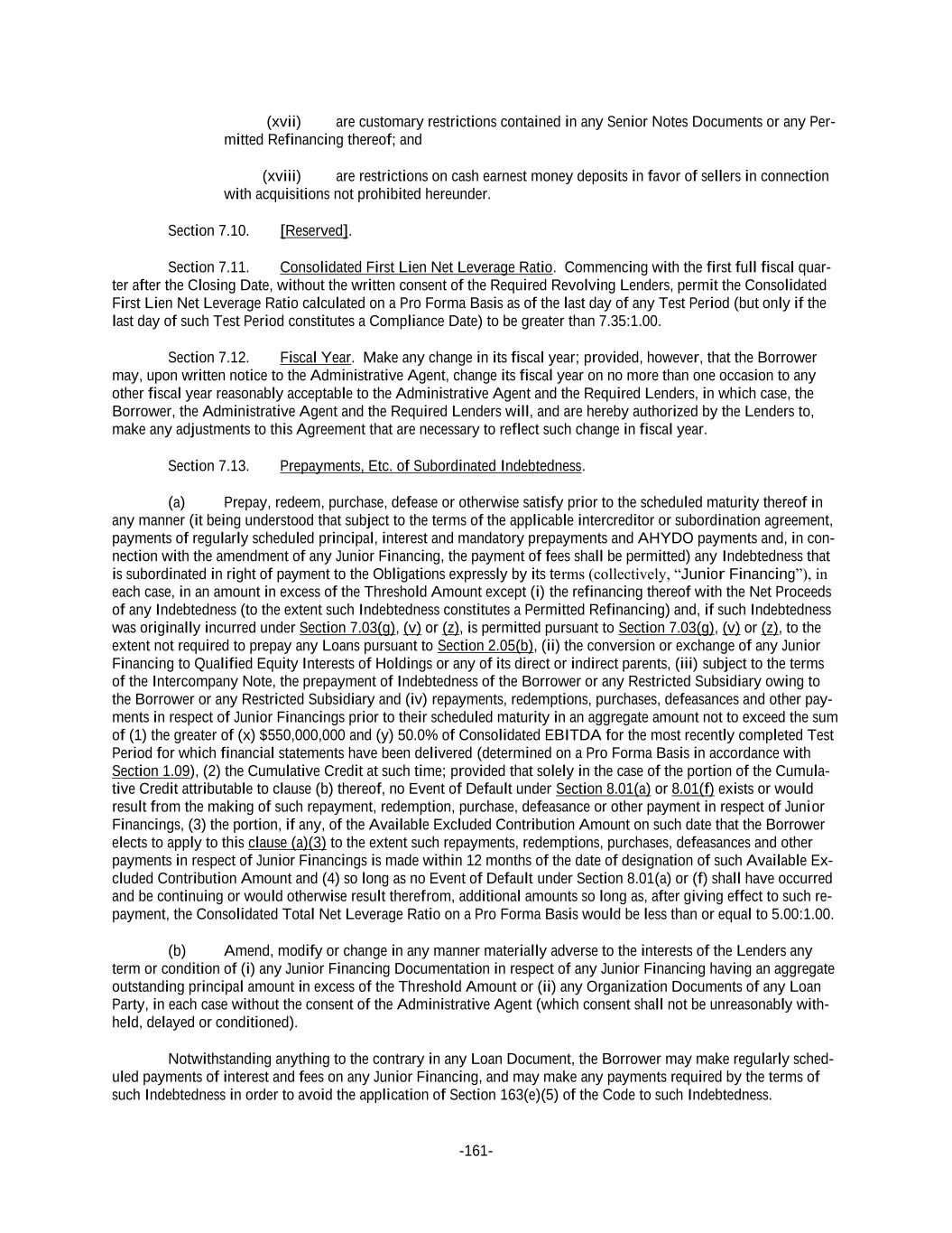 -161- (xvii) are customary restrictions contained in any Senior Notes Documents or any Per- mitted Refinancing thereof; and (xviii) are restrictions on cash earnest money deposits in favor of sellers in connection with acquisitions not prohibited hereunder. Section 7.10. [Reserved]. Section 7.11. Consolidated First Lien Net Leverage Ratio. Commencing with the first full fiscal quar- ter after the Closing Date, without the written consent of the Required Revolving Lenders, permit the Consolidated First Lien Net Leverage Ratio calculated on a Pro Forma Basis as of the last day of any Test Period (but only if the last day of such Test Period constitutes a Compliance Date) to be greater than 7.35:1.00. Section 7.12. Fiscal Year. Make any change in its fiscal year; provided, however, that the Borrower may, upon written notice to the Administrative Agent, change its fiscal year on no more than one occasion to any other fiscal year reasonably acceptable to the Administrative Agent and the Required Lenders, in which case, the Borrower, the Administrative Agent and the Required Lenders will, and are hereby authorized by the Lenders to, make any adjustments to this Agreement that are necessary to reflect such change in fiscal year. Section 7.13. Prepayments, Etc. of Subordinated Indebtedness. (a) Prepay, redeem, purchase, defease or otherwise satisfy prior to the scheduled maturity thereof in any manner (it being understood that subject to the terms of the applicable intercreditor or subordination agreement, payments of regularly scheduled principal, interest and mandatory prepayments and AHYDO payments and, in con- nection with the amendment of any Junior Financing, the payment of fees shall be permitted) any Indebtedness that is subordinated in right of payment to the Obligations expressly by its terms (collectively, “Junior Financing”), in each case, in an amount in excess of the Threshold Amount except (i) the refinancing thereof with the Net Proceeds of any Indebtedness (to the extent such Indebtedness constitutes a Permitted Refinancing) and, if such Indebtedness was originally incurred under Section 7.03(g), (v) or (z), is permitted pursuant to Section 7.03(g), (v) or (z), to the extent not required to prepay any Loans pursuant to Section 2.05(b), (ii) the conversion or exchange of any Junior Financing to Qualified Equity Interests of Holdings or any of its direct or indirect parents, (iii) subject to the terms of the Intercompany Note, the prepayment of Indebtedness of the Borrower or any Restricted Subsidiary owing to the Borrower or any Restricted Subsidiary and (iv) repayments, redemptions, purchases, defeasances and other pay- ments in respect of Junior Financings prior to their scheduled maturity in an aggregate amount not to exceed the sum of (1) the greater of (x) $550,000,000 and (y) 50.0% of Consolidated EBITDA for the most recently completed Test Period for which financial statements have been delivered (determined on a Pro Forma Basis in accordance with Section 1.09), (2) the Cumulative Credit at such time; provided that solely in the case of the portion of the Cumula- tive Credit attributable to clause (b) thereof, no Event of Default under Section 8.01(a) or 8.01(f) exists or would result from the making of such repayment, redemption, purchase, defeasance or other payment in respect of Junior Financings, (3) the portion, if any, of the Available Excluded Contribution Amount on such date that the Borrower elects to apply to this clause (a)(3) to the extent such repayments, redemptions, purchases, defeasances and other payments in respect of Junior Financings is made within 12 months of the date of designation of such Available Ex- cluded Contribution Amount and (4) so long as no Event of Default under Section 8.01(a) or (f) shall have occurred and be continuing or would otherwise result therefrom, additional amounts so long as, after giving effect to such re- payment, the Consolidated Total Net Leverage Ratio on a Pro Forma Basis would be less than or equal to 5.00:1.00. (b) Amend, modify or change in any manner materially adverse to the interests of the Lenders any term or condition of (i) any Junior Financing Documentation in respect of any Junior Financing having an aggregate outstanding principal amount in excess of the Threshold Amount or (ii) any Organization Documents of any Loan Party, in each case without the consent of the Administrative Agent (which consent shall not be unreasonably with- held, delayed or conditioned). Notwithstanding anything to the contrary in any Loan Document, the Borrower may make regularly sched- uled payments of interest and fees on any Junior Financing, and may make any payments required by the terms of such Indebtedness in order to avoid the application of Section 163(e)(5) of the Code to such Indebtedness.
