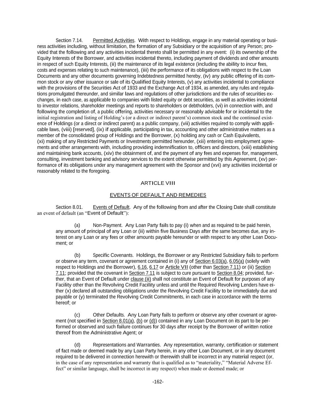 -162- Section 7.14. Permitted Activities. With respect to Holdings, engage in any material operating or busi- ness activities including, without limitation, the formation of any Subsidiary or the acquisition of any Person; pro- vided that the following and any activities incidental thereto shall be permitted in any event: (i) its ownership of the Equity Interests of the Borrower, and activities incidental thereto, including payment of dividends and other amounts in respect of such Equity Interests, (ii) the maintenance of its legal existence (including the ability to incur fees, costs and expenses relating to such maintenance), (iii) the performance of its obligations with respect to the Loan Documents and any other documents governing Indebtedness permitted hereby, (iv) any public offering of its com- mon stock or any other issuance or sale of its Qualified Equity Interests, (v) any activities incidental to compliance with the provisions of the Securities Act of 1933 and the Exchange Act of 1934, as amended, any rules and regula- tions promulgated thereunder, and similar laws and regulations of other jurisdictions and the rules of securities ex- changes, in each case, as applicable to companies with listed equity or debt securities, as well as activities incidental to investor relations, shareholder meetings and reports to shareholders or debtholders, (vi) in connection with, and following the completion of, a public offering, activities necessary or reasonably advisable for or incidental to the initial registration and listing of Holding’s (or a direct or indirect parent’s) common stock and the continued exist- ence of Holdings (or a direct or indirect parent) as a public company, (vii) activities required to comply with appli- cable laws, (viii) [reserved], (ix) if applicable, participating in tax, accounting and other administrative matters as a member of the consolidated group of Holdings and the Borrower, (x) holding any cash or Cash Equivalents, (xi) making of any Restricted Payments or Investments permitted hereunder, (xii) entering into employment agree- ments and other arrangements with, including providing indemnification to, officers and directors, (xiii) establishing and maintaining bank accounts, (xiv) the obtainment of, and the payment of any fees and expenses for, management, consulting, investment banking and advisory services to the extent otherwise permitted by this Agreement, (xv) per- formance of its obligations under any management agreement with the Sponsor and (xvi) any activities incidental or reasonably related to the foregoing. ARTICLE VIII EVENTS OF DEFAULT AND REMEDIES Section 8.01. Events of Default. Any of the following from and after the Closing Date shall constitute an event of default (an “Event of Default”): (a) Non-Payment. Any Loan Party fails to pay (i) when and as required to be paid herein, any amount of principal of any Loan or (ii) within five Business Days after the same becomes due, any in- terest on any Loan or any fees or other amounts payable hereunder or with respect to any other Loan Docu- ment; or (b) Specific Covenants. Holdings, the Borrower or any Restricted Subsidiary fails to perform or observe any term, covenant or agreement contained in (i) any of Section 6.03(a), 6.05(a) (solely with respect to Holdings and the Borrower), 6.16, 6.17 or Article VII (other than Section 7.11) or (ii) Section 7.11; provided that the covenant in Section 7.11 is subject to cure pursuant to Section 8.04; provided, fur- ther, that an Event of Default under clause (ii) shall not constitute an Event of Default for purposes of any Facility other than the Revolving Credit Facility unless and until the Required Revolving Lenders have ei- ther (x) declared all outstanding obligations under the Revolving Credit Facility to be immediately due and payable or (y) terminated the Revolving Credit Commitments, in each case in accordance with the terms hereof; or (c) Other Defaults. Any Loan Party fails to perform or observe any other covenant or agree- ment (not specified in Section 8.01(a), (b) or (d)) contained in any Loan Document on its part to be per- formed or observed and such failure continues for 30 days after receipt by the Borrower of written notice thereof from the Administrative Agent; or (d) Representations and Warranties. Any representation, warranty, certification or statement of fact made or deemed made by any Loan Party herein, in any other Loan Document, or in any document required to be delivered in connection herewith or therewith shall be incorrect in any material respect (or, in the case of any representation and warranty that is qualified as to “materiality,” “Material Adverse Ef- fect” or similar language, shall be incorrect in any respect) when made or deemed made; or
