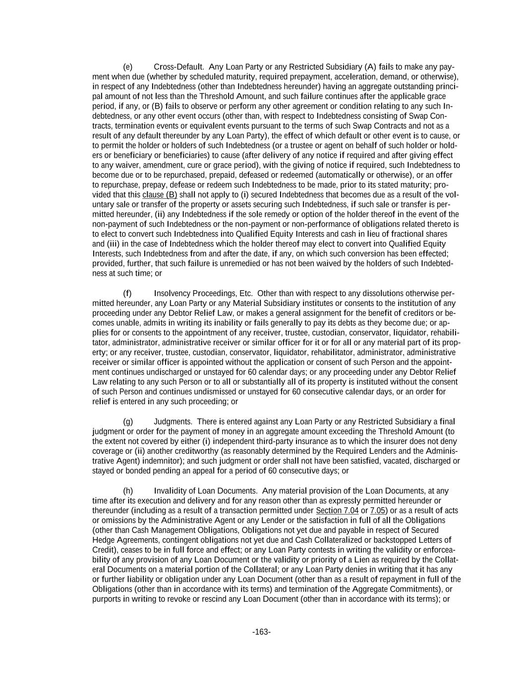-163- (e) Cross-Default. Any Loan Party or any Restricted Subsidiary (A) fails to make any pay- ment when due (whether by scheduled maturity, required prepayment, acceleration, demand, or otherwise), in respect of any Indebtedness (other than Indebtedness hereunder) having an aggregate outstanding princi- pal amount of not less than the Threshold Amount, and such failure continues after the applicable grace period, if any, or (B) fails to observe or perform any other agreement or condition relating to any such In- debtedness, or any other event occurs (other than, with respect to Indebtedness consisting of Swap Con- tracts, termination events or equivalent events pursuant to the terms of such Swap Contracts and not as a result of any default thereunder by any Loan Party), the effect of which default or other event is to cause, or to permit the holder or holders of such Indebtedness (or a trustee or agent on behalf of such holder or hold- ers or beneficiary or beneficiaries) to cause (after delivery of any notice if required and after giving effect to any waiver, amendment, cure or grace period), with the giving of notice if required, such Indebtedness to become due or to be repurchased, prepaid, defeased or redeemed (automatically or otherwise), or an offer to repurchase, prepay, defease or redeem such Indebtedness to be made, prior to its stated maturity; pro- vided that this clause (B) shall not apply to (i) secured Indebtedness that becomes due as a result of the vol- untary sale or transfer of the property or assets securing such Indebtedness, if such sale or transfer is per- mitted hereunder, (ii) any Indebtedness if the sole remedy or option of the holder thereof in the event of the non-payment of such Indebtedness or the non-payment or non-performance of obligations related thereto is to elect to convert such Indebtedness into Qualified Equity Interests and cash in lieu of fractional shares and (iii) in the case of Indebtedness which the holder thereof may elect to convert into Qualified Equity Interests, such Indebtedness from and after the date, if any, on which such conversion has been effected; provided, further, that such failure is unremedied or has not been waived by the holders of such Indebted- ness at such time; or (f) Insolvency Proceedings, Etc. Other than with respect to any dissolutions otherwise per- mitted hereunder, any Loan Party or any Material Subsidiary institutes or consents to the institution of any proceeding under any Debtor Relief Law, or makes a general assignment for the benefit of creditors or be- comes unable, admits in writing its inability or fails generally to pay its debts as they become due; or ap- plies for or consents to the appointment of any receiver, trustee, custodian, conservator, liquidator, rehabili- tator, administrator, administrative receiver or similar officer for it or for all or any material part of its prop- erty; or any receiver, trustee, custodian, conservator, liquidator, rehabilitator, administrator, administrative receiver or similar officer is appointed without the application or consent of such Person and the appoint- ment continues undischarged or unstayed for 60 calendar days; or any proceeding under any Debtor Relief Law relating to any such Person or to all or substantially all of its property is instituted without the consent of such Person and continues undismissed or unstayed for 60 consecutive calendar days, or an order for relief is entered in any such proceeding; or (g) Judgments. There is entered against any Loan Party or any Restricted Subsidiary a final judgment or order for the payment of money in an aggregate amount exceeding the Threshold Amount (to the extent not covered by either (i) independent third-party insurance as to which the insurer does not deny coverage or (ii) another creditworthy (as reasonably determined by the Required Lenders and the Adminis- trative Agent) indemnitor); and such judgment or order shall not have been satisfied, vacated, discharged or stayed or bonded pending an appeal for a period of 60 consecutive days; or (h) Invalidity of Loan Documents. Any material provision of the Loan Documents, at any time after its execution and delivery and for any reason other than as expressly permitted hereunder or thereunder (including as a result of a transaction permitted under Section 7.04 or 7.05) or as a result of acts or omissions by the Administrative Agent or any Lender or the satisfaction in full of all the Obligations (other than Cash Management Obligations, Obligations not yet due and payable in respect of Secured Hedge Agreements, contingent obligations not yet due and Cash Collateralized or backstopped Letters of Credit), ceases to be in full force and effect; or any Loan Party contests in writing the validity or enforcea- bility of any provision of any Loan Document or the validity or priority of a Lien as required by the Collat- eral Documents on a material portion of the Collateral; or any Loan Party denies in writing that it has any or further liability or obligation under any Loan Document (other than as a result of repayment in full of the Obligations (other than in accordance with its terms) and termination of the Aggregate Commitments), or purports in writing to revoke or rescind any Loan Document (other than in accordance with its terms); or