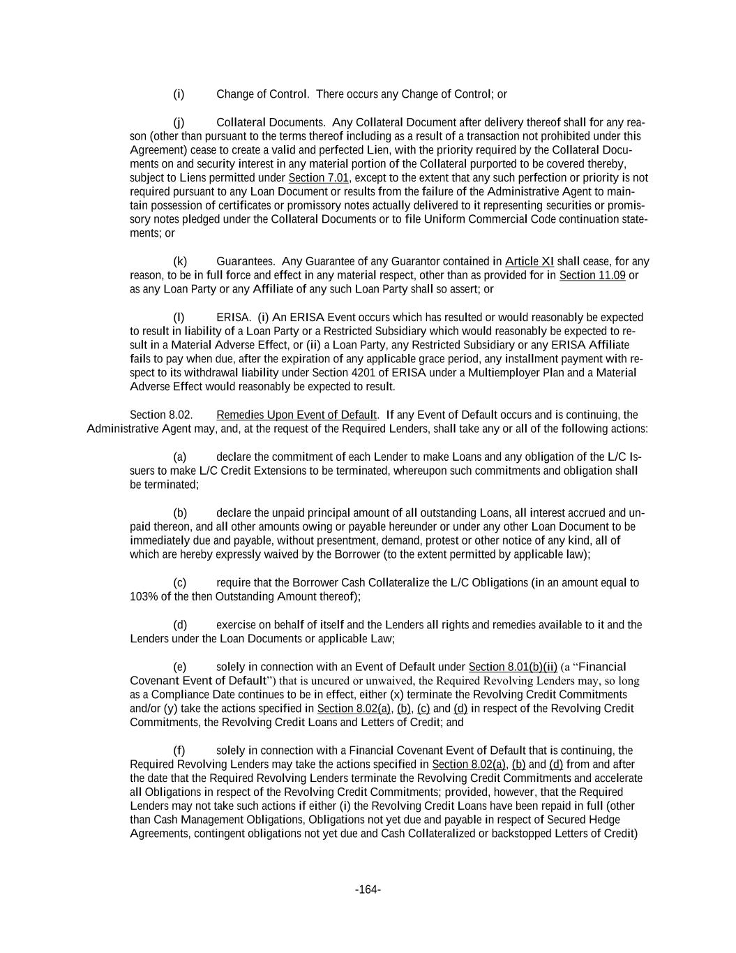 -164- (i) Change of Control. There occurs any Change of Control; or (j) Collateral Documents. Any Collateral Document after delivery thereof shall for any rea- son (other than pursuant to the terms thereof including as a result of a transaction not prohibited under this Agreement) cease to create a valid and perfected Lien, with the priority required by the Collateral Docu- ments on and security interest in any material portion of the Collateral purported to be covered thereby, subject to Liens permitted under Section 7.01, except to the extent that any such perfection or priority is not required pursuant to any Loan Document or results from the failure of the Administrative Agent to main- tain possession of certificates or promissory notes actually delivered to it representing securities or promis- sory notes pledged under the Collateral Documents or to file Uniform Commercial Code continuation state- ments; or (k) Guarantees. Any Guarantee of any Guarantor contained in Article XI shall cease, for any reason, to be in full force and effect in any material respect, other than as provided for in Section 11.09 or as any Loan Party or any Affiliate of any such Loan Party shall so assert; or (l) ERISA. (i) An ERISA Event occurs which has resulted or would reasonably be expected to result in liability of a Loan Party or a Restricted Subsidiary which would reasonably be expected to re- sult in a Material Adverse Effect, or (ii) a Loan Party, any Restricted Subsidiary or any ERISA Affiliate fails to pay when due, after the expiration of any applicable grace period, any installment payment with re- spect to its withdrawal liability under Section 4201 of ERISA under a Multiemployer Plan and a Material Adverse Effect would reasonably be expected to result. Section 8.02. Remedies Upon Event of Default. If any Event of Default occurs and is continuing, the Administrative Agent may, and, at the request of the Required Lenders, shall take any or all of the following actions: (a) declare the commitment of each Lender to make Loans and any obligation of the L/C Is- suers to make L/C Credit Extensions to be terminated, whereupon such commitments and obligation shall be terminated; (b) declare the unpaid principal amount of all outstanding Loans, all interest accrued and un- paid thereon, and all other amounts owing or payable hereunder or under any other Loan Document to be immediately due and payable, without presentment, demand, protest or other notice of any kind, all of which are hereby expressly waived by the Borrower (to the extent permitted by applicable law); (c) require that the Borrower Cash Collateralize the L/C Obligations (in an amount equal to 103% of the then Outstanding Amount thereof); (d) exercise on behalf of itself and the Lenders all rights and remedies available to it and the Lenders under the Loan Documents or applicable Law; (e) solely in connection with an Event of Default under Section 8.01(b)(ii) (a “Financial Covenant Event of Default”) that is uncured or unwaived, the Required Revolving Lenders may, so long as a Compliance Date continues to be in effect, either (x) terminate the Revolving Credit Commitments and/or (y) take the actions specified in Section 8.02(a), (b), (c) and (d) in respect of the Revolving Credit Commitments, the Revolving Credit Loans and Letters of Credit; and (f) solely in connection with a Financial Covenant Event of Default that is continuing, the Required Revolving Lenders may take the actions specified in Section 8.02(a), (b) and (d) from and after the date that the Required Revolving Lenders terminate the Revolving Credit Commitments and accelerate all Obligations in respect of the Revolving Credit Commitments; provided, however, that the Required Lenders may not take such actions if either (i) the Revolving Credit Loans have been repaid in full (other than Cash Management Obligations, Obligations not yet due and payable in respect of Secured Hedge Agreements, contingent obligations not yet due and Cash Collateralized or backstopped Letters of Credit)
