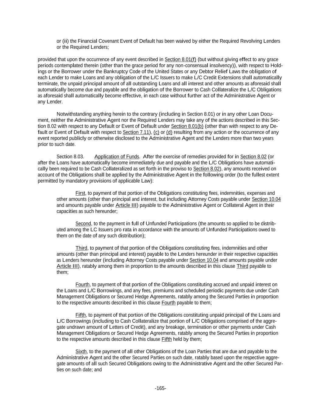 -165- or (ii) the Financial Covenant Event of Default has been waived by either the Required Revolving Lenders or the Required Lenders; provided that upon the occurrence of any event described in Section 8.01(f) (but without giving effect to any grace periods contemplated therein (other than the grace period for any non-consensual insolvency)), with respect to Hold- ings or the Borrower under the Bankruptcy Code of the United States or any Debtor Relief Laws the obligation of each Lender to make Loans and any obligation of the L/C Issuers to make L/C Credit Extensions shall automatically terminate, the unpaid principal amount of all outstanding Loans and all interest and other amounts as aforesaid shall automatically become due and payable and the obligation of the Borrower to Cash Collateralize the L/C Obligations as aforesaid shall automatically become effective, in each case without further act of the Administrative Agent or any Lender. Notwithstanding anything herein to the contrary (including in Section 8.01) or in any other Loan Docu- ment, neither the Administrative Agent nor the Required Lenders may take any of the actions described in this Sec- tion 8.02 with respect to any Default or Event of Default under Section 8.01(b) (other than with respect to any De- fault or Event of Default with respect to Section 7.11), (c) or (d) resulting from any action or the occurrence of any event reported publicly or otherwise disclosed to the Administrative Agent and the Lenders more than two years prior to such date. Section 8.03. Application of Funds. After the exercise of remedies provided for in Section 8.02 (or after the Loans have automatically become immediately due and payable and the L/C Obligations have automati- cally been required to be Cash Collateralized as set forth in the proviso to Section 8.02), any amounts received on account of the Obligations shall be applied by the Administrative Agent in the following order (to the fullest extent permitted by mandatory provisions of applicable Law): First, to payment of that portion of the Obligations constituting fees, indemnities, expenses and other amounts (other than principal and interest, but including Attorney Costs payable under Section 10.04 and amounts payable under Article III) payable to the Administrative Agent or Collateral Agent in their capacities as such hereunder; Second, to the payment in full of Unfunded Participations (the amounts so applied to be distrib- uted among the LC Issuers pro rata in accordance with the amounts of Unfunded Participations owed to them on the date of any such distribution); Third, to payment of that portion of the Obligations constituting fees, indemnities and other amounts (other than principal and interest) payable to the Lenders hereunder in their respective capacities as Lenders hereunder (including Attorney Costs payable under Section 10.04 and amounts payable under Article III), ratably among them in proportion to the amounts described in this clause Third payable to them; Fourth, to payment of that portion of the Obligations constituting accrued and unpaid interest on the Loans and L/C Borrowings, and any fees, premiums and scheduled periodic payments due under Cash Management Obligations or Secured Hedge Agreements, ratably among the Secured Parties in proportion to the respective amounts described in this clause Fourth payable to them; Fifth, to payment of that portion of the Obligations constituting unpaid principal of the Loans and L/C Borrowings (including to Cash Collateralize that portion of L/C Obligations comprised of the aggre- gate undrawn amount of Letters of Credit), and any breakage, termination or other payments under Cash Management Obligations or Secured Hedge Agreements, ratably among the Secured Parties in proportion to the respective amounts described in this clause Fifth held by them; Sixth, to the payment of all other Obligations of the Loan Parties that are due and payable to the Administrative Agent and the other Secured Parties on such date, ratably based upon the respective aggre- gate amounts of all such Secured Obligations owing to the Administrative Agent and the other Secured Par- ties on such date; and